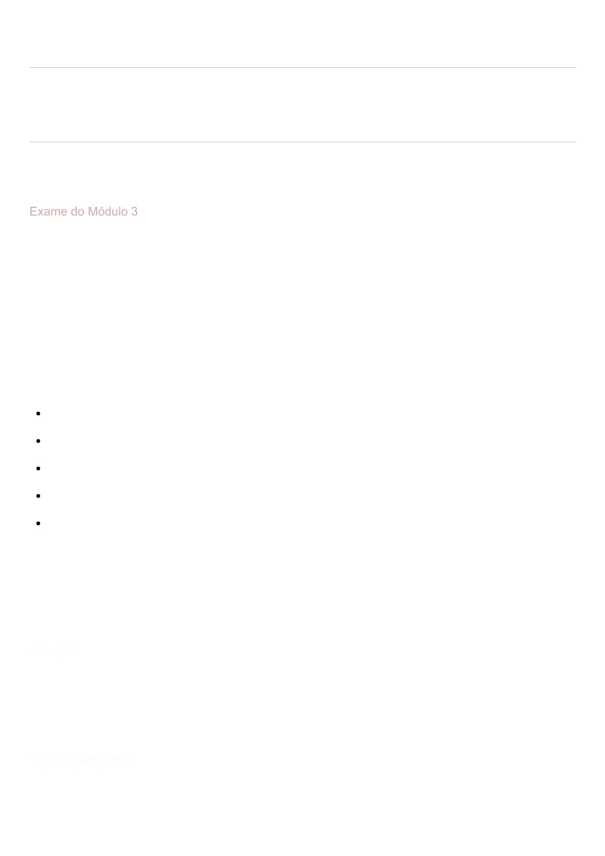 14/05/22, 19:30 Exame do Módulo 3: Curso gratuito: Liderança e Empreendedorismo https://uva.instructure.com/courses/27631/quizzes/5150 1/15 Exame do Módulo 3 Entrega 31 mai em 23:59 Pontos 100 Perguntas 25 Disponível até 31 mai em 23:59 Limite de tempo 45 Minutos Tentativas permitidas 5 Instruções Exame do Módulo 3 Para responder o seguinte exame, você deve ter revisado e estudado todos os conteúdos e recursos do módulo. Cada recurso lhe fornecerá ferramentas para poder responder às perguntas. Por isso, deverá prestar a devida atenção a cada um deles: Vídeos Esquema conceitual Leituras Fórum Vídeos de conceitos chaves Este exame tem o objetivo de verificar o avanço de sua aprendizagem e representa uma prática de avaliação formal, a qual lhe outorgará uma qualificação de desempenho. Atenção! Lembramos que você terá somente duas tentativas para a realização do mesmo. Cada tentativa terá um tempo limite de 20 minutos para sua realização. Tipo de perguntas: Cada exame pode conter diversos tipos de perguntas ou ordens: 14/05/22, 19:30 Exame do Módulo 3: Curso gratuito: Liderança e Empreendedorismo https://uva.instructure.com/courses/27631/quizzes/5150 2/15 Histórico de tentativas Tentativa Tempo Pontuação MAIS RECENTE Tentativa 1 16 minutos 100 de 100 Pontuação desta tentativa: 100 de 100 Enviado 4 abr em 18:36 Esta tentativa levou 16 minutos. Verdadeiro-Falso: deve indicar se a proposição pode se considerar verdadeira ou falsa. Você deverá levar em consideração que, se somente um elemento da proposição for falso, deve se considerar falsa em seu conjunto. Múltipla escolha:somente uma das opções é correta.As alternativas estão indicadas com círculos.Você deverá selecionar a alternativa correta marcando o círculo precedente. Resposta múltipla:pode haver mais de uma resposta correta.Você deverá selecionar todas as alternativas que considere corretas, assinalando no quadrado. Será outorgada uma pontuação parcial em caso de não marcar todas as correspondentes. Coincidente:deve vincular duas categorias, selecionando na 1º coluna o conceito que corresponde com a categoria da 2ª coluna. Desejamos que você consiga desenvolver este exame com sucesso! Para começar, você deverá clicar em “Realizar Evaluación”, uma vez respondidas as perguntas, deverá clicar em “Enviar Evaluación”. Fazer o teste novamente 4 / 4 ptsPergunta 1 O ciclo do gerenciamento é desenvolvido da seguinte maneira Projetar, planejar, conduzir e controlar. https://uva.instructure.com/courses/27631/quizzes/5150/history?version=1 https://uva.instructure.com/courses/27631/quizzes/5150/take?user_id=146135 14/05/22, 19:30 Exame do Módulo 3: Curso gratuito: Liderança e Empreendedorismo https://uva.instructure.com/courses/27631/quizzes/5150 3/15 Planejar, organizar, conduzir e controlar. Correto!Correto! Planejar, conduzir, organizar e controlar. Conduzir, organizar, planejar e controlar. Organizar, planejar, conduzir e controlar. 4 / 4 ptsPergunta 2 A missão é: Todas as respostas são corretas. Correto!Correto! o porquê de sua existência. As funções básicas que a empresa realizará ou desempenhará. Determina quem são nossos clientes. A razão de ser da empresa. 4 / 4 ptsPergunta 3 Depois do bloco do segmento de clientes, qual é o próximo no desenvolvimento do Modelo de Canvas? Estrutura de Custos. Atividades-chave. Canal de distribuição. Correto!Correto! Fluxo de receita. 14/05/22, 19:30 Exame do Módulo 3: Curso gratuito: Liderança e Empreendedorismo https://uva.instructure.com/courses/27631/quizzes/5150 4/15 Sócios-chave. 4 / 4 ptsPergunta 4 Um objetivo deve conter as seguintes características: Claro, Flexível, Mensurável, Realista, Coerente, Inspirador, estar no infinitivo. Correto!Correto! Claro, Flexível, Realista, Coerente, Inspirador. Flexível, Mensurável, Realista, Coerente, estar no infinitivo. Claro, Flexível Mensurável. Claro, Mensurável, Coerente, Inspirador. 4 / 4 ptsPergunta 5 O que é negociação? É um processo pelo qual duas ou mais pessoas buscam um objetivo que seja possível de ser efetivado formalmente entre as duas partes. É um Processo pelo qual duas ou mais pessoas estão interessadas em um determinado assunto e que têm como objetivo chegar a um acordo de maneira que se possa efetivar um compromisso formal entre as duas partes e onde cada uma possa obter um benefício. Correto!Correto! 14/05/22, 19:30 Exame do Módulo 3: Curso gratuito: Liderança e Empreendedorismo https://uva.instructure.com/courses/27631/quizzes/5150 5/15 Benefício conquistado por realizar um acordo entre duas ou mais pessoas. É um processo pelo qual uma pessoa interessada em um assunto determinado e que têm como objetivo chegar a um acordo de maneira que se possa efetivar um compromisso formal. É um processo pelo qual duas ou mais pessoas efetivam um compromisso formal entre as duas partes. 4 / 4 ptsPergunta 6 Para o desenvolvimento do modelo de Canvas começa com... A ideia. A proposta de valor. Correto!Correto! O fluxo de receita. O segmento dos clientes. A relação com o cliente. 4 / 4 ptsPergunta 7 A negociação integrativa se caracteriza por Ganhar – ganhar. Correto!Correto! 14/05/22, 19:30 Exame do Módulo 3: Curso gratuito: Liderança e Empreendedorismo https://uva.instructure.com/courses/27631/quizzes/5150 6/15 Ganhar - perder. Conseguir um resultado satisfatório para as duas partes. Ter uma posição das duas partes Todas as respostas são corretas. 4 / 4 ptsPergunta 8 Quais são as condições necessárias para tomar uma decisão? Certeza, decisão, incertezas. Certeza, risco, incertezas. Correto!Correto! Todas as respostas são corretas. Decisão, risco, incertezas. Certeza, riscos, desconhecimento. 4 / 4 ptsPergunta 9 O modelo de geração de negócios Canvas tem como base a apresentação de nove blocos temáticos, cobrindo as principais áreas de abrangência do negócio, sendo que sua perspectiva visual facilita a