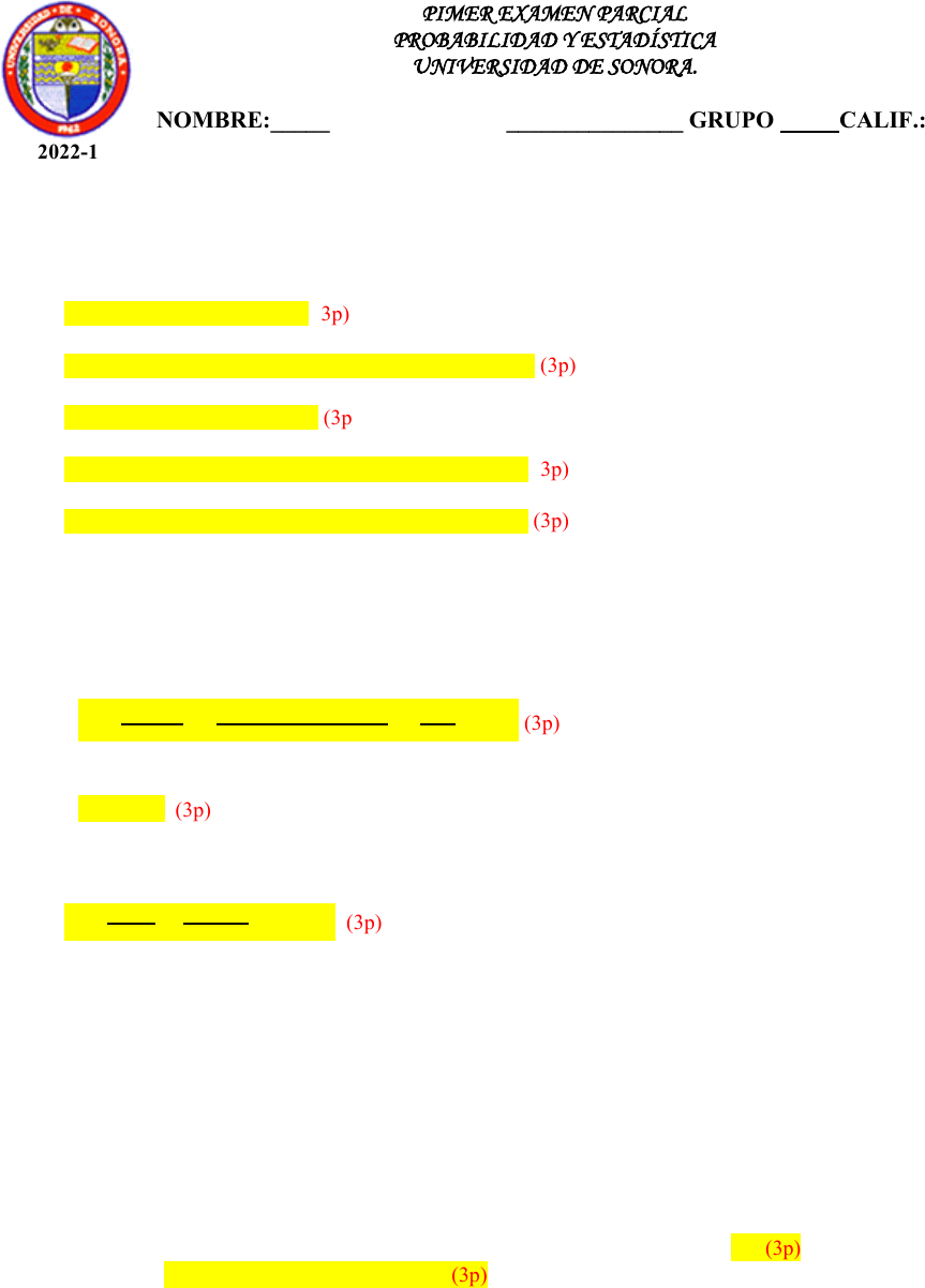 2022-1 PIMER EXAMEN PARCIAL PROBABILIDAD Y ESTADÍSTICA UNIVERSIDAD DE SONORA. NOMBRE:___________________________________ GRUPO ____ CALIF.: 1. Clasifique las siguientes características, es decir, diga si las variables son Cualitativas ó Cuantitativas (Discretas ó Continuas) y determine su nivel de medición (Nominal, Ordinal, Intervalo o Razón) a. El puesto que ocupa en una empresa un egresado del área de Ingeniería. Variable Cualitativa Ordinal (3p) b. El tiempo que le dedica una persona para autorizar un proyecto. Variable Cuantitativa Continua de Razón o Proporción (3p) c. Determinar la estación de radios de preferencia de una persona. Variable Cualitativa Nominal (3p) d. La numeración correspondiente de las casas de una población determinada. Variable Cuantitativa Discreta de Razón o Proporción (3p) e. El volumen de ventas de televisores de una empresa. Variable Cuantitativa Discreta de Razón o Proporción (3p) 2. Un fabricante de neumáticos quiere determinar el diámetro interior de cierto grado de neumático. Idealmente el diámetro sería 570 mm. Se tomó una muestra aleatoria de 10 neumáticos y los diámetros interiores resultantes fueron: 567, 568, 569, 569,569, 570, 571, 572, 572, 573 a. ¿Cuál es el diámetro interior promedio de los neumáticos? �̅� = ∑ 𝑐𝑖𝑓𝑖 𝑘 𝑖=1 𝑛 = 567∗1+568∗1+⋯+573∗2 10 = 5700 10 = 570 (3p) b. ¿Cuál el diámetro común de los neumáticos?, �̂� = 𝟓𝟔𝟗 (3p) c. ¿Cuál es la mediana? �̃� = 𝒙𝟓+ 𝒙𝟔 𝟐 = 𝟓𝟔𝟗+𝟓𝟕𝟎 𝟐 = 𝟓𝟔𝟗. 𝟓 (3p) 3. Los siguientes datos son el número de accidentes automovilísticos que ocurren en los 60 cruces más transitados en la ciudad de Hermosillo en un fin de semana del mes de diciembre del año pasado. 0 0 0 0 0 0 0 0 0 0 0 0 0 0 0 1 1 1 1 1 1 1 1 1 1 1 1 2 2 2 2 2 2 2 2 2 2 2 2 2 3 3 3 3 3 3 3 4 4 4 4 4 4 5 5 5 5 5 6 6 a. Presente la información muestral en una tabla estadística. ¿Usted que opina es necesario hacer una agrupación de la información mediante intervalos de clase?, NO(3p) justifique su respuesta. Sólo existen 7 clases dictintas (3p) Probabilidad y estadística Variables Clases Frecuencia Frecuencia Relativa (%) Frecuencia Acumulada Frecuencia Relativa Acumulada (%) 0 15 25.00 15 25.00 1 12 20.00 27 45.00 2 13 21.67 40 66.67 3 7 11.67 47 78.33 4 6 10.00 53 88.33 5 5 8.33 58 96.67 6 2 3.33 60 100.00 60 (10p) b. Calcule la Media: �̅� = ∑ 𝑐𝑖𝑓𝑖 𝑘 𝑖=1 𝑛 = (0∗15)+(1∗12)+(2∗13)+(3∗7)+(4∗6)+(5∗5)+(6∗2) 60 = 120 60 = 2 (3p) Mediana: �̃� = 𝒙𝟑𝟎+ 𝒙𝟑𝟏 𝟐 = 𝟐+𝟐 𝟐 = 𝟐 (3p) Moda: �̂� = 𝟎 (3p) Varianza: 𝑆2 = ∑ (𝑐𝑖−�̅�) 2𝑓𝑖 𝑘 𝑖=1 𝑛−1 = (0−2)2∗15+ (1−2)2∗12+⋯+(5−2)2∗5+(6−2)2∗2 60−1 = 180 59 = 3.05 (3p) Desviación Media: 𝐷𝑀 = ∑ |𝑐𝑖−�̅�|𝑓𝑖 𝑘 𝑖=1 𝑛 = |0−2|∗15+|1−2|∗12+⋯.+|6−2|∗2 60 = 84 60 = 1.4 (3p) c. Calcule los cuartiles. k (𝒏)(𝒌) 𝟒 Posición de 𝑸𝒌 Valor de 𝑸𝒌 1 (𝟔𝟎)(𝟏) 𝟒 = 𝟏𝟓 𝑸𝟏 = 𝒙𝟏𝟓.𝟓 𝑸𝟏 = 𝑥15 + 𝑥16 𝟐 = 𝟎 + 𝟏 𝟐 = 𝟎. 𝟓 2 (𝟔𝟎)(𝟐) 𝟒 = 𝟑𝟎 𝑸𝟐 = 𝒙𝟑𝟎.𝟓 𝑸𝟐 = 𝑥30 + 𝑥31 𝟐 = 𝟐 + 𝟐 𝟐 = 𝟐 = �̃� 3 (𝟔𝟎)(𝟑) 𝟒 = 𝟒𝟓 𝒙𝟒𝟓.𝟓 𝑸𝟑 = 𝑥45+ 𝑥46 𝟐 = 𝟑+𝟑 𝟐 = 𝟑 (9p) d. Confeccione un histograma de frecuencias relativas (5p) 15 12 13 7 6 5 2 0 5 10 15 20 0 1 2 3 4 5 6 Histigrama de Frecuencia e. una ojiva porcentual. Comente sobre el sesgo de la distribución. (5p) Sesgo es aparentemente positivo (3p) 4. Las calderas de unas plantas de energía de vapor a alta presión tuvieron las siguientes deficiencias en porcentajes: 88.9 89.0 89.2 89.2 89.3 89.4 89.7 89.7 89.7 89.8 89.8 89.8 89.9 89.9 89.9 90.0 90.0 90.1 90.1 90.2 90.2 90.2 90.3 90.3 90.3 90.4 90.4 90.4 90.4 90.4 90.4 90.5 90.5 90.5 90.5 90.5 90.5 90.6 90.6 90.6 90.6 90.6 90.6 90.7 90.8 90.8 90.8 90.8 90.8 90.8 90.8 90.8 90.8 90.9 90.9 90.9 91.0 91.0 91.0 92.0 92.0 92.0 92.0 92.0 92.0 92.0 92.4 92.4 92.4 92.4 92.4 92.4 92.5 92.6 92.6 92.7 92.7 92.9 92.9 93.1 a. Aplique la regla de Sturges y agrupe los datos anteriores; Calculamos el valor de 1 + 3.3log(80) = 7.28.., por lo tanto el número de intervalos es k = 7 (3p) Determinamos el Rango: R = M – m = 93.1-88.9 = 4.2 Posteriormente determinamos la longitud de cada intervalo, la cual se define como 𝒍 = 𝑹 𝒌 = 𝟒.𝟐 𝟕 = 𝟎. 𝟔 (3p) b. Construya un polígono de frecuencias y comente sobre el sesgo; (5p) 25.00 45.00 66.67 78.33 88.33 96.67 100.00 0.00 20.00 40.00 60.00 80.00 100.00 120.00 0 1 2 3 4 5 6 7 OJIVA PORCENTUAL (%) 6 13 25 15 0 14 7 0 5 10 15 20 25 30 89 90 91 92 93 POLÍGONO DE FRECUENCIAS Aparentemente el sesgo es positivo (3p) c. Con los datos agrupados, calcule la Media �̅� = ∑ 𝑚𝑖𝑓𝑖 𝑘 𝑖=1 𝑛 = 89.2∗6+89.8∗13+90.4∗25+⋯+92.8∗7 80 = 7268 80 = 90.85 (3p) Mediana Primeramente, debemos de identificar el intervalo en el que se encuentra la mediana, el cual es (𝐿𝑚−1, 𝐿𝑚] = (90.1, 90.7] , el valor de la mediana es: �̃� = 𝐿𝑚−1 + [ 𝑛 2 −𝑭𝒎−𝟏 𝑓𝑚 ] 𝑙𝑚 = 90.1 + [ 40−19 25 ] (0.6) = 90.1 + 0.504 = 90.604 (3p) Moda Primeramente, identificamos el intervalo en el que se encuentra la moda, que es el de mayor frecuencia: (𝐿𝑚−1, 𝐿𝑚] = (90.1, 90.7, el valor de la moda es: �̂� = 𝐿𝑚−1 + [ (𝑓𝑚 − 𝑓𝑚−1) 𝑓𝑚 − 𝑓𝑚−1) + 𝑓𝑚 − 𝑓𝑚+1) ] 𝑙𝑚 = 90.1 + [ (25 − 13) (25 − 13) + (25 − 15) ] (0.6) �̂� = 90.1 + [ 12 12+10 ] (0.6) = 90.1 + 0.32 = 90.42 (3p) Varianza 𝑆2 = ∑ (𝑚𝑖 − �̅�) 2𝑓𝑘 𝑘 𝑖=1 𝑛 − 1 = (89.2 − 80.85)2 ∗ 6 + (89.8 − 80.85)2 ∗ 13 + (90.4 − 80.85)2 ∗ 25 + ⋯ … + (92.8 − 80.85)2 ∗ 7 80 − 1 𝑆2 = 88.2 79 = 1.