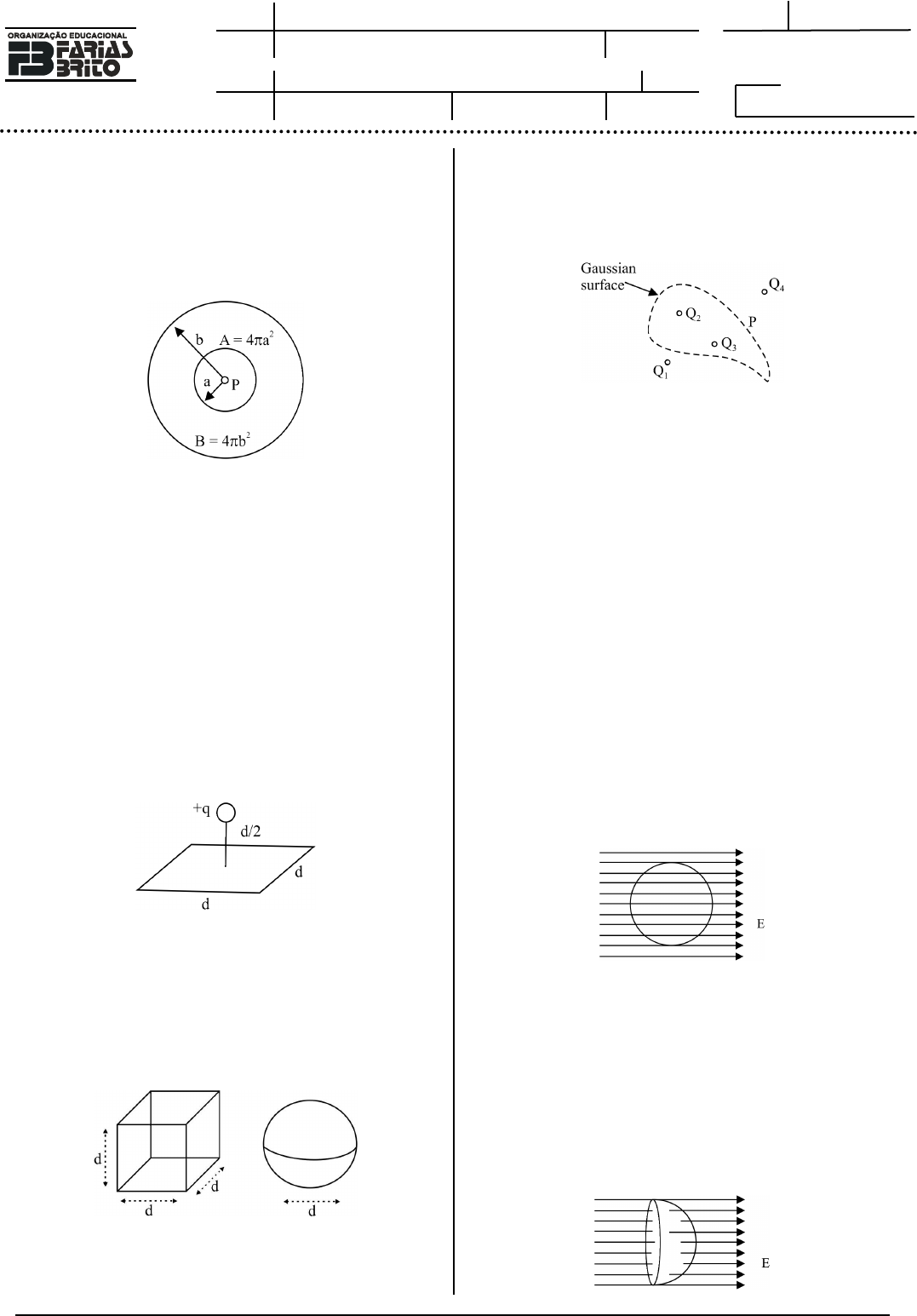 OSG.: 14923/09 ENSINO PRÉ-UNIVERSITÁRIO TC FÍSICA TURNO DATA ALUNO(A) TURMA Nº SÉRIE PROFESSOR(A) MARCOS HAROLDO ITA/IME SEDE ___/___/___ ELETROSTÁTICA 1. (ITA/99) Uma pequena carga pontual P é mostrada na figura abaixo com duas superfícies gaussianas A e B, de raios a e b = 2a, respectivamente. Sobre o fluxo do campo elétrico que passa pelas superfícies de áreas A e B, pode-se concluir que: a) o fluxo elétrico que atravessa a área B é duas vezes maior que fluxo elétrico que passa pela área A. b) o fluxo elétrico que atravessa a área B é a metade do fluxo elétrico que passa pela área A. c) o fluxo elétrico que atravessa a área B é 1/4 do fluxo elétrico que passa pela área A. d) o fluxo elétrico que atravessa a área B é quatro vezes maior que fluxo elétrico que passa pela área A. e) o fluxo elétrico que atravessa a área B é igual ao fluxo elétrico que passa pela área A. 2. Uma carga pontual +q está a uma distância d/2 de uma superfície quadrada de lado d e encontra-se diretamente acima do centro do quadrado, como é mostrado na figura. Se a permissividade elétrica do meio vale ε, determinar o fluxo elétrico que passa através do quadrado. 3. (Princeton Review) The figure below shows two Gaussian surfaces: a cube with side length d and a sphere with diameter d. The net electric charge enclosed within each surface is the same +Q. If Φc denotes the total electric flux through the cubical surface, and Φs denotes the total electric flux through the spherical surface, then which of the following is true? a) Φc = (π/6) ⋅ Φs d) Φc = (3/π) ⋅ Φs b) Φc = (π/3) ⋅ Φs e) Φc = (6/π) ⋅ Φs c) Φc = Φs 4. (Princeton Review) The figure below shows four point charges and the cross section of a Gaussian surface. Which of the following statements is true concerning the situation depicted? a) The net electric flux through the Gaussian surface depends on all four charges shown, but the electric field at point P depends only on charges Q2 and Q3. b) The net electric flux through the Gaussian surface depends only on charges Q2 and Q3, but the electric field at point P depends on all four charges. c) The net electric flux through the Gaussian surface depends only on charges Q2 and Q3 and the electric field point P depends only on charges Q2, Q3 and Q4. d) The net electric flux through the Gaussian surface depends only on charges Q1 and Q4, and the electric field at point P depends only on charges Q2 and Q3. e) Both the net electric flux through the Gaussian surface and the electric field at point p depend on all four charges. 5. Uma esfera neutra de raio R encontra-se imersa num campo elétrico uniforme de intensidade E. Pede-se determinar: a) o fluxo elétrico total através da esfera. b) o fluxo que entra na esfera. c) o fluxo que sai da esfera. 6. Cortando-se uma casca esférica de raio R ao meio, obtemos uma casca hemisférica. A figura mostra uma dessas cascas, imersas num campo elétrico uniforme de intensidade E normal à sua secção meridiana. Determine o fluxo do campo elétrico E através dessa superfície hemisférica. TC – FÍSICA 2 OSG.: 14923/09 7. A figura mostra uma superfície esférica de raio 1m imersa num meio de permissividade ε = 8,85 ⋅ 10–12(SI). Em seu interior encontram-se duas cargas q1, de intensidade + 1 ⋅ 10–10C, e q3 desconhecida. Sabe-se que o fluxo elétrico total através da superfície esférica vale Φ = +10 N ⋅ m2/C. Pergunta-se. a) Qual o valor da carga q3? b) O que se pode afirmar sobre a carga q2? c) Retirando a carga q2 do sistema e levando as cargas q1 e q3 para o centro da esfera, o fluxo elétrico através da sua superfície aumenta ou diminui? Quanto valerá o campo elétrico E sobre essa superfície? d) Mantendo q2 fora do sistema, envolve-se a superfície esférica por um cubo de aresta a = 3m, cujo centro coincide com o centro da esfera. Quanto vale o fluxo elétrico através desse cubo? Usando a Lei de Gauss, é possível determinar o campo elétrico na superfície desse cubo? Justifique. 8. (Princeton Review) A non conducting sphere of radius R contains a total charge of –Q distributed uniformly throughout its volume (that is, the volume charge density, p, is constant). The magnitude of the electric field at point P, at a distance r < R from the sphere’s center, is equal to: a) 3 1 Q r 4 R ⋅ ⋅ πε b) 2 2 1 Q r 4 R ⋅ ⋅ πε c) 3 3 1 Q r 4 R ⋅ ⋅ πε d) 2 1 Q 4 r ⋅ πε 9. (Princeton Review) Consider a spherical shell with a uniform surface charge density p. If the radius of the shell is doubled while holding the charge density constant, what effect does this have on the magnitude of the electric field just outside the shell? a) The electric field decreases by a factor of 4. b) The electric field decreases by a factor of 2. c) The electric field remains the same. d) The electric field increases by a factor of 2. e) The electric field increases by a factor of 4. GABARITO – LEI DE GAUSS 1. E 2. q 6⋅ ε 3. C 4. B 5. a) 0 b) –π ⋅ R2 ⋅ E c) +π ⋅ R2 ⋅ E 6. +π ⋅ R2 ⋅ E 7. a) 1,15 ⋅ 10–11C b) nada c) não varia, E = 0,796N/C d) Φ = 10, não, pois o campo sobre a sua superfície não é constante. 8. A 9. D FM – 04/03/09 Rev.: MH
