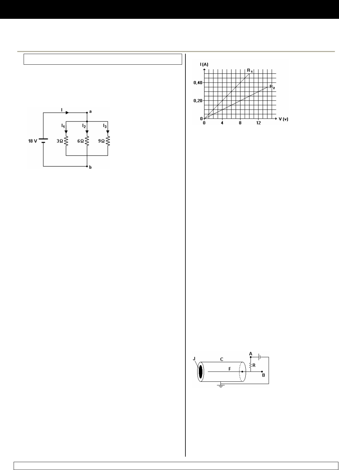Exercícios Complementares de Eletrodinâmica - Prof. Marco Aurélio Pingüim Página 1 de 14 Eletrodinâmica – Lista 1 Primeira Lei de OhmPrimeira Lei de OhmPrimeira Lei de OhmPrimeira Lei de Ohm 1111. (Unesp 2003) As instalações elétricas em nossas casas são projetadas de forma que os aparelhos sejam sempre conectados em paralelo. Dessa maneira, cada aparelho opera de forma independente.A figura mostra três resistores conectados em paralelo. Desprezando-se as resistências dos fios de ligação, o valor da corrente em cada resistor é a) I, = 3 A, I‚ = 6 A e Iƒ = 9 A. b) I, = 6 A, I‚ = 3 A e Iƒ = 2 A. c) I, = 6 A, I‚ = 6 A e Iƒ = 6 A. d) I, = 9 A, I‚ = 6 A e Iƒ = 3 A. e) I, = 15 A, I‚ = 12 A e Iƒ = 9 A. 2222. (Ufpe 2000) Alguns cabos elétricos são feitos de vários fios finos trançados e recobertos com um isolante. Um certo cabo tem 150 fios e a corrente total transmitida pelo cabo é de 0,75A quando a diferença de potencial é 220V. Qual é a resistência de cada fio individualmente, em k²? 3333. (Unb 2000) Suponha que uma pessoa em Brasília, na época da seca, aproxime sua mão de uma carro cuja carroceria apresenta uma diferença de potencial de 10.000V com relação ao solo. No instante em que a mão estiver suficientemente próxima ao carro, fluirá uma corrente que passará pelo ar, pelo corpo da pessoa e, através do seu pé, atingirá o solo. Sabendo que a resistência do corpo da pessoa, no percurso da corrente elétrica, é de 2.000² e que uma corrente de 300mA causará a sua morte, calcule, em k², a resistência mínima que o ar deve ter para que a descarga não mate essa pessoa. Despreze a parte fracionária de seu resultado, caso exista. 4444. (Unesp) Os gráficos na figura a seguir mostram o comportamento da corrente em dois resistores, R, e R‚, em função da tensão aplicada. a) Considere uma associação em série desses dois resistores, ligada a uma bateria. Se a tensão no resistor R, for igual a 4V, qual será o valor da tensão de R‚? b) Considere, agora, uma associação em paralelo desses dois resistores, ligada a uma bateria. Se a corrente que passa pelo resistor R, for igual a 0,30A, qual será o valor da corrente por R‚? 5555. (Unicamp 2004) Quando o alumínio é produzido a partir da bauxita, o gasto de energia para produzi-lo é de 15 kWh/kg. Já para o alumínio reciclado a partir de latinhas, o gasto de energia é de apenas 5% do gasto a partir da bauxita. a) Em uma dada cidade, 50.000 latinhas são recicladas por dia. Quanto de energia elétrica é poupada nessa cidade (em kWh)? Considere que a massa de cada latinha é de 16 g. b) Um forno de redução de alumínio produz 400 kg do metal, a partir da bauxita, em um período de 10 horas. A cuba eletrolítica desse forno é alimentada com uma tensão de 40 V. Qual a corrente que alimenta a cuba durante a produção? Despreze as perdas. 6666. (Ufc 2002) Um pássaro pousa em um dos fios de uma linha de transmissão de energia elétrica. O fio conduz uma corrente elétrica i = 1.000 A e sua resistência, por unidade de comprimento, é de 5,0 × 10−¦ ²/m. A distância que separa os pés do pássaro, ao longo do fio, é de 6,0 cm. A diferença de potencial, em milivolts (mV), entre os seus pés é: a) 1,0 b) 2,0 c) 3,0 d) 4,0 e) 5,0 7777.... (Fuvest 2003) A figura representa uma câmara fechada C, de parede cilíndrica de material condutor, ligada à terra. Em uma de suas extremidades, há uma película J, de pequena espessura, que pode ser atravessada por partículas. Coincidente com o eixo da câmara, há um fio condutor F mantido em potencial positivo em relação à terra. O cilindro está preenchido com um gás de tal forma que partículas alfa, que penetram em C, através de J, colidem com moléculas do gás podendo arrancar elétrons das mesmas. Neste processo, Exercícios de Física – Pingüim 2006 P in gü im Exercícios Complementares de Eletrodinâmica - Prof. Marco Aurélio Pingüim Página 2 de 14 são formados íons positivos e igual número de elétrons livres que se dirigem, respectivamente, para C e para F. O número de pares elétron-ion formados é proporcional à energia depositada na câmara pelas partículas alfa, sendo que para cada 30eV de energia perdida por uma partícula alfa, um par é criado. Analise a situação em que um número n = 2 × 10¥ partículas alfa, cada uma com energia cinética igual a 4,5MeV, penetram em C, a cada segundo, e lá perdem toda a sua energia cinética. Considerando que apenas essas partículas criam os pares elétron-ion, determine a) o número N de elétrons livres produzidos na câmara C a cada segundo. b) a diferença de potencial V entre os pontos A e B da figura, sendo a resistência R = 5 × 10¨². NOTE/ADOTE 1) A carga de um elétron é e = - 1,6 × 10−¢ªC 2) elétron-volt (eV) é uma unidade de energia 3) 1MeV = 10§ eV GABARITOGABARITOGABARITOGABARITO ---- Primeira Lei de Ohm Primeira Lei de Ohm Primeira Lei de Ohm Primeira Lei de Ohm 1111. [B] 2.2.2.2. 44 3333. 31 4444. a) 8 V b) 0,15 A 5555. a) 1,14.10¥kWh b) 15 kA 6666. [C] 7777. a) - O número de partículas ‘ que penetram em C é, de acordo com o enunciado: n = 2 . 10¥ A energia associada a cada partícula é: ”‘=4,5 . 10§eV A energia total transferida as moléculas do gás contido em C tem, por isso, valor: ”T = n . ”‘ = 9 . 10¢¡eV Logo: 30 eV _____ 1 par 9 . 10¢¡ eV _____ x, então, x = 3 . 10ªpares Portanto: N = 3 . 10ª elétrons livres b) A corrente elétrica, i, no resistor é: i = N . | e |/Ðt=3 . 10ª . 1,6 . 10−¢ª/1=4,8 . 10−¢¡A Sendo R = U/i, deduzimos que UÛ½ = RÛ½ . iÛ½ Portanto: UÛ½ = 5 . 10¨ . 4,8 . 10−¢¡ = 0,024V Segunda Lei de OhmSegunda Lei de OhmSegunda Lei de OhmSegunda Lei de Ohm 1111. (Fuvest 2003) Uma lâmpada L está ligada a uma bateria B por 2 fios, F, e F‚, de mesmo material, de comprimentos iguais e de diâmetros d e 3d, respectivamente. Ligado aos terminais da bateria, há u