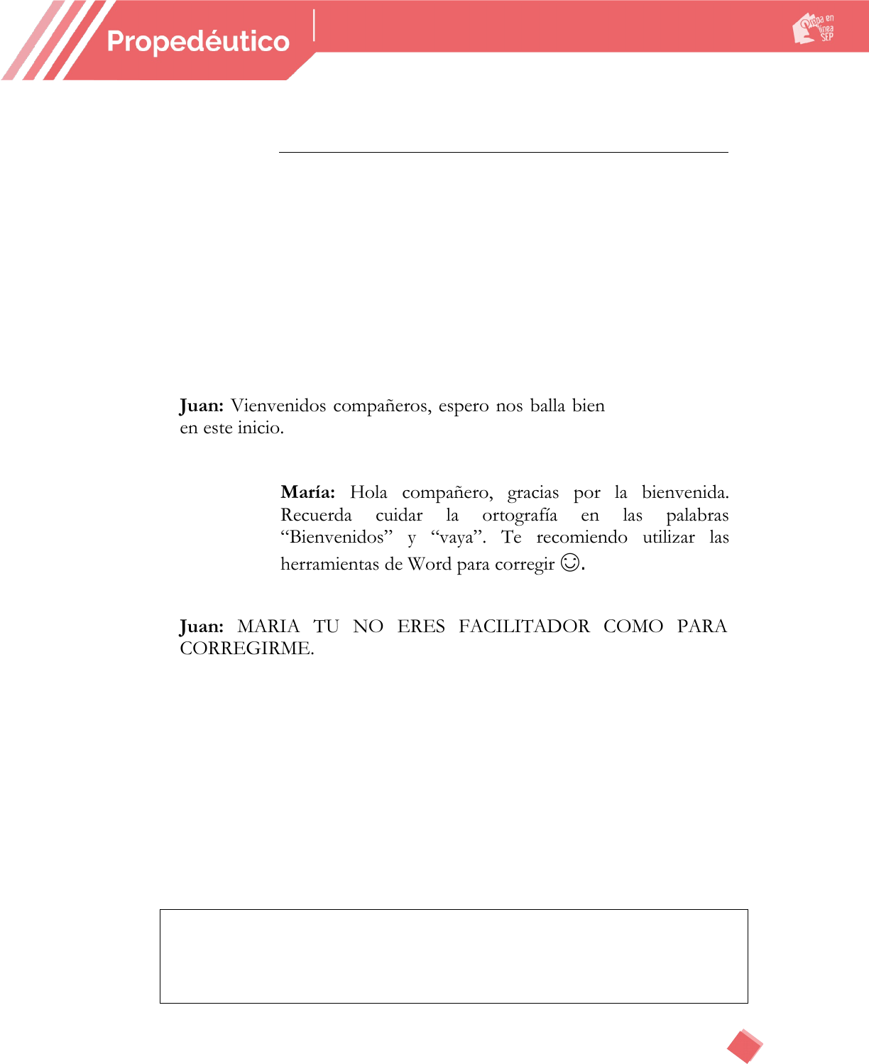Actividad integradora 3 Semana 2 Nombre del aspirante: Sonia Flores Garcia ¿Cómo comunicarse de forma respetuosa en Prepa en Línea-SEP? A continuación, se presenta una serie de situaciones que se relacionan con las formas de comunicarse en la plataforma de Prepa en Línea-SEP. Lee y analiza cada uno: Caso 1. Comunicación entre estudiantes en los foros. Juan: Vienvenidos compañeros, espero nos balla bien en este inicio. María: Hola compañero, gracias por la bienvenida. Recuerda cuidar la ortografía en las palabras “Bienvenidos” y “vaya”. Te recomiendo utilizar las herramientas de Word para corregir 😊. Juan: MARIA TU NO ERES FACILITADOR COMO PARA CORREGIRME. 1. Reflexiona en qué momento se pierde la tolerancia y el respeto, y cómo actuarías en caso de ser Juan o María. A partir de lo anterior responde las preguntas: ¿Qué percibiste en esta conversación? ¿Qué harías tú en el caso de Juan? Si fueras María, ¿cómo responderías al último mensaje de Juan? 1.- Percibo que Juan tiene poca tolerancia a ser rectificado. 2.- Agradecería la corrección e intentaría mejorar mi ortografía 3.-Saludaria educadamente a Juan y después le diría que todos tenemos derecho de opinar sobre el tema. Caso 2. Comunicación entre estudiante y facilitador por medio del mensajero. Luisa: Hola facilitador, ¿hasta cuándo se le va a ocurrir evaluar mi actividad? Ya se la envié ayer domingo a las 11 de la mañana, de qué se trata!!! Facilitador: Apreciable Luisa. Espero que te encuentres bien. Entiendo tu inquietud por tener pronto tu calificación. No te preocupes, en menos de 72 horas recibirás tu evaluación. Saludos y excelente día. 2. Reflexiona en qué momento se pierde la tolerancia y el respeto, y cómo actuarías en caso de ser Luisa. A partir de lo anterior responde las preguntas: ¿Qué percibiste en esta conversación? ¿Cuál hubiera sido una forma respetuosa de solicitar información? Reescribe el mensaje de Luisa. 1.- Luisa tiene poca tolerancia con el facilitador con la revisión de tareas 2.- Buen día facilitador disculpe que lo moleste, pero me podría mandar la calificación de la actividad que mande ayer. Por su atención, gracias Caso 3. Comunicación entre estudiantes por el correo electrónico. Javi: Hola compañera ya tengo que entregar mi actividad integradora y no tengo tanto tiempo para hacerla. No quiero reprobar, ¿podrías pasarme tu actividad? Lupita: Hola compañero, no te puedo pasar mi actividad, pero te recomiendo los recursos que yo consulté para realizarla y que te comuniques con nuestro facilitador. 3. A partir del caso anterior, reflexiona en el actuar de cada estudiante, y responde: ¿Qué percibiste en esta conversación? ¿Qué harías tú en el caso de Javi? ¿Qué consecuencias habría si Lupita le pasara su actividad a Javi? 1.- Javi no quiere hacer la tarea y quiere que se la pasen. 2.- tratar de hacer la tarea y si tuviera duda preguntaría a mis compañeros. 3.- Javi no aprendería y presentaría una tarea que el no hizo. 4. Reflexiona y responde: ¿Por qué es importante mantener una comunicación respetuosa en los foros, el mensajero, la plataforma y el correo electrónico? 1.- Para tener una mejor comunicación académica. ¿Qué sucede cuando la comunicación no es respetuosa o se transgrede la netiqueta? 1.- No nos sentimos a gusto con los compañeros que no respetan las reglas de comunicación del aula y los foros. 4 4