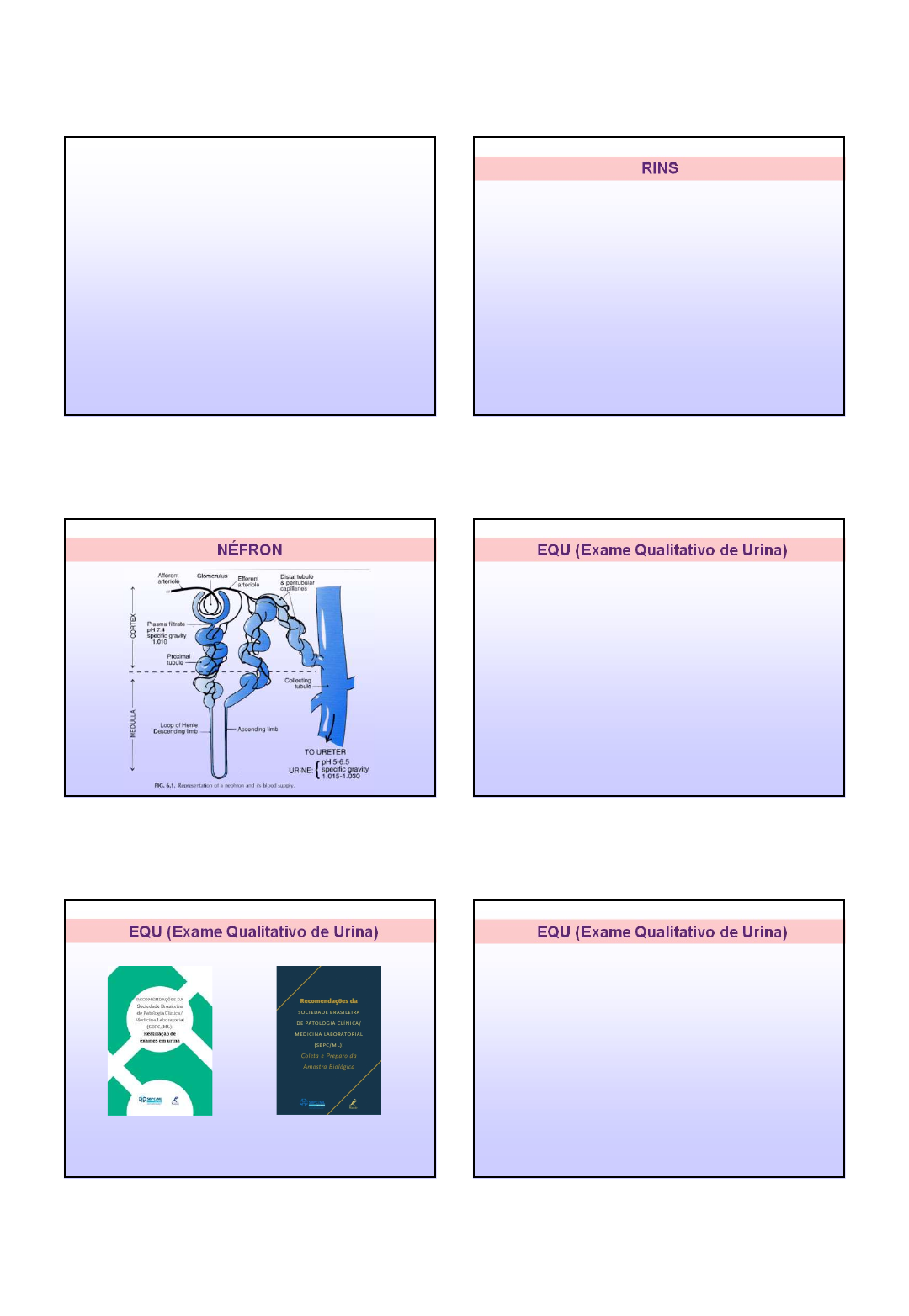 1 Universidade Federal de Santa Maria Centro de Ciências da Saúde Departamento de Análises Clínicas e Toxicológicas Bioquímica Clínica I URINÁLISE Prof. Dr. Rafael Noal Moresco 2022 RINS • Órgãos pares localizados no espaço retroperitoneal. • Cada rim apresenta cerca de 1 a 1,5 milhão de néfrons, que estão localizados principalmente no córtex renal. • Principais funções: - Excretora - Reguladora - Endócrina NÉFRON EQU (Exame Qualitativo de Urina) • Também conhecido por: - EAS (Elementos Anormais e Sedimento) - ECU (Exame Comum de Urina) - PEAS (Pesquisa dos Elementos Anormais e Sedimento) - Urina de Rotina - Sumário de Urina - Urina do Tipo 1 • ABNT NBR 15268:2005 - Requisitos e recomendações para exame de urina • Recomendações da SBPC/ML: Realização de Exames em urina EQU (Exame Qualitativo de Urina) http://www.bibliotecasbpc.org.br/?P=4&ID=&C=0.2 EQU (Exame Qualitativo de Urina) • Exame laboratorial realizado para: - auxiliar no diagnóstico de doenças; - realizar a triagem de uma população para constatar a presença de doenças assintomáticas, congênitas, hereditárias e de origem renal; - monitorar o curso de uma doença; - monitorar a eficácia ou complicações resultantes de terapias. 2 EQU (Exame Qualitativo de Urina) • Permite a detecção de doenças em qualquer parte do trato urinário. • Auxilia na investigação de doenças metabólicas ou sistêmicas não relacionadas diretamente ao rim. • Inclui a verificação da cor e do aspecto da amostra, determinação do pH e densidade, pesquisa de proteínas, glicose, corpos cetônicos, urobilinogênio, bilirrubina, sangue, nitrito e estearase leucocitária. • Também é realizada a sedimentoscopia. EQU (Exame Qualitativo de Urina) • Os genitais devem ser limpos com água e sabão antes da coleta. • Recomenda-se a primeira urina da manhã (mais concentrada). • Deve-se desprezar o primeiro jato e recolher o jato médio. • O recipiente utilizado para colheita deve ser descartável. • A análise da urina deve ser realizada em até 4 horas após a coleta. • Caso haja impossibilidade de realizar a análise dentro deste prazo, a amostra deve ser refrigerada à temperatura de 2°C a 8°C. • Período menstrual: recomenda-se a coleta após 5 dias do término do sangramento menstrual. Colheita da amostra de urina: informações gerais EQU (Exame Qualitativo de Urina) Recomendações da SBPC/ML: Coleta e Preparo da Amostra Biológica Orientações para pacientes do sexo masculino EQU (Exame Qualitativo de Urina) Recomendações da SBPC/ML: Coleta e Preparo da Amostra Biológica Orientações para pacientes do sexo feminino EQU (Exame Qualitativo de Urina) Recomendações da SBPC/ML: Coleta e Preparo da Amostra Biológica Orientações para pacientes do sexo feminino EQU (Exame Qualitativo de Urina) Alguns exemplos ilustrativos para a coleta 3 EQU (Exame Qualitativo de Urina) • Amostra aleatória: pode ser colhida a qualquer hora, dependendo da necessidade do exame e da decisão médica. Também, por decisão médica, pode ser necessária a retenção urinária por um período de tempo antes da coleta para a obtenção de uma amostra específica para análise. • Primeira amostra da manhã: amostra coletada pelo paciente após levantar do leito, desde que respeitado um prazo mínimo de 2 horas de retenção urinária. • Amostra com hora marcada: amostra colhida em um horário específico, conforme solicitação médica. • Amostra de cateter: amostra colhida através de sonda vesical. • Amostra suprapúbica: amostra coletada mediante aspiração da bexiga distendida, através da parede abdominal. Tipos de amostras de urina EQU (Exame Qualitativo de Urina) Tiras reagentes • Sistema analítico simplificado capaz de fornecer rapidamente uma série de parâmetros. • Tira plástica contendo substâncias químicas que revelam o grau de positividade de acordo com a modificação da cor. • Tira múltipla (vários parâmetros) e tira simples (único parâmetro). Exame físico-químico da urina • Vários fatores e constituintes podem alterar a cor da urina, incluindo substâncias ingeridas, atividade física, bem como diversos compostos presentes em estados patológicos. • Indivíduos saudáveis: urina de cor amarelo-citrino a amarelo âmbar fraco. COR Exame físico-químico da urina COR COR VERMELHA: Comum em situações em que ocorre: hematúria, hemoglobinúria, mioglobinúria, icterícias hemolíticas, porfiria e no emprego de fenolftaleína. ATENÇÃO: contaminação menstrual. COR CASTANHA: Frequente no quadro inicial de icterícia, estados febris. COR LARANJA-ESCURO: Característica da eliminação de bilirrubina ou do tratamento realizado com Pyridium. Exame físico-químico da urina COR COR MARRON-ESCURO: Ocorre no carcinoma de bexiga, glomerulonefrire aguda, meta-hemoglobinúria, melanoma maligno, uso de metildopa ou levodopa. COR ESBRANQUIÇADA OU BRANCO LEITOSO: Presente principalmente na lipidúria maciça e nas enfermidades purulentas do trato urinário. COR AZUL-ESVERDEADA: Utilização do azul de Evans ou azul de metileno. Exame físico-químico da urina COR Recomendações da SBPC/ML: Realização de Exames em Urina 4 Exame físico-químico da urina COR Exame físico-químico da urina COR Exame físico-químico da urina ASPECTO • A urina normal geralmente é límpida e transparente. • URINAS ALCALINAS: geralmente apresentam opacidade devido à precipitação de fosfatos amorfos e carbonato. Ácido Acético turvação desaparace • URINAS ÁCIDAS: podem apresentar opacidade na presença de uratos amorfos, cristais de oxalato de cálcio ou de ácido úrico. Aquecimento turvação desaparace Límpida Turva Exame físico-químico da urina ASPECTO A turvação também pode ocorrer pela presença de: • Leucócitos • Hemáceas • Células epiteliais • Bactérias • Leveduras • Lipídeos • Coágulos • Pedaços de tecidos • Contaminação po