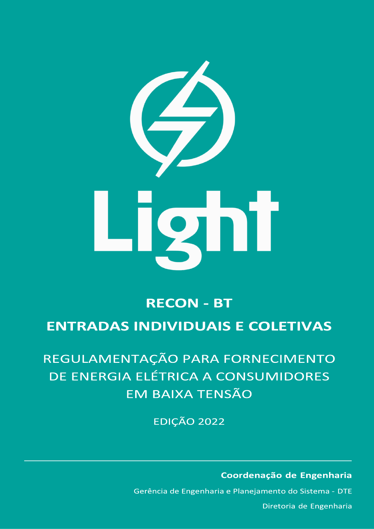 RECON-BT 2022 2 SUMÁRIO GERAL APRESENTAÇÃO ....................................................................................................................... 03 FASCÍCULO 01 – DISPOSITIVOS REGULAMENTARES E NORMAS TÉCNICAS .................................. 04 FASCÍCULO 02 – TERMINOLOGIA E DEFINIÇÕES ........................................................................ 07 FASCÍCULO 03 – SOLICITAÇÃO DE FORNECIMENTO ..................................................................... 17 FASCÍCULO 04 – CONDIÇÕES GERAIS DE FORNECIMENTO .......................................................... 28 FASCÍCULO 05 – MATERIAIS PADRONIZADOS PARA INSTALAÇÃO DE ENTRADA .......................... 41 FASCÍCULO 06 – DETERMINAÇÃO DA CARGA INSTALADA E AVALIAÇÃO DE DEMANDA .............. 71 FASCÍCULO 07 – PADRÃO DE LIGAÇÃO DE ENTRADAS INDIVIDUAIS ........................................... 136 FASCÍCULO 08 – PADRÃO DE LIGAÇÃO DE ENTRADAS COLETIVAS ............................................. 188 FASCÍCULO 09 – SISTEMA DE MEDIÇÃO E LEITURA CENTRALIZADA – SMLC ............................... 221 FASCÍCULO 10 – ATERRAMENTO E DISPOSITIVOS DE PROTEÇÃO ............................................... 234 FASCÍCULO 11 – DESENHOS DE PADRÕES ................................................................................. 251 FASCÍCULO 12 – ANEXOS ......................................................................................................... 347 RECON-BT 2022 3 APRESENTAÇÃO A presente Regulamentação tem por finalidade fixar as condições mínimas para projeto e execução de instalações de entradas individuais e coletivas nas atividades residenciais e não residenciais, com fornecimento de energia elétrica em tensão secundária de distribuição na área de concessão da Light Serviços de Eletricidade S.A. Todas as prescrições técnicas contidas nesta Regulamentação devem ser rigorosamente atendidas, entretanto não dispensam o responsável técnico do necessário conhecimento e amparo na legislação e normas técnicas específicas para instalações, equipamentos e materiais elétricos em baixa tensão. À Light é reservado o direito de, em qualquer tempo, alterar o conteúdo desta Regulamentação, no todo ou em parte, por motivo de ordem técnica ou legal, sendo nesses casos dada ampla divulgação a todos os interessados. Esta Regulamentação cancela e substitui todas as edições anteriores a data de sua publicação e estará disponível na Internet no endereço www.light.com.br e/ou nas agências comerciais da Light. Rio de Janeiro, janeiro de 2022. CONTROLE DE REVISÃO MÊS / ANO DESCRIÇÃO DAS ALTERAÇÕES Janeiro / 2022 Adequação à Resolução nº 1000/2021, da ANEEL FASCÍCULO 02 – Ponto de Entrega FASCÍCULO 03 – itens, 1,2 e 1.8 (notas) FASCÍCULO 04 – itens 1.3.1.1, 1.3.1.3, 1.4 (nota 1 incluída), 1.4.1 (Tabela 4.1 e nota 4) FASCÍCULO 05 – itens 1.2, 1.2.3 e 4 (incluída nota 2) FASCÍCULO 07 – itens 1 (incluída nota 1), 2.2 (tabela), 3.1 (alteração geral), 3.2.1 (incluída nota), 4.2 (parágrafo 6), 5.2 (tabela 7.4 e nota 3), 6 (alteração geral). FASCÍCULO 08 – itens 3 (notas 1 e 2) ESTUDOU/ELABOROU ÓRGÃO André Vinícius Rodrigues Moreira Engº Eletricista | CREA-RJ 2003115749 DTE Diego da Costa Morgado Engº Eletricista | CREA-RJ 2012134995 DTE Jessica Almeida de Souza Engº Eletricista | CREA-RJ 2011123935 DTE Juliana Vieira da Silva Galiza Engº Eletricista | CREA-RJ 2005112117 DTE FASCÍCULO 01 FASCÍCULO O1 DISPOSITIVOS REGULAMENTARES E NORMAS TÉCNICAS RECON – BT EDIÇÃO 2018 FASCÍCULO O1 DISPOSITIVOS REGULAMENTARES E NORMAS TÉCNICAS RECON – BT EDIÇÃO 2022 RECON-BT 2022 5 1. DISPOSITIVOS REGULAMENTARES Devem ser observadas as condições gerais de fornecimento de energia elétrica estabelecidas pela Resolução nº 1000/2021, da ANEEL (Agência Nacional de Energia Elétrica), e consideradas as suas revisões e atualizações. 2. LEIS, DECRETO E RESOLUÇÕES DOS CONSELHOS DE CLASSE Devem ser observadas as disposições referentes às habilitações legais de profissionais e empresas para as atividades de estudo, projeto e execução de instalações de energia elétrica, bem como à obrigatoriedade de recolhimento da ART - Anotação de Responsabilidade Técnica, RRT – Registro de Responsabilidade Técnica ou TRT - Termo de Responsabilidade Técnica atinentes a leis, decretos, resoluções e normas de fiscalização dos Conselhos de Classe, CONFEA/CREA, CAU ou CFT, atualizadas. 3. NORMAS DA ASSOCIAÇÃO BRASILEIRA DE NORMAS TÉCNICAS (ABNT) NBR 5410:2004 – Instalações elétricas de baixa tensão. NBR 15465:2008 – Sistemas de eletrodutos plásticos para instalações elétricas de baixa tensão – Requisitos de desempenho. NBR 15820:2010 – Caixa para medidor de energia elétrica – Requisitos. NBR IEC 60439-1:2003 – Conjuntos de manobra e controle de baixa tensão – Parte 1: Conjuntos com ensaio de tipo totalmente testados (TTA) e conjuntos com ensaio de tipo parcialmente testados (PTTA). NBR IEC 60439-2:2004 – Conjuntos de manobra e controle de baixa tensão – Parte 2: Requisitos particulares para linhas elétricas pré-fabricadas (sistemas de barramentos blindados). NBR IEC 60947-1:2006 – Dispositivos de manobra e comando de baixa tensão – Parte 1: Regras gerais. NBR IEC 60947-2:1998 – Dispositivos de manobra e comando de baixa tensão – Parte 2: Disjuntores. NBR NM 60898:2004 – Disjuntores para proteção de sobrecorrentes para instalações domesticas e similares (IEC 60898:1995, MOD). Nota: As normas técnicas supracitadas deverão ser consideradas as suas revisões e atualizações vigentes. RECON-BT 2022 6 4. CÓDIGO DE SEGURANÇA CONTRA INCÊNDIO E PÂNICO DO CORPO DE BOMBEIROS DO ESTADO DO RIO DE JANEIRO - CBMERJ Devem ser observadas as normas técnicas atualizadas do Corpo de Bombeiros, referentes ao fornecimento de energi