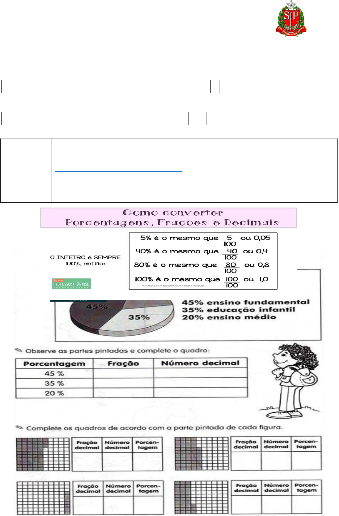 Secretaria de Estado da Educação Diretoria de Ensino – Região de Itapecerica da Serra E.E. ANGENOR DE OLIVEIRA POETA – DERITS DISCIPLINA PROFESSOR DATA DE ENTREGA Orientação de estudo Priscila 23/05/2022 NOME DO ALUNO N.º SÉRIE/ANO TURMA 6º HABILIDADES EF05MA06 Associar as representações 10%, 25%, 50%, 75% e 100% respectivamente à décima parte, quarta parte, metade, três quartos e um inteiro, para calcular porcentagens, utilizando estratégias pessoais, cálculo mental e calculadora, em contextos de educação financeira, entre outros. Vídeo www.youtube.com/watch?v=nnNU6DfOxfQ www.youtube.com/watch?v=qyG8Hni3nj0&t=179s