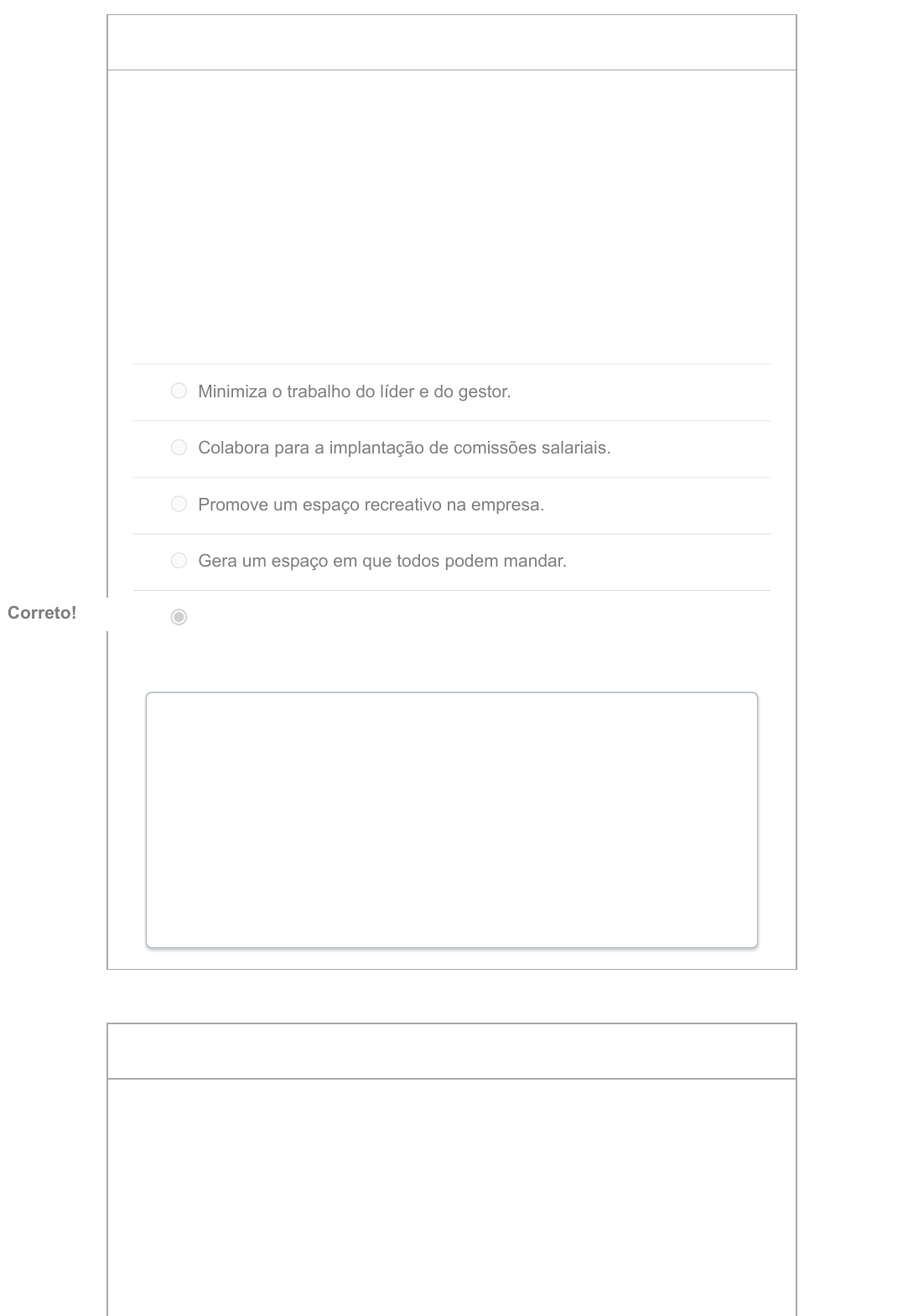 50 / 50 ptsPergunta 1 A comunicação dentro das organizações deve ser vista como um processo e não como algo simples, de via única, em que apenas o líder transmite sua informação. Antes, ela deve ser vista como uma oportunidade de interagir e facilitar a troca de informações baseada em experiências de vida e sentimentos das pessoas. Nesse sentido, leia atentamente as alternativas a seguir e assinale a que corresponde à relevância do processo de comunicação no contexto organizacional, ou seja, seu benefício. Minimiza o trabalho do líder e do gestor. Colabora para a implantação de comissões salariais. Promove um espaço recreativo na empresa. Gera um espaço em que todos podem mandar. Contribui para a efetivação de metas. Correto!Correto! A boa comunicação interna nas empresas favorece a definição e a efetivação de objetivos e metas, além de promover o equilíbrio e a integração entre todos os indivíduos que compõem as organizações. Ela permite, ainda, que os colaboradores compartilhem suas experiências, renegociem suas categorias e sejam capazes de adquirir novas interpretações acerca da realidade empresarial. Com isso, todos os atores do âmbito organizacional podem ser ativos e protagonistas da expressão filosófica da empresa. 50 / 50 ptsPergunta 2 Para que a comunicação ocorra, é necessário que exista a definição do que se quer comunicar, do propósito. A partir dessa premissa, o feedback no processo de comunicação representa: A transmissão de mensagens relacionadas ao trabalho executado, sendo estabelecido pela empresa. A verificação da eficácia com que a mensagem enviada foi transmitida — ele determina se o transmitido foi ou não entendido. Correto!Correto! As barreiras de comunicação que distorcem a clareza da mensagem. A definição de quem receberá a mensagem. A espontaneidade, estando relacionado às escolhas individuais. Resposta correta: "A verificação da eficácia com que a mensagem enviada foi transmitida — ele determina se o transmitido foi ou não entendido", porque o feedback é o link final do processo de comunicação, é um laço de retroalimentação para verificar a eficácia com que a mensagem foi transmitida e compreendida. A alternativa "A definição de quem receberá a mensagem" está incorreta porque o receptor é a pessoa, ou as pessoas, a quem a mensagem será destinada. A alternativa "As barreiras de comunicação que distorcem a clareza da mensagem" está incorreta porque as barreiras ou a distorção da comunicação são representadas pelos ruídos. A alternativa "A espontaneidade, estando relacionado às escolhas individuais" está incorreta porque expressa o conceito dos canais informais de comunicação. A alternativa "A transmissão de mensagens relacionadas ao trabalho executado, sendo estabelecido pela empresa" está incorreta porque expressa o conceito dos canais formais de comunicação.