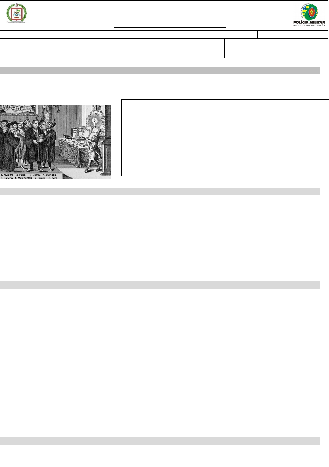 + SECRETARIA DE SEGURANÇA PÚBLICA/SECRETARIA DE EDUCAÇÃO COMANDO DE ENSINO POLICIAL MILITAR CEPMG - VASCO DOS REIS Divisão de Ensino / Coordenação Pedagógica SÉRIE/ANO: 7o TURMA(S): A, B, C, D, E, F e G DISCIPLINA: História DATA: / / 2021 PROFESSOR (A): Martha J. da Silva Lista de Atividades da Recuperação do 2º Semestre ALUNO (A): ___________________________________________________________________N° Questão 01: OBSERVE a reprodução da gravura. Os reformadores: Wycliffe, Huss, Lutero, Zwínglio, Calvino, Melanchton, Bucer e Beza (1886). A imagem sugere que a problemática central desses reformadores era o retorno à Bíblia, às Sagradas Escrituras, traduzidas e consideradas como o único fundamento da fé e da conduta para todos os seres humanos. A)- EXPLIQUE um motivo pelo qual o retorno à Bíblia, às Sagradas Escrituras foi uma das causas das reformas religiosas no século XVI. B)- CITE pelo menos duas atitudes da Igreja Católica que foram motivo de crítica dos Reformadores Religiosos. Questão 02: A Reforma Protestante ou Reforma Religiosa, foi um movimento que pretendiam estabelecer alterações em algumas concepções e princípios difundidos pela Igreja Católica romana. ASSINALE a alternativa CORRETA. Entre as razões (ou causas) da Reforma Protestante podemos citar: (A) Guerras sanguentas por toda a Europa. (B) Estimulou o desenvolvimento do Capitalismo (C) Intolerância diante das artes e das ciências - Publicação do Index (D) Impulsionou a alfabetização (E) A compra por parte do alto clero de cargos, como o de bispo e cardeal e a vida de luxo e ociosidade que levavam esses religiosos. Questão 03: ENUMERE a Segunda Coluna de acordo com a Primeira: ( ) Objetos, com pedaços de ossos, madeira ou tecido que atribuídos a algum santos e guardados como amuleto. ( ) Lista de livros e obras elaborada pela Igreja Católica, proibida aos fiéis. ( ) Termo utilizado por aqueles que destacam a reação aos cultos evangélicos, ou seja, foi a reação da Igreja Católica com relação a Reforma. ( ) Expressão mais utilizada por aqueles que entendem que se tratou de uma renovação eclesiástica e doutrinária. ( ) Certificados vendidos pela Igreja Católica, que abonavam os pecados dos fiéis. (A) Index (B) Indulgências (C) Relíquias de Santos (D) Reforma (E) Contrarreforma Agora MARQUE a alternativa que mostra a sequência CORRETA: (A) E, D, C, B e A (B) D, E, A, C e B (C) C, A, E, D e B (D) B, C, E, A e D (E) C, D, E, B e A Questão 04: Caracterize o Concílio de Trento e quais suas mudanças. Questão 05: A Reforma Protestante ocorrida na Europa no início do século XVI provocou o rompimento do cristianismo no Ocidente. Dentre os IDEIAS DEFENDIDAS por Lutero, PODEMOS MENDIONAR corretamente: (A) A eliminação de todos os sacramentos. (B) A salvação alcançada através da fé. (C) A subordinação do Estado aos interesses religiosos. (D) O celibato clerical. (E) A dogmatização da fé através da interpretação única das Sagradas Escrituras. Lutero : Foto Joseph Fiennes Foto publicada em 27 de novembro de 2008 |Copyright ArtédisPersonalidades Joseph Fiennes Questão 06: Para Calvino, Deus já havia, desde sempre, escolhido as pessoas que seriam salvas e aquelas que estavam condenadas à morte eterna, essa é a diferenciação do luteranismo para o calvinismo chamada de: ( A ) Justificação da fé ( B ) Predestinação absoluta ( C ) As 95 Teses ( D ) Indulgência ( E ) Heresia Questão 07: Todo acontecimento histórico é marcado por Causas e Consequências, com a Reforma Religiosa não foi diferente. IDENTIFIQUE entre as alternativas abaixo uma das CONSEQUÊNCIAS da Reforma Religiosa: (A) A venda de Indulgências (B) Pós fim ao monopólio espiritual da Igreja Católica (C) A falta de instrução e de preparo dos padres (D) Fraudulento de artigos religiosos. (E) A compra por parte do clero de cargos eclesiásticos Questão 08: OBSERVE a gravura a seguir com atenção e depois RESPONDA as questões letras A, B e C: Serpente marinha gigante atacando um navio, representada em um mapa do ano de 1539. Autoria: Olaus Magnus. A)- O que ESTÁ ACONTECENDO na cena? B)- Que RELAÇÃO essa imagem tem com o MOVIMENTO das Grandes Navegações? C)- CITE QUAIS os perigos reais enfrentados pelos navegadores daquela época. Questão 09: OBSERVE o mapa abaixo e RESPONDA às questões que se seguem. Fonte da Imagem: https://br.pinterest.com/pin/858991328912214720/ A)- Cite os nomes dos dois países europeus que foram pioneiros nas Grandes navegações. B)- Cite dois instrumentos usados pelos portugueses durante a Expansão Marítima. C)- Que continente passou a ser conhecido após as Grandes Navegações? Questão 10: OBSERVE a charge e depois RESPONDA o que se pede. ( A ) o casamento de D. João II rei, de Portugal, e Isabel de Castela, durante a União Ibérica. ( B ) a expansão marítima e a divisão das terras do novo mundo entre Portugal e Espanha. ( C ) a consolidação da monarquia espanhola com a chegada de Felipe II a o poder. ( D ) a consolidação do Estado português após a Guerra de Reconquista ( E ) O Tratado de Badajó que regulariza o Território da América Portuguesa A charge abaixo RETRATA Questão 11: MARQUE A ALTERNATIVA que representa a IMPORTÂNCIA DAS ESPECIARIAS PARA OS EUROPEUS. A)- Eram necessárias para tingir as roupas de vermelho e diferenciar assim os ricos dos pobres. B)- Eram utilizadas em pesquisas para produção de medicamentos. C)- Eram usadas para conservar e temperar carne, como não havia geladeiras, isso era muito importante. D)- Eram importantes cosméticos e estavam no auge em Paris. E)- Eram usadas para encontrar a fonte da juventude eterna Questão 12: Todo acontecimento histórico é marcado por causas e consequências, com as Expansão Marítima Comercial não foi diferente. ASSINALE a alternativa que IDENTIFICA uma das CONSEQUÊNCIAS da Expansão Marítima Comercial Europeia: (A) A necessidade de superar as Crises dos s