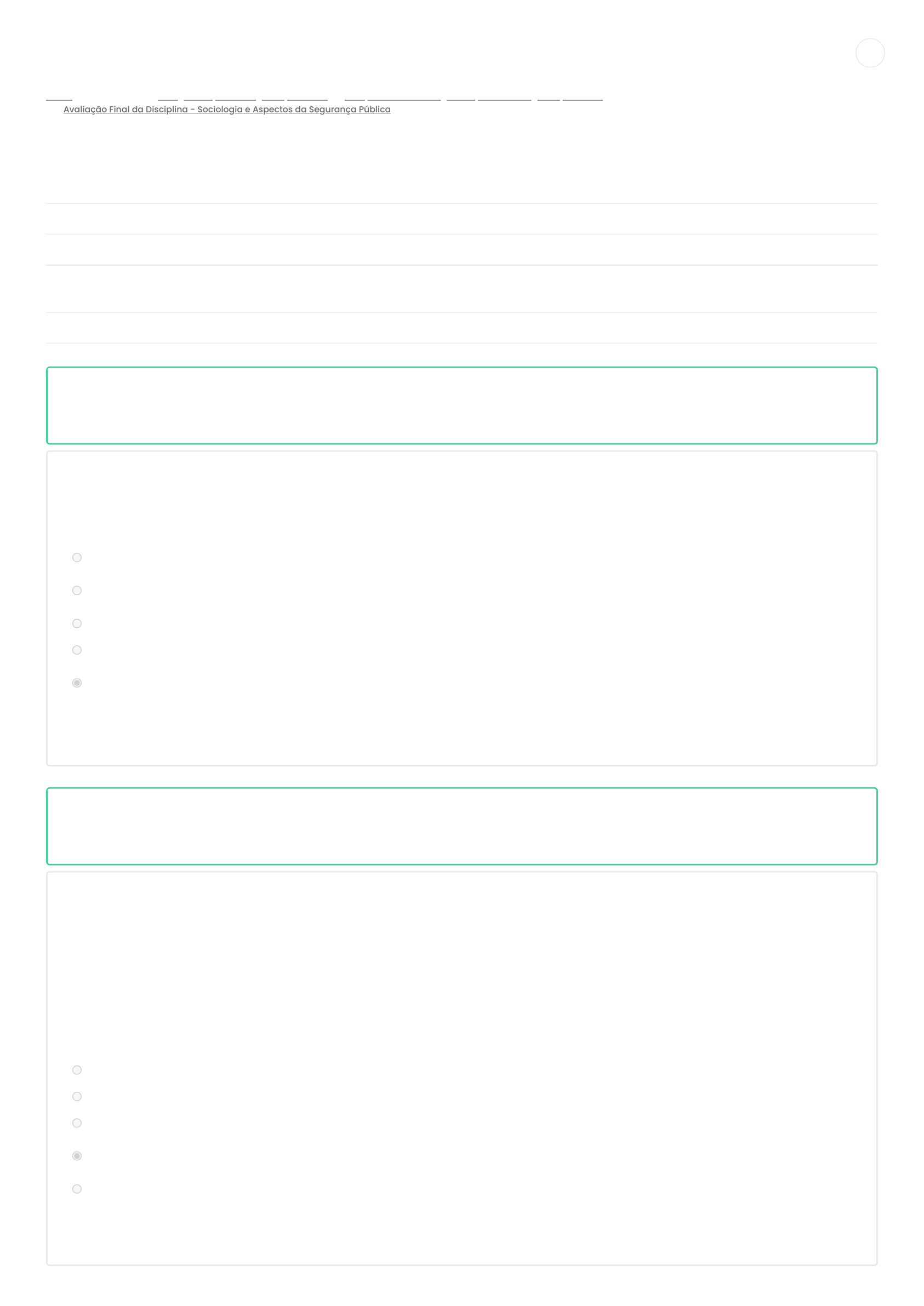 19/07/2022 13:09 Avaliação Final da Disciplina - Sociologia e Aspectos da Segurança Pública: Revisão da tentativa https://ava.cenes.com.br/mod/quiz/review.php?attempt=40106&cmid=2185 1/5 - Meus cursos - - - Painel Pós-graduação em Segurança Pública Disciplina 04 - Sociologia e Aspectos da Segurança Pública Avaliação Final da Disciplina - Sociologia e Aspectos da Segurança Pública Iniciado em Tuesday, 19 Jul 2022, 12:20 Estado Finalizada Concluída em Tuesday, 19 Jul 2022, 12:37 Tempo empregado 16 minutos 50 segundos Avaliar 10,0 de um máximo de 10,0(100%) Questão 1 Correto Atingiu 1,0 de 1,0 A assistência ao preso e ao internado é um fator de suma importância para a ressocialização do preso e para a prevenção da reincidência ao crime. Assinale a alternativa que não representa uma assistência garantida no art. 41 da Lei de Execução Penal. a. assistência religiosa e social; b. contato com o mundo exterior por meio de correspondência escrita e leitura de documentos informativos que não comprometam a moral e os bons costumes; c. Previdência Social d. assistência material, à saúde, jurídica e educacional; e. assistência financeira para uso pessoal dentro e fora do presídio. é assegurado ao preso remuneração somente mediante trabalho, além da constituição de pecúlio com parte desta remuneração. A resposta correta é: assistência financeira para uso pessoal dentro e fora do presídio. Questão 2 Correto Atingiu 1,0 de 1,0 Analise as afirmativas e assinale a alternativa que melhor caracteriza a Segurança Pública. I. tem como fim último proporcionar aos indivíduos, na convivência social, a fruição de relações pautadas no direito básico de liberdade; II. caracteriza a ausência de risco correspondente ao interesse da sociedade; III. define o bem-estar, confiança e conforto que o Estado deve proporcionar ao indivíduo. IV. combina ações preventivas e reativas, de natureza pública, voltadas ao alcance e à manutenção da ordem pública; a. Somente I e III estão corretas; b. Somente I, II e IV estão corretas. c. Somente I e II estão corretas; d. Todas as alternativas estão corretas; A segurança pública está relacionada a coletividade, portanto busca garantir o bem-estar, a confiança e o conforto social. e. Somente I e IV estão corretas; A resposta correta é: Todas as alternativas estão corretas; https://ava.cenes.com.br/my/ https://ava.cenes.com.br/course/view.php?id=26 https://ava.cenes.com.br/course/view.php?id=26§ion=6 https://ava.cenes.com.br/mod/quiz/view.php?id=2185 19/07/2022 13:09 Avaliação Final da Disciplina - Sociologia e Aspectos da Segurança Pública: Revisão da tentativa https://ava.cenes.com.br/mod/quiz/review.php?attempt=40106&cmid=2185 2/5 Questão 3 Correto Atingiu 1,0 de 1,0 No que concerne à ressocialização do apenado e ao papel do agente penitenciário neste âmbito, assinale a alternativa incorreta. a. É importante que os agentes penitenciários tenham garantidos os seus direitos, que recebam remuneração adequada, treinamento e formação continuada. b. O agente penitenciário deve atuar como agente garantidor dos direitos do preso, prestando assistência e buscando efetuar todo o atendimento necessário por conta própria, evitando encaminhá-lo para outros setores. O agente penitenciário deve atuar como agente garantidor dos direitos do preso, prestando assistência e encaminhando-os, sempre que necessário, para atendimento nos diversos setores. c. O agente penitenciário deve participar das propostas para definir a individualização da pena com o objetivo de ajudar o preso na adaptação e reinserção social. d. Ao agente penitenciário cabe vigiar, fiscalizar, inspecionar, revistar e acompanhar os presos ou internados, zelando pela ordem e segurança deles, bem como da Unidade Penal. A resposta correta é: O agente penitenciário deve atuar como agente garantidor dos direitos do preso, prestando assistência e buscando efetuar todo o atendimento necessário por conta própria, evitando encaminhá-lo para outros setores. Questão 4 Correto Atingiu 1,0 de 1,0 As chamadas instituições sociais são responsáveis pela educação que conduz à sociabilidade dos indivíduos desde a fase inicial de suas vidas e se dividem em instituições espontâneas, reguladoras, criadas e operacionais. A esse respeito, assinale a alternativa incorreta. a. As instituições sociais criadas têm a finalidade de organizar a sociedade, são exemplos a igreja e a escola. b. As instituições espontâneas são aquelas que surgem das relações entre os indivíduos da mesma sociedade. c. As instituições reguladoras são aquelas que estabelecem regras e guiam a sociedade. d. São exemplos de instituições reguladoras o Estado e a economia. e. As instituições operacionais são aquelas que empregam os indivíduos e contribuem para o crescimento econômico da sociedade. As instituições operacionais são aquelas que amparam a execução de práticas sociais, tais como o transporte e lazer. A resposta correta é: As instituições operacionais são aquelas que empregam os indivíduos e contribuem para o crescimento econômico da sociedade. Questão 5 Correto Atingiu 1,0 de 1,0 Em relação ao tema do encarceramento em massa, analise as afirmativas a seguir e assinale a alternativa incorreta. a. o Estado tem o dever e a responsabilidade de defender a sociedade, inclusive de arbitrariedades que seus agentes possam cometer no exercício da função estatal. b. O Estado oferte a todos os cidadãos direitos oportunidades e condições iguais. o Estado oferta aos cidadãos direitos iguais, porém existe uma discrepância de oportunidades e condições. c. Atualmente, o crime de tráfico de drogas é responsável pelo maior número de prisões no Brasil, cerca de 40,5%. d. O encarceramento em massa pode ser definido como o aprisionamento que sai da esfera individual e passa para o aprisionamento sistemático de grupo
