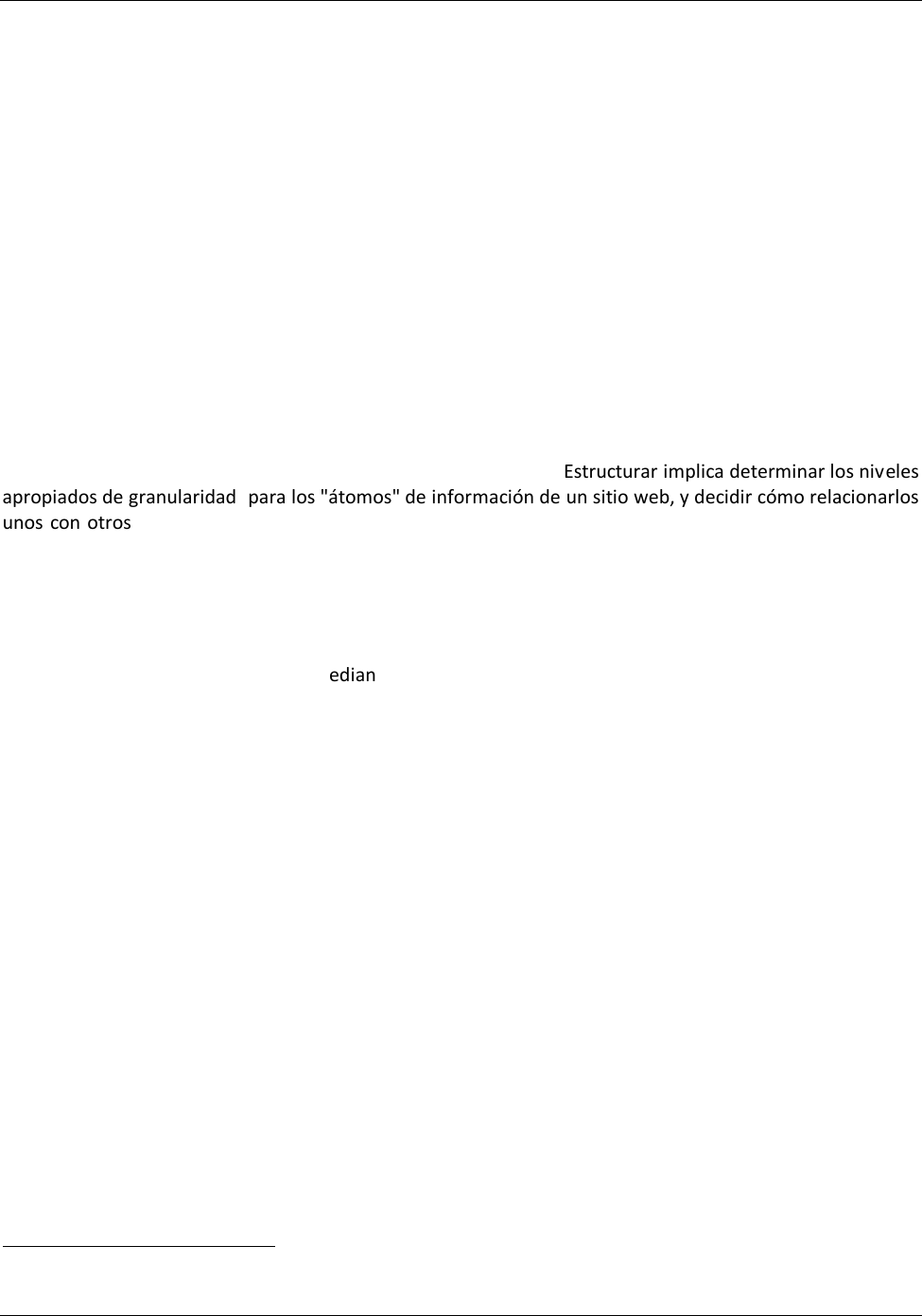 Universidad Nacional de Jujuy-Facultad de Ingeniería Sistemas de Información- Sistemas de Información I Prof. Lic. Analía N. Herrera Cognetta 1 UNIDAD VII DISEÑO Conceptos básicos de la Arquitectura de la Información. Información Utilizamos el término información para distinguir la arquitectura de la información de la gestión de los datos o de la gestión del conocimiento. Los datos son hechos y cifras. Las bases de datos relacionales están muy estructuradas y proporcionan respuestas específicas para preguntas específicas. El conocimiento es lo que hay dentro de las cabezas de la gente. Los gestores del conocimiento desarrollan herramientas, procesos e incentivos para animar a la gente a que lo comparta. La información está en una ambigua zona intermedia. Con los sistemas de información, a menudo no hay una única respuesta "correcta" para una determinada pregunta. Nos interesa la información de todas las formas y tamaños: sitios web, documentos, aplicaciones software, imágenes y demás. También nos interesan los metadatos: términos utilizados para describir y representar objetos de contenido como documentos, personas, procesos y organizaciones. Estructurar, organizar y rotular Esto es lo que mejor se les da a los arquitectos de la información. Estructurar implica determinar los niveles apropiados de granularidad1 para los "átomos" de información de un sitio web, y decidir cómo relacionarlos unos con otros. Organizar implica agrupar esos componentes en categorías significativas y características. Rotular significa decidir cómo llamar a esas categorías y a la serie de enlaces de navegación que llevan a ellas. Encontrar y utilizar La buscabilidad (findability) es un factor crítico de éxito para la usabilidad en general. Si los usuarios no pueden encontrar lo que necesitan mediante alguna combinación de navegación, búsquedas y preguntas, significa que el sitio web no sirve. Pero el diseño centrado en el usuario no es suficiente. Las organizaciones y las personas que utilizan información también son importantes. Una arquitectura de la información debe contrapesar las necesidades de los usuarios con los objetivos de negocio. Una gestión eficiente del contenido y políticas y procedimientos claros son esenciales. Arte y ciencia Disciplinas como la ingeniería de la usabilidad y la etnografía están ayudando a introducir el rigor del método científico en el análisis de las necesidades de los usuarios y de las pautas de búsqueda de información. Cada vez somos más capaces de estudiar los patrones de uso para hacer mejoras en nuestros sitios web. Pero la pŕactica de la arquitectura de la información nunca se reducirá a los números; hay demasiada ambigüedad y complejidad. Los arquitectos de la información deben confiar en la experiencia, la intuición y la creatividad. Debemos estar dispuestos a arriesgarnos y fiarnos de nuestra intuición. Éste es el "arte" de la arquitectura de la información. Tabletas, Pergaminos, Libros y Bibliotecas Los humanos llevamos siglos estructurando, organizando y rotulando información. En el año 660 A.C, un rey asirio hizo que organizasen sus tabletas de arcilla por temas. En 330 A.C, la bliblioteca de Alejandría albergaba una bibliografía que ocupaba 120 pergaminos. En 1873, Melvil Dewey inventó la Clasificación Decimal de Dewey como herramienta para organizar y proporcionar acceso al creciente número de libros. 1 La granularidad se refiere al tamaño relativo o calibre de los pedazos de información. Diferentes niveles de granularidad pueden incluir: un número de una revista, un artículo, un párrafo, una frase. nicoj Resaltar nicoj Resaltar Universidad Nacional de Jujuy-Facultad de Ingeniería Sistemas de Información- Sistemas de Información I Prof. Lic. Analía N. Herrera Cognetta 2 En tiempos modernos, la mayoría de nosotros nos familiarizamos con los fundamentos de la organización de la información a través de nuestras experiencias con los libros y las bibliotecas. La tabla 1-1 muestra cómo los conceptos de la arquitectura de la información (AI) aplican al mundo de la publicación impresa y a la Web. Tabla 1-1. Diferencias entre sitios web y libros Concepto AI Libros Sitios web Componentes Cubierta, título, autor, capítulos, secciones, páginas, números de página, tabla de contenidos, índice Página de inicio, barra de navegación, enlaces, páginas de contenido, mapa del sitio, índice del sitio, búsqueda Dimensiones Páginas de dos dimensiones representadas en orden lineal y secuencial Espacio de información multidimensional con navegación hipertextual Límites Tangibles y finitos con principio y fin definidos Bastante intangible con fronteras difuminadas que hacen que la información "gotee" a otros sitios Al pasar de libros a colecciones de libros, las comparaciones se vuelven aún más interesantes. Imaginemos una librería sin ningún plan de organización. Miles de libros desparramados en enormes montones encima de unas mesas. De hecho, existe una librería así: Gould's Book Arcade en Newtown, Australia. Se muestra en la figura 1-1. Figura 1-1. Gould's Book Arcade (imagen cortesía de Seth Gordon) Desde un punto de vista filosófico, uno puede pensar que este desorden de libros supone una ruptura refrescante de las rígidas estructuras de la vida cotidiana. Y esta librería puede realmente proporcionar una maravillosa experiencia para quien hojea, llena de aventura y descubrimientos inesperados. Pero si llegas buscando un libro en concreto y si tienes en mente a un autor o tema en particular, es prácticamente seguro que sufrirás la experiencia larga y dolorosa de "buscar una aguja en un pajar". Compara el caos de esta librería con el orden de una biblioteca (ver Figura 1-2). Incluso en la superficie, el contraste es como el del día y la noche. Pero mira un poco más allá y verás que la biblioteca es más que un almacén de libros, revistas y música. Hay sistemas comp