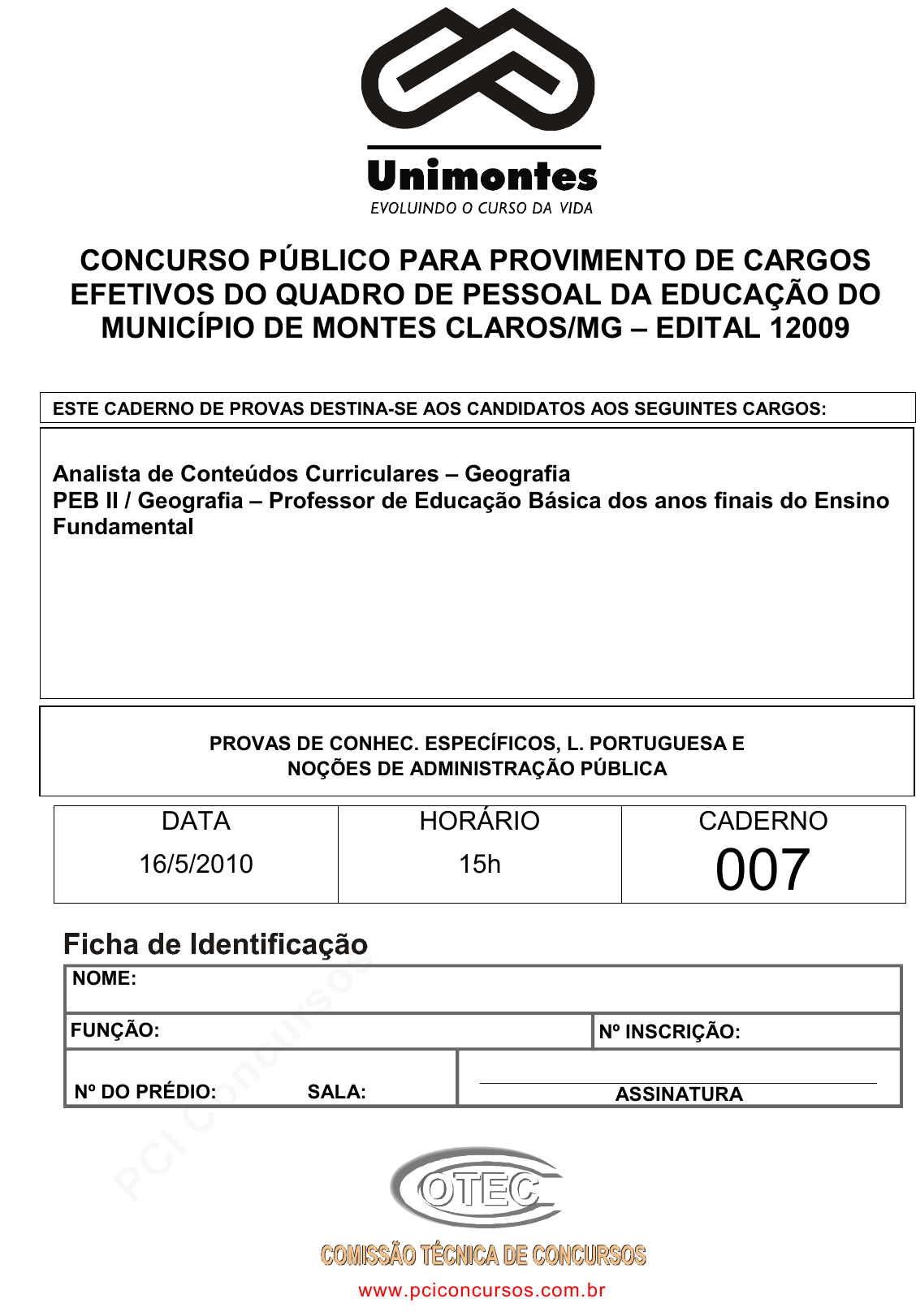 pcimarkpci MjgwNDowMTRkOjJhODM6OWIzMTo0ZGMwOjUzZmY6OGI2YzozMGM3:U2F0LCAwMyBBcHIgMjAyMSAwOTozNToyNiAtMDMwMA== CONCURSO PÚBLICO PARA PROVIMENTO DE CARGOS EFETIVOS DO QUADRO DE PESSOAL DA EDUCAÇÃO DO MUNICÍPIO DE MONTES CLAROS/MG – EDITAL 12009 NOME: Nº INSCRIÇÃO:FUNÇÃO: ASSINATURA Nº DO PRÉDIO: SALA: Analista de Conteúdos Curriculares – Geografia PEB II / Geografia – Professor de Educação Básica dos anos finais do Ensino Fundamental ESTE CADERNO DE PROVAS DESTINA-SE AOS CANDIDATOS AOS SEGUINTES CARGOS: DATA 16/5/2010 HORÁRIO 15h CADERNO 007 PROVAS DE CONHEC. ESPECÍFICOS, L. PORTUGUESA E NOÇÕES DE ADMINISTRAÇÃO PÚBLICA www.pciconcursos.com.br pcimarkpci MjgwNDowMTRkOjJhODM6OWIzMTo0ZGMwOjUzZmY6OGI2YzozMGM3:U2F0LCAwMyBBcHIgMjAyMSAwOTozNToyNiAtMDMwMA== 1 ORIENTAÇÕES IMPORTANTES 01 - Este caderno contém questões do tipo múltipla escolha e uma questão discursiva. 02 - Verifique se o caderno contém falhas: folhas em branco, má impressão, páginas trocadas, numeração errada, etc. Encontrando falhas, levante a mão. O Fiscal o atenderá e trocará o seu caderno. 03 - Cada questão tem 4 (quatro) alternativas (A - B - C - D). Apenas 1 (uma) resposta é correta. Não marque mais de uma resposta para a mesma questão, nem deixe nenhuma delas sem resposta. Se isso acontecer, a questão será anulada. 04 - Para marcar as respostas, use preferencialmente caneta esferográfica com tinta azul ou preta. NÃO utilize caneta com tinta vermelha. Assinale a resposta certa, preenchendo toda a área da bolinha . 05 - Tenha cuidado na marcação da Folha de Respostas, pois ela não será substituída em hipótese alguma. 06 - Confira e assine a Folha de Respostas, antes de entregá-la ao Fiscal. NA FALTA DA ASSINATURA, A SUA PROVA SERÁ ANULADA. 07 - Não se esqueça de assinar a Lista de Presenças. 08 - Após TRÊS HORAS, a partir do início das provas, você poderá retirar-se da sala, levando este caderno. DURAÇÃO DESTAS PROVAS: TRÊS HORAS E TRINTA MINUTOS OBS.: Candidatos com cabelos longos deverão deixar as orelhas totalmente descobertas durante a realização das provas. É proibido o uso de boné. www.pciconcursos.com.br pcimarkpci MjgwNDowMTRkOjJhODM6OWIzMTo0ZGMwOjUzZmY6OGI2YzozMGM3:U2F0LCAwMyBBcHIgMjAyMSAwOTozNToyNiAtMDMwMA== 2 PROVA DE CONHECIMENTOS ESPECÍFICOS Questões numeradas de 01 a 15 QUESTÃO 01 Geógrafo alemão, considerado o pai da Geografia Humana, no início do século XX, afirmou “Espaço é poder”. (MOREIRA, Igor. O Espaço Geográfico: Geografia Geral e do Brasil. São Paulo: Ática, 1998) Trata-se de uma afirmativa de A) Alexander von Humboldt. B) Friedrich Ratzel. C) Vital de La Blache. D) Carl Sauer. QUESTÃO 02 Observe a figura. (Fonte: Estado de Minas, 4-1-2010) Considere que um pesquisador brasileiro tenha feito o roteiro de viagem conforme mostra o deslocamento do avião na figura. De acordo com esse percurso, assinale a alternativa INCORRETA. A) O deslocamento ocorreu de uma região meridional para uma temperada setentrional. B) O deslocamento permitiu observar paisagens fitogeográficas heterogêneas. C) O deslocamento permitiu observar um aumento da diversidade genética nas paisagens. D) O deslocamento se deu no sentido sul/norte e depois oriental/ocidental. QUESTÃO 03 O carvão mineral teve papel fundamental durante a 1ª Revolução Industrial. Quanto maior o teor de carbono, melhor é o poder de combustão do carvão. De acordo com o teor de carbono, pode-se identificar 4 tipos de carvão mineral. Assinale a alternativa CORRETA para o tipo de carvão de maior concentração de carbono, embora não seja o mais abundante, considerando-se as jazidas minerais. A) Hulha. B) Antracito. C) Turfa. D) Linhita. www.pciconcursos.com.br pcimarkpci MjgwNDowMTRkOjJhODM6OWIzMTo0ZGMwOjUzZmY6OGI2YzozMGM3:U2F0LCAwMyBBcHIgMjAyMSAwOTozNToyNiAtMDMwMA== 3 QUESTÃO 04 Os acidentes que resultam em liberação de material radioativo de dentro do reator contaminam o meio ambiente e afetam os seres vivos não só nas áreas próximas das usinas, mas também nas que estão a grandes distâncias destas. Assinale a alternativa correspondente ao acidente em usina nuclear considerado o mais grave. A) Na Pensilvânia, na usina de Thee Mile Island. B) Na Rússia, em Chernobyl, no ano de 1979. C) Na Ucrânia, em Chernobyl, no ano de 1986. D) Na Islândia, na usina de Thee Mile Island. QUESTÃO 05 Países criam uma nova organização regional no Continente Americano. Chefes de Estados e representantes de 32 países da região subscreveram a Constituição da Comunidade de Estados Latino-Americanos e Caribenhos – Celac. Para Lula, a Celac será um fórum para debater problemas sociais, comerciais e econômicos. O batismo da organização foi uma vitória brasileira sobre a proposta mexicana, que preferia “união” no lugar de “comunidade”. (Fonte: Folha de São Paulo, 24/2/2010) São países integrantes da Celac, EXCETO A) Venezuela. B) El Salvador. C) Argentina. D) Canadá. QUESTÃO 06 Ao escrever o livro “A Geografia – isso serve em primeiro lugar para fazer a guerra”, Yves Lacoste aborda uma temática denunciando as diversas facetas do conhecimento geográfico. São temas discutidos por ele, EXCETO A) a Geografia Física, com ênfase nas questões ambientais. B) o uso estratégico do conhecimento geográfico para a guerra. C) a aplicação do conhecimento geográfico pelos americanos, na Guerra do Vietnã. D) a existência de uma Geografia didática e outra militar. QUESTÃO 07 As fronteiras políticas do Estado nacional assinalam os limites geográficos da soberania. Em relação aos limites do território brasileiro, estão corretas as alternativas, EXCETO A) O oceano Atlântico banha a porção sudeste do Brasil. B) O Paraguai limita-se com o sudoeste do Brasil. C) A Bolívia limita-se com o noroeste do Brasil. D) O Uruguai limita-se com o sul do Brasil. QUESTÃO 08 Milton Santos, buscando caracterizar esta nova fase da humanidade marcada po