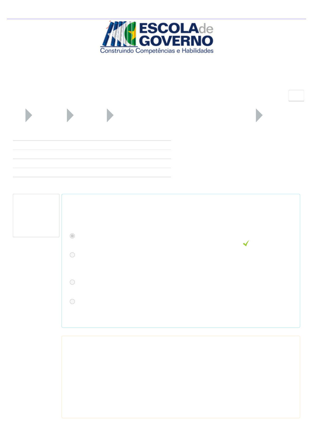 Buscar cursos Questão 1 Correto Atingiu 10,00 de 10,00 Noções de Gestão Pública Gerencial - T2/2022 Iniciado em quinta, 23 Jun 2022, 09:43 Estado Finalizada Concluída em quinta, 23 Jun 2022, 09:47 Tempo empregado 4 minutos 56 segundos Avaliar 100,00 de um máximo de 100,00 Na teoria da administração pública gerencial podemos conceituar a governabilidade pública como sendo: Escolha uma: a. a capacidade política que advém da estabilidade do exercício das atribuições legitimadas segundo a relação entre Estado, governo e sociedade. b. o modo de gerenciamento, controle e relacionamento das organizações públicas segundo determinada capacidade de decidir, governar e implementar políticas públicas; c. a ponte digital entre a estratégia governamental e a operacionalização dos serviços que visa ampliar o relacionamento com a sociedade; d. a prestação de contas dos representantes políticos frente aos seu eleitores e cidadãos, em face da noção de que o poder concedido para utilização dos recursos públicos tem como titular o cidadão e não os políticos; Sua resposta está correta. Resposta correta: Inicialmente falaremos da governabilidade e governança. Os conceitos são complementares e de difícil dissociação. A governabilidade de forma simples é a capacidade política de governo que deriva da relação entre Estado, governo e sociedade. A resposta correta é: a capacidade política que advém da estabilidade do exercício das atribuições legitimadas segundo a relação entre Estado, governo e sociedade.. Mensagens 5 HILTON DO ESPIRITO SANTO BRANDAO Introdutórios NGPG0222 Unidade 2 - Noções de Gerencialismo (30/05 a 05/06/2022) Avaliação Virtual 2. Unidade 2. http://eadeg.gestao.mt.gov.br/ http://eadeg.gestao.mt.gov.br/ http://eadeg.gestao.mt.gov.br/course/index.php?categoryid=3 http://eadeg.gestao.mt.gov.br/course/view.php?id=99 http://eadeg.gestao.mt.gov.br/course/view.php?id=99§ion=3 http://eadeg.gestao.mt.gov.br/mod/quiz/view.php?id=4740 Questão 2 Correto Atingiu 10,00 de 10,00 Porque o mais correto é apresentar administração pública gerencial como uma evolução da administração pública burocrática: Escolha uma: a. ambas são uma área de investigação intelectual que é uma parte do saber humano (como a biologia, a história ou a matemática); b. ambas são um conjunto formado por um governo militarizado, por um corpo de funcionários que se ocupa da gestão pela força policial e militar. c. no que se refere ao ciclo da administração pública burocrática temos as seguintes fases: o Modelo Gerencial Puro, o New Public Management e o Public Service Orientation; d. diversas características da administração pública burocrática são mantidas na administração pública gerencial, tais como a meritocracia, admissão de pessoal, e avaliação de desempenho; Sua resposta está correta. Resposta correta: Contudo, a administração gerencial não pode ser dissociada totalmente da burocracia, já que diversas características são mantidas (meritocracia, admissão de pessoal, e avaliação de desempenho). Os mais correto seria apresentar a primeira como uma evolução da última. A resposta correta é: diversas características da administração pública burocrática são mantidas na administração pública gerencial, tais como a meritocracia, admissão de pessoal, e avaliação de desempenho;. Questão 3 Correto Atingiu 10,00 de 10,00 Qual é o tipo de administração pública que se propõe a diminuição das disfunções burocráticas relativas a resistência a mudanças, rigidez e falta de inovação, apreço extremo as regras, desvalorização ao resultado público, excessiva formalização e lentidão no processo de decisão: Escolha uma: a. administração pública burocrática; b. administração pública societal; c. administração pública gerencial. d. administração pública patrimonialista; Sua resposta está correta. Resposta correta: Porém, a eficiência pregada pelo modelo [burocrático] não ficou evidente na prática, principalmente pelo surgimento das disfunções burocráticas: resistência a mudanças, rigidez e falta de inovação, apreço extremo as regras e não com resultado, excessiva formalização, e lentidão no processo de decisão. Ficou claro que a burocracia não garantia qualidade, economia e rapidez na prestação de serviços à população. A resposta correta é: administração pública gerencial.. Questão 4 Correto Atingiu 10,00 de 10,00 A terceira onda da teoria de administração pública gerencial que foi denominada de Public Service Oriented (PSO) é caracterizada pela: I – priorização da eficiência na prestação dos serviços através da participação da sociedade no processo de planejamento das políticas de Estado. II – ausência de sinergia entre o cidadão e o Estado, em razão do conflito eminente na prestação dos serviços públicos. III – eficiência administrativa que executa o necessário para o cidadão que fica investido em poderes de fiscalização em defesa da sociedade quanto a efetividade dos respectivos resultados públicos. Escolha uma: a. todas as assertivas estão corretas. b. somente a assertiva I está correta; c. somente a assertiva III está correta; d. somente a assertiva II está incorreta; Sua resposta está correta. Resposta correta: O PSO busca uma sinergia entre cidadão e Estado, priorizando não apenas a eficiência na prestação dos serviços, mas também a participação da sociedade no processo de planejamento das políticas de Estado. Podemos dizer que o referido modelo aponta para a descentralização como um alicerce da implementação de políticas públicas. De forma resumida este defende a eficiência administrativa sem deixar de executar o necessário para o cidadão, de maneira a permitir a fiscalização da sociedade quanto a efetividade dos resultados. A resposta correta é: somente a assertiva II está incorreta;. Questão 5 Corr