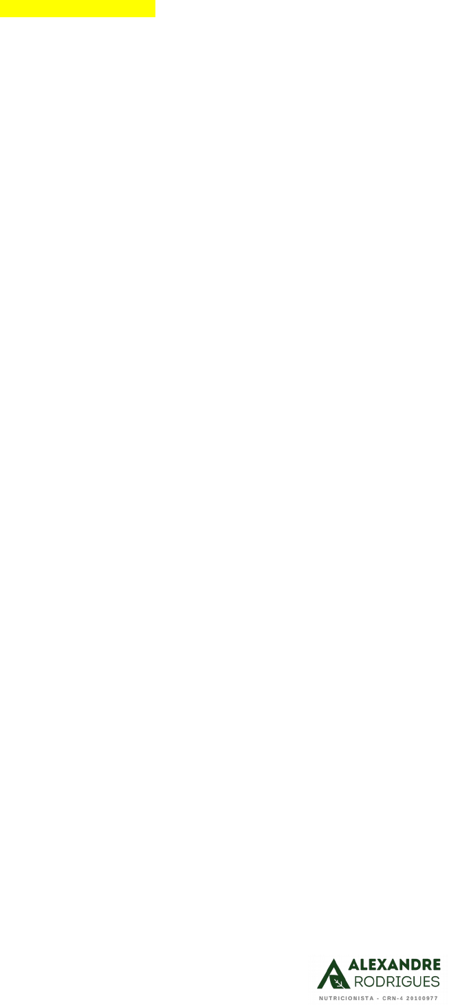 Atividade Avaliativa 4 1 - Mulher de 34 anos, 164 cm de altura e 57 kg de peso. Calcule o metabolismo basal de acordo com a fórmula de Harris e Benedict e de acordo com a FAO-WHO. R: TMB - Harris e Benedict 655,1 + 9,5 x P + 1,8 x A – 4,7 x I 655,1 + 9,5 x 57 + 1,8 x 164 – 4,7 x 34 655,1 + 541,5 + 295,2 – 159,8 = 1332 Kcal TMB - FAO/WHO 8,126 x P + 845,6 8,126 x 57 + 845,6 463,182 + 845,6 = 1308,78 Kcal 2 - Responda às seguintes perguntas: a) Quantas calorias você tem em uma dieta que contém 298,1 g de carboidratos, 165,63 g de proteínas e 88,33 g de lipídios? R: . Carboidrato 298,1g x 4 Kcal = 1192,4 Kcal carboidrato . Proteína 165,63g x 4 Kcal = 662,52 Kcal proteína . Lipídio 88,33g x 9 Kcal = 794,97 Kcal 1192,4 + 662,52 + 794,97 = 2649,89 Kcal b) Calcule os percentuais de energia dos carboidratos, lipídios e proteínas da dieta. R: . Carboidrato 2649,89 – 100% 1192,4 – x x = 45% . Proteína 2649,89 – 100% 662,52 – x x = 25% . Lipídio 2649,89 – 100% 794,97 – x x = 30% c) Qual é o equivalente em kilojoules (kJ) desta dieta para cada um dos macronutrientes? R: . Carboidrato 1 Kcal – 4,184 KJ 1192,4 – x x = 4989 KJ . Proteína 662,52 x 4,184 = 2771,98 KJ . Lipídio 794,97 x 4,184 = 3326,15 KJ