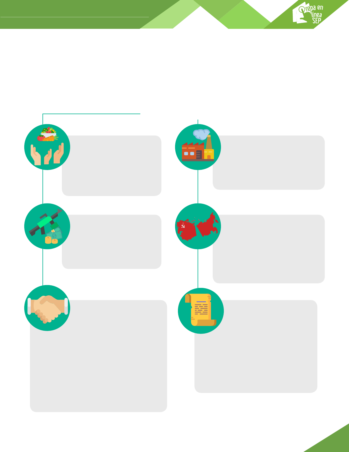 1 Módulo 10 Transformaciones en el mundo contemporáneo Mundo Unipolar Las principales potencias eran Estados Unidos y la Unión Soviética, que se regían por los sistemas capitalista y socialista, respectivamente. Ambos sistemas vivieron crisis que dieron paso a uno nuevo: el neoliberalismo. Para iniciar hablaremos de la crisis que vivió el socialismo. Mundo unipolar Crisis del socialismo Los bienes de consumo y alimentos que se producían no eran suficientes para satisfacer las necesidades de la población, lo que ocasionaba que el gobierno los importara. Los enormes gastos militares, provocaron una crisis en su modelo económico y esto, a su vez, debilitó su papel como potencia. Debido a la de debilidad interna y externa de la Unión Soviética, Mijail Gorbachov (dirigente de la URSS) inició un proceso de reformas, cuyo objetivo era volver liberal el rígido sistema económico de planificación centralizada, de esta manera se modernizaría y aumentaría la producción y mejoraría el nivel de vida de la población. Lo anterior requería un cambio en la política exterior que se consolidó en 1987 con el Tratado de Washington, en el que Estados Unidos y la URSS se comprometían a reducir sus armamentos. Las reformas debilitaron el control del gobierno soviético sobre otros países. Esto a su vez permitió las reivindicaciones nacionalistas y las peticiones de autonomías de las repúblicas que conformaban la URSS. La separación fue inevitable y, en 1991, la Unión Soviética se desintegró: el territorio quedó dividido en muchas repúblicas que se declararon independientes. La industria soviética estaba cada vez más retrasada en el ámbito tecnológico, lo que implicaba que fuera poco competitiva internacionalmente, en especial respecto a Estados Unidos. Los países que estaban bajo el dominio soviético se veían desfavorecidos por los problemas de la Unión de Repúblicas Socialistas Soviéticas (URSS), así que expresaron su intención de independizarse y cambiar su sistema político y económico. 2 Módulo 10 Transformaciones en el mundo contemporáneo Mundo Unipolar Estados Unidos quedó como única superpotencia mundial y demostró su poder en 1990: El dictador iraquí Saddam Hussein invadió Kuwait. Como respuesta, Estados Unidos envió tropas que liberaron Kuwait, bombardeó Irak con misiles teledirigidos y arrasó al ejército iraquí en los campos de batalla. En ese entonces Kuwait estaba controlado económicamente por el país norteamericano. Tras su derrota, Irak fue condenada a pagar los daños de guerra, a destruir su armamento químico y nuclear y a tener su petróleo bajo embargo. Con la invasión, Irak aseguraba el control de 20 % de las reservas mundiales de petróleo y ponía en peligro la fuente de energía más importante para el mundo occidental. A partir de ese momento, Estados Unidos se confirmó como “gendarme internacional”. Tenía el poder para intervenir donde sus intereses se pusieran en juego sin que ninguna otra potencia se opusiera, ya que no había nadie capaz de enfrentársele. 5 3 4 6 21 3 Módulo 10 Transformaciones en el mundo contemporáneo Mundo Unipolar El sistema capitalista que regía a Estados Unidos, a pesar de ser el preponderante, desde años previos había sufrido varias crisis. Crisis del capitalismo El Estado de Bienestar1 tuvo dificultades para cumplir sus funciones, como asegurar el pleno empleo2 y el control del funcionamiento de las empresas. Muchas empresas e industrias disminuyeron sus ventas y sus ganancias, esto ocasionó que cerraran y esto, a su vez, generó inflación, desempleo y empobrecimiento. Ante estos sucesos, los gobiernos no tomaron medidas para cambiar el rumbo de la economía, lo que significó el fin del Estado de Bienestar. Un conflicto entre Israel y los países árabes provocó que la Organización de Países Exportadores de Petróleo (OPEP) limitara sus exportaciones. Esto provocó que el precio del barril de petróleo aumentara más de 300 % y se encarecieran las materias primas derivadas del petróleo, como los plásticos y los combustibles, también el precio del transporte incrementó. Todo esto terminó con la etapa de energía abundante y barata. La crisis económica del mundo occidental y sus efectos desestabilizadores originaron una nueva división del mundo, quizás más grave e irresoluble que la vivida en la Guerra Fría. La división entre los países ricos y los pobres. Frente a la crisis económica, comenzaron a difundirse las ideas neoliberales, que se consideraban herederas de los liberales del siglo XVIII y XIX. Objetivo de la política neoliberal Lograr el crecimiento económico que, cuando llegue a ser voluminoso, elevará los niveles de ingreso y resolverá la situación de los más desfavorecidos. Para lograr este objetivo, es prioritario garantizar la libertad del mercado. 1Estado de Bienestar o Estado benefactor se entiende como el conjunto de actividades desarrolladas por los gobiernos para proveer servicios, como la transferencia de dinero, cuidados sanitarios (un sistema de salud universal y gratuito), servicios de educación (garantizar el acceso al conocimiento de todos los ciudadanos) y provisión de vivienda, alimentación y otros servicios asistenciales. 2El pleno empleo es cuando todos los individuos de un país, que están en condiciones de trabajar y quieren hacerlo, se encuentran efectivamente laborando. 4 Módulo 10 Transformaciones en el mundo contemporáneo Mundo Unipolar A diferencia del Estado de Bienestar, que intervenía regulando los beneficios de las empresas, los salarios y los precios, el neoliberalismo sostiene que el Estado debe intervenir en la economía sólo para garantizar la libre competencia. El programa neoliberal está caracterizado por los siguientes rasgos: • El crecimiento económico es la razón de ser de la economía. • Se privatizan las empresas públicas, pues la búsqueda de beneficios y la competencia mejorarán los servicios. 