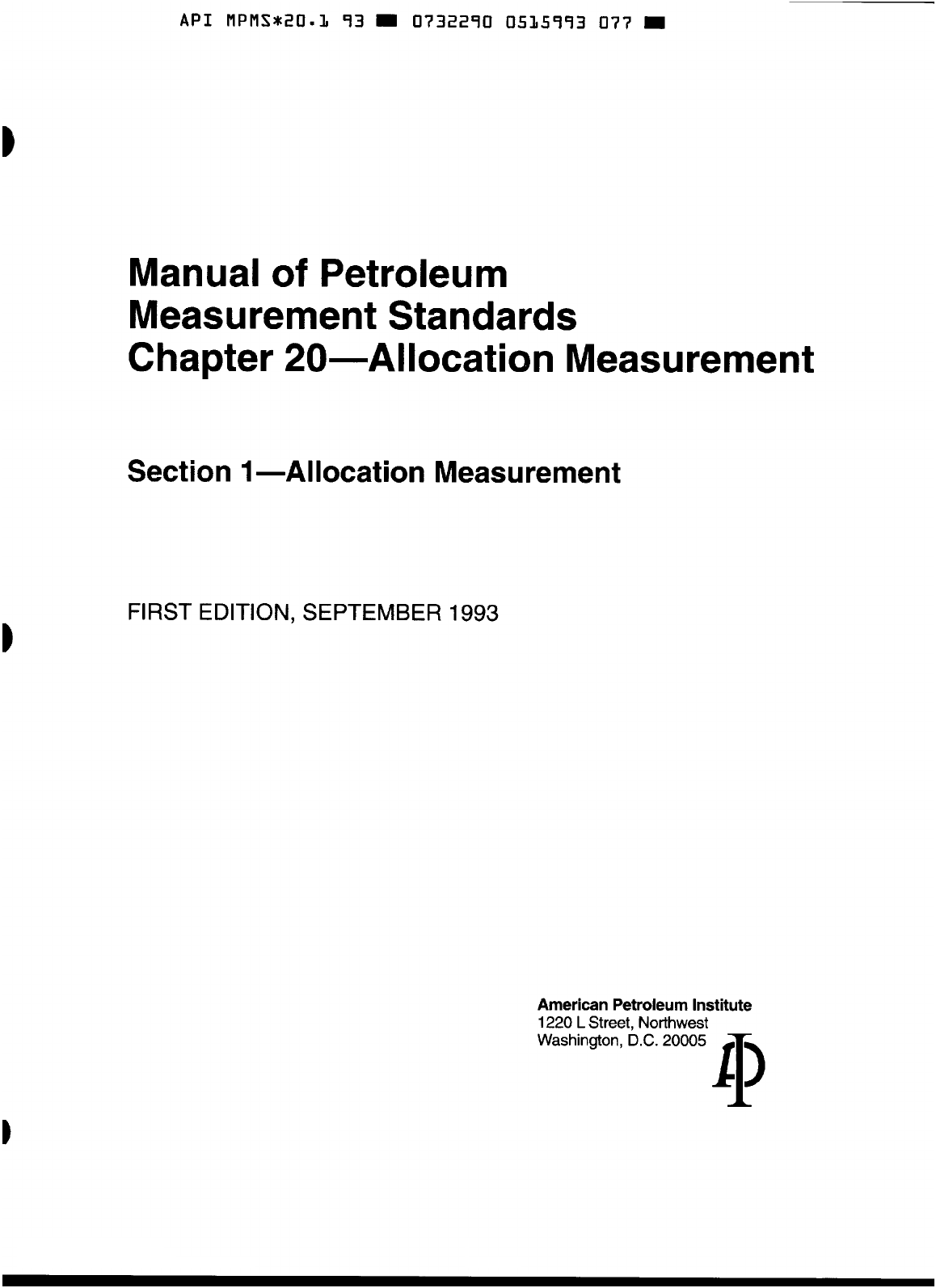 A P I MPMS*:20-3 93 0732290 0535993 077 Manual of Petroleum Measurement Standards Chapter 20-Allocation Measurement Section I-Allocation Measurement FIRST EDITION, SEPTEMBER 1993 American Petroleum Institute 1220 L Street, Northwest 11) Washington, D.C. 20005 Copyright American Petroleum Institute Reproduced by IHS under license with API Not for ResaleNo reproduction or networking permitted without license from IHS - - ` ` ` , ` ` - ` - ` , , ` , , ` , ` , , ` - - - Manual of Petroleum Measurement Standards Chapter 20-Allocation Measurement Section I-Allocation Measurement Measurement Coordination FIRST EDITION, SEPTEMBER 1993 American Petroleum Institute Copyright American Petroleum Institute Reproduced by IHS under license with API Not for ResaleNo reproduction or networking permitted without license from IHS --```,``-`-`,,`,,`,`,,`--- API MPMS+20~3 73 m 0732270 0535775 7 Y T m SPECIAL NOTES 1. API PUBLICATIONS NECESSARILY ADDRESS PROBLEMS OF A GENERAL NATURE. WITH RESPECT TO PARTICULAR CIRCUMSTANCES, LOCAL, STATE, AND FEDERAL LAWS AND REGULATIONS SHOULD BE REVIEWED. 2. API IS NOT UNDERTAKING TO MEET THE DUTIES OF EMPLOYERS, MANU- FACTURERS, OR SUPPLIERS TO WARN AND PROPERLY TRAIN AND EQUIP THEIR EMPLOYEES, AND OTHERS EXPOSED, CONCERNING HEALTH AND SAFETY RISKS AND PRECAUTIONS, NOR UNDERTAKING THEIR OBLIGATIONS UNDER LOCAL, STATE OR FEDERAL LAWS. 3. INFORMATION CONCERNING SAFETY AND HEALTH RISKS AND PROPER TIONS SHOULD BE OBTAINED FROM THE EMPLOYER, THE MANUFACTURER OR SUPPLIER OF THAT MATERIAL, OR THE MATERIAL SAFETY DATA SHEET. 4. NOTHING CONTAINED IN ANY API PUBLICATION IS TO BE CONSTRUED AS FACTURE, SALE OR USE OF ANY METHOD, APPARATUS, OR PRODUCT COVERED BY LEITERS PATENT. NEITHER SHOULD ANYTHING CONTAINED IN THE PUBLICATION BE CONSTRUED AS INSURING ANYONE AGAINST LIABILITY FOR INFRINGEMENT OF LETïERS PATENT. PRECAUTIONS WITH RESPECT TO PARTICULAR MATERIALS AND CONDI- GRANTING ANY RIGHT, BY IMPLICATION OR OTHERWISE, FOR THE MANU- 5. GENERALLY, API STANDARDS ARE REVIEWED AND REVISED, REAF- FIRMED OR WITHDRAWN AT LEAST EVERY FIVE YEARS. SOMETIMES A ONE TIME EXTENSION OF UP TO TWO YEARS WILL BE ADDED TO THIS REVIEW CYCLE. THIS PUBLICATION WILL NO LONGER BE IN EFFECT FIVE YEARS AFTER ITS PUBLICATION DATE AS AN OPERATIVE API STANDARD OR, WHERE AN EXTENSION HAS BEEN GRANTED, UPON REPUBLICATION. STATUS OF THE PUBLICATION CAN BE ASCERTAINED FROM THE API PUBLICATIONS DEPART- MENT [TELEPHONE (202) 682-8000]. A CATALOG OF API PUBLICATIONS AND MATERIALS IS PUBLISHED ANNUALLY AND UPDATED QUARTERLY BY API, 1220 L STREET N. W., WASHINGTON, D.C. 20005. Copyright O 1993 American Petroleum Institute Copyright American Petroleum Institute Reproduced by IHS under license with API Not for ResaleNo reproduction or networking permitted without license from IHS - - ` ` ` , ` ` - ` - ` , , ` , , ` , ` , , ` - - - A P I MPMS*20.3 93 M 0732290 0535996 886 M FOREWORD The Allocation Measurement Standard, API Manual of Petroleum Measurement Stan- dards, Chapter 20.1, was developed in response to an indicated desire by federal and state regulatoq agencies to reference API measurement standards. In 1986 various regulatory agencies began requiring the petroleum industry to use the API Manual of Petroleum Measurement Standards for allocation measurement on federal and state leased lands. The edition of the manual in place then was written specifically for custody transfer mea- surement, which was inappropriate for allocation measurement. Although the petroleum indus@ does a substantial amount of allocation measurement, the industry was being required to use a standard that did not apply. The API Committee on Petroleum Measurement responded in the spring of 1987 by commissioning a task group to survey the industry and determine if an allocation standard was necessary. After determining that the need did actually exist, an API working group was commissioned in the fall of 1987 to develop the scope and the field of application for such a standard. A second survey in the fall of 1987 was conducted to verify the types of equipment used, the typical design of measurement facilities, and the typical operating procedures used for allocation measurement. This document, Chapter 20.1 of the APZ Manual of Petroleum Measurement Standards, is the result of that industry survey and the efforts of the working group. API publications may be used by anyone desiring to do so. Every effort has been made by the Institute to assure the accuracy and reliability of the data contained in them; how- ever, the Institute makes no representation, warranty, or guarantee in connection with this publication and hereby expressly disclaims any liability or responsibility for loss or damage resulting from its use or for the violation for any federal, state, or municipal regulation with which this publication may conflict. Suggested revisions are invited and should be submitted to Measurement Coordination, Industry Services Department, American Petroleum Institute, 1220 L Street, Northwest, Washington, D.C. 20005. iii Copyright American Petroleum Institute Reproduced by IHS under license with API Not for ResaleNo reproduction or networking permitted without license from IHS - - ` ` ` , ` ` - ` - ` , , ` , , ` , ` , , ` - - - . A P I MPMS*20-3 93 0732290 0535997 712 CONTENTS Page SECTION 1-ALLOCATION MEASUREMENT 1.1 Introduction .......................................................................................................... 1 1.2 Scope .................................................................................................................... 2 1.3 Terms ................................................................................................................... 2 1.3.1 Definitions .................................................................................................... 2 1.3.2 Abbreviations ............................................................................................... 3 1.4 Referenced Publications