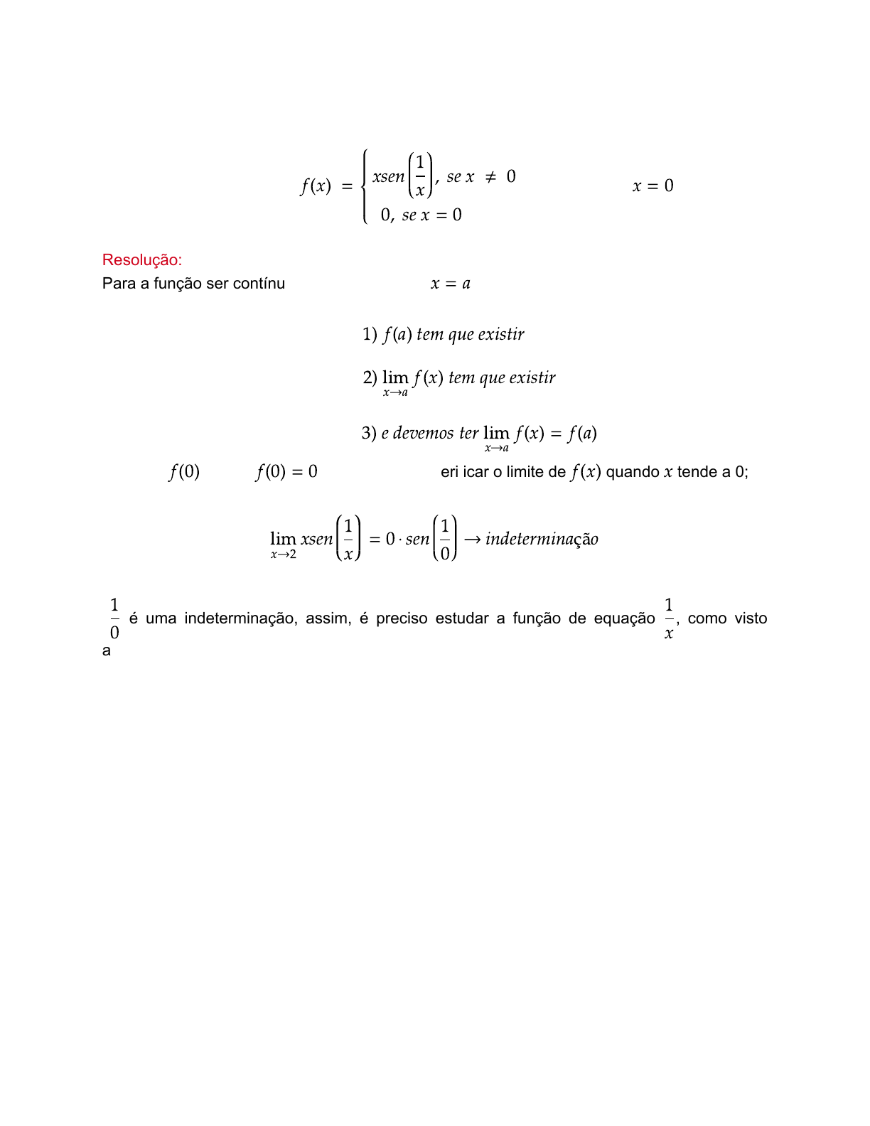 Tiago Lima - Instagram: @professor_disciplinas_exatas • Mostre que a função é contínua em .f x =( ) xsen , se x ≠ 0 1 x 0, se x = 0 x = 0 Resolução: Para a função ser contínua em um ponto com é preciso satisfazer 3 condições;x = a 1 f a tem que existir) ( ) 2 f x tem que existir) lim x→a ( ) 3 e devemos ter f x = f a) lim x→a ( ) ( ) Veja que existe, ; vamos, agora, verificar o limite de quando tende a 0;f 0( ) f 0 = 0( ) f x( ) x xsen = 0 ⋅ sen indeterminaçãolim x→2 1 x 1 0 → é uma indeterminação, assim, é preciso estudar a função de equação , como visto 1 0 1 x abaixo: Perceba que o limite da função é . A função seno é um tipo de função chamada 1 x ±∞ limitada, já que varia sempre entre -1 e 1 mesmo a função tendendo para , com isso, ±∞ podemos escrever as desiguadades: -1 ⩽ sen ⩽ 1 1 x Multiplicando a expressão por x, fica : -1 ⋅ x ⩽ x ⋅ sen ⩽ 1 ⋅ x 1 x - x ⩽ x sen ⩽ x2 1 x Agora, aplicamos o limite aos termos : - x ⩽ x sen ⩽ xlim x 0→ ( ) lim x 0→ 2 2 1 x lim x 0→ Os limites - x e x são iguais a zero;lim x 0→ lim x 0→ 0 ⩽ xsen ⩽ 0lim x 0→ 1 x Finalmente, podemos concluir que o limite pela esquerda e pela direita tende xsenlim x 0→ 1 x a zero e, assim: xsen = 0lim x 0→ 1 x Como; xsen = f 0 = 0 a função é contínua!lim x 0→ 1 x ( ) → (Resposta )