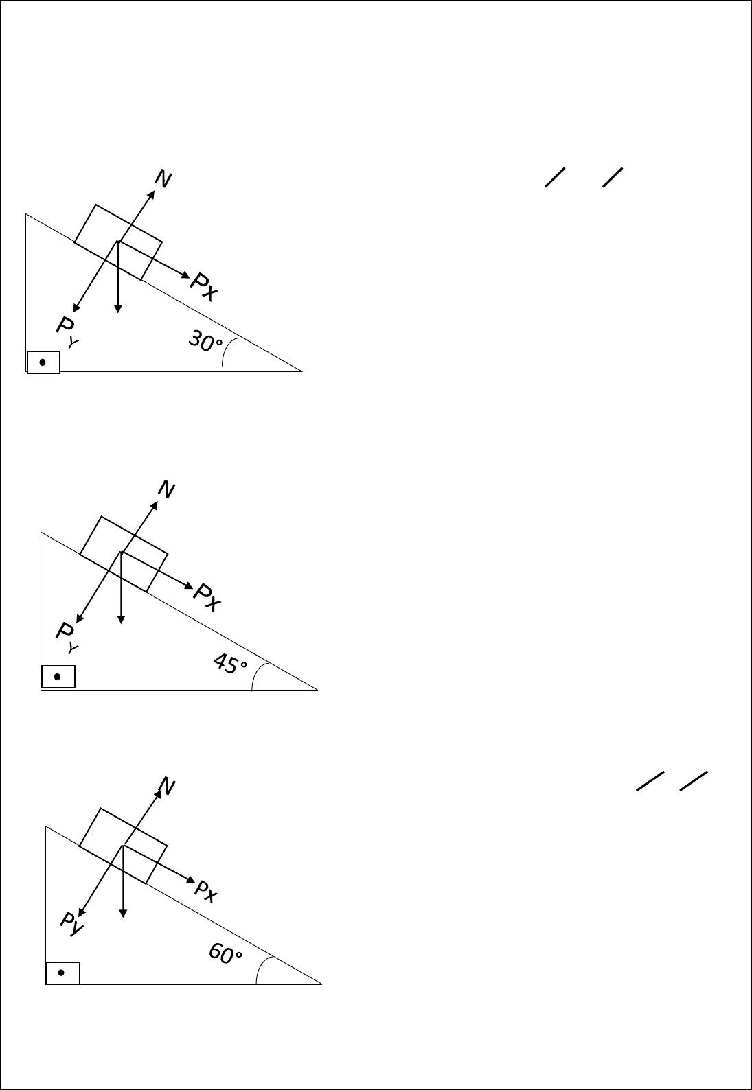 PLANO INCLINADO 2 1-Um plano inclinado liso e sem atritos apresenta ângulo de 30º em relação ao solo. Sendo a gravidade local de 10 m/s², determine a aceleração adquirida por um corpo posto a deslizar a partir do topo desse plano. 2-Um bloco de 3 kg encontra-se em repouso e apoiado sobre um plano inclinado em 45º em relação ao solo. Considerando a gravidade local igual a 10 m/s², determine o módulo da força que o plano inclinado exerce sobre o bloco. 3-Um bloco de 2 kg desliza sobre uma superfície sem atrito de um plano inclinado em 60º. Determine a força mínima a ser aplicada sobre o bloco, na direção da superfície desse plano, para que o corpo deslize com velocidade constante. Dados: g = 10 m/s² P Px = P.sen60° Py = P.cos60° ∑R = Px + N + Py ∑R = m.g.sen60° ∑R = 2.10.0,8 ∑R = 16N Sen60° = 0,8 Cos60° = 0,5 P N = Py N = P.Cos45° N = m.g.0,7 N = 3.10.0,7 N = 21N Px = P.sen45° Py = P.cos45° Sen45° = 0,7 Cos45° = 0,7 P Px = P.sen30° Py = P.cos30° Sen30° = 0,5 Cos30° = 0,8 ∑R = Px m.a = m.g.sen30° a = 10.0,5 a= 5m/s 2 4-A força normal exercida sobre um corpo apoiado sobre um plano inclinado é de 20 N. Sendo de 40 N o peso desse corpo, determine o ângulo de inclinação desse plano inclinado em graus. 5-UNIMEP-SP). Um bloco de massa 5kg é arrastado ao longo de um plano inclinado sem atrito, conforme a figura. Para que o bloco adquira uma aceleração de 3m/s² para cima, a intensidade da F deverá ser: (g = 10m/s², sen θ = 0,8 e cos θ = 0,6). a) igual ao peso do bloco b) menor que o peso do bloco c) igual à reação do plano d) igual a 55N e) igual a 10N 6-Um corpo de 10 kg é apoiado sobre um plano inclinado de 45º com relação à direção horizontal. Determine o módulo aproximado da aceleração desenvolvida por esse corpo. Dados: √2 = 1,41. Px = P.senꝊ° Py = P.cosꝊ° SenꝊ° = ? CosꝊ° = ? N = Py Py = 20N Py = P.cosꝊ° 20 = 40. cosꝊ° cosꝊ° = 20 40 cosꝊ° = 0,5 Ꝋ° = 60° P = 40N P Px = P.sen45° Py = P.cos45° ∑R = Px + N + Py m.a = m.g.sen45° a = 10.0,705 a = 7,05 m/s2 Sen45° = 0,705 Cos45° = 0,705 P ∑R = F – Px m.a = F – P.SEN 5.3 = F – 50.0,8 F = 15+40 F = 55N Px = P.senꝊ° Py = P.cosꝊ° P = m.g P = 5.10 P = 50N ÂNGULOS √2 2 √2 2 √3 2 √3 2 √3 3 √3 1 2 1 2 SenӨ° = 𝐶𝑜𝑝 ℎ CosӨ° = 𝐶𝑎𝑑 ℎ TgӨ° = 𝐶𝑜𝑝 𝐶𝑎𝑑 COS SEN 0° = 360° 270° 180° 90° Cateto Oposto (Cop) Cateto Adjacente (Cad)