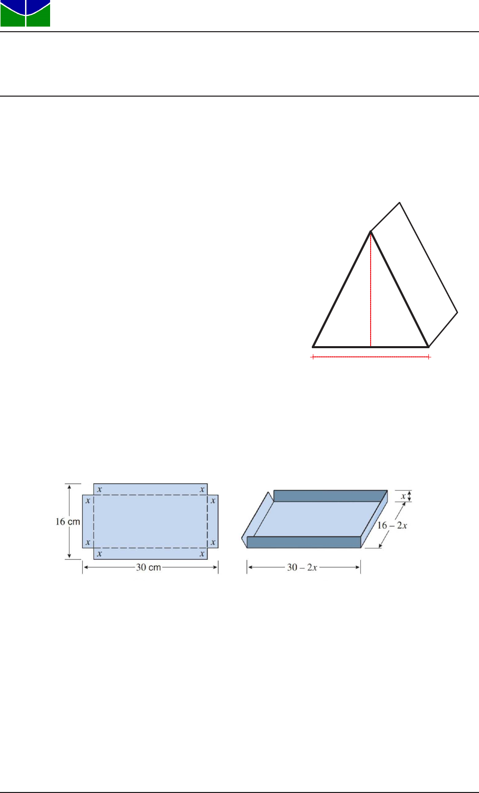 Universidade de Braśılia Departamento de Matemática Cálculo 1 Lista de Aplicações – Semana 08 Temas abordados : Extremos de funções Seções do livro: 4.1 1) Suponha que, na construção de uma barraca com vista frontal na forma de um triângulo isósceles de altura h, as laterais devem ser feitas a partir de uma lona com 6 m de comprimento e 3 m de largura, conforme ilustra a figura. (a) Determine o comprimento b da base do triângulo em função da altura h. (b) Use o item anterior para expressar o volume V (h) da barraca em função de h. (c) Determine h de forma que o volume V (h) seja máximo, justificando a sua resposta. 3m 3m b h 2) Uma caixa deve ser feita a partir de uma folha de papelão retangular cujos lados não paralelos medem 16 e 30 cent́ımetros. Isso será feito cortando-se, em cada vértice do papelão, um quadrado de x > 0 cent́ımetros de comprimento e dobrando-se os lados, conforme mostra a figura abaixo. (a) Obtenha o volume total da caixinha, V (x), em função do comprimento x dos qua- drados cortados. (b) Determine os pontos cŕıticos de V . (c) Determine o volume máximo que a caixinha pode alcançar. Lista de Aplicações da Semana 08 - Página 1 de 3 3) Suponha que uma viga retangular, de largura x e altura y, deva ser cortada de um cilindro de seção circular de raio a, como ilustra a figura abaixo. A resistência R dessa viga é diretamente proporcional ao produto de sua largura x pelo quadrado de sua altura y. Indique por K a constante de proporcionalidade e observe que a altura y = y(x) pode ser obtida a partir da largura x, e portanto a resistência R = R(x) pode ser expressa apenas em função da largura da viga x, onde x varia de 0 até o diâmetro 2a do cilindro circular. (a) Obtenha a expressão de y = y(x) em termos de x. (b) Obtenha a expressão da resistência R = R(x) como função de x. (c) Calcule os pontos cŕıticos de R(x) no domı́nio (0, 2a). (d) Calcule o valor máximo da resistência que pode ser obtido entre as vigas cortadas do cilindro. x y 4) Uma refinaria de petróleo está em A, na margem norte de um rio reto que tem L = 4 km de largura. Um oleoduto deve ligar a refinaria a um tanque de armazenamento, localizado em B ,na margem sul do rio, D = 6 km a leste da refinaria. O custo de construção do oleoduto é R$ 3 × 105/km sobre a terra, até um ponto P na margem norte do rio e R$ 5× 105/km sob o rio até o tanque. (a) Para cada x ∈ [0, 6], denote por C(x) o custo, em centenas de milhares de reais, para fazer a ligação. Determine a expressão de C(x). (d) Calcule os pontos cŕıticos de C em (0, 6). (c) Qual o custo mı́nimo para a construção do oleoduto? Lista de Aplicações da Semana 08 - Página 2 de 3 Gabarito 1. (a) b = 2 √ 9− h2 (b) V (h) = 3h √ 9− h2 (c) h = 3/ √ 2 2. (a) V (x) = x(16− 2x)(30− 2x), x ∈ (0, 8) (b) x = 10/3 (c) V (10/3) = 19600/27 3. (a) y(x) = √ 4a2 − x2 (b) R(x) = K(4a2x− x3) (c) x = 2a/ √ 3 (d) 16a3 √ 3 · (K/9) 4. (a) C(x) = 3x+ 5 √ 16 + (6− x)2, x ∈ [0, 6] (b) x = 3 (c) C(3) = 34, que corresponde a 3,4 milhões de reais Lista de Aplicações da Semana 08 - Página 3 de 3