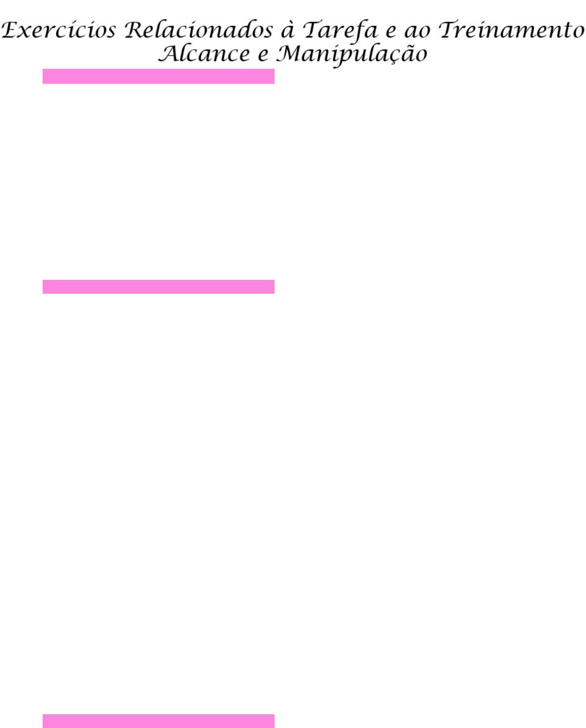 Alcance e manipulação · O MS funciona para colocar a mão na posição e orientação no espaço apropriadas para interagir com o ambiente – os movimentos de alcance são as principais ações dos braços e a interação com o ambiente, da mão. · A função da mão é tão sensorial como motora – sensores táteis e de pressão fornecem informações que identificam objetos, favorecendo a manipulação e força de diferentes objetos; · A visão tem um papel importante na informação do alcance e manipulação. Descrição da atividade · Alcance para preensão de um objeto – 2 componentes: · Componente de transporte – mão se move rápido para o alvo; · Componente de manipulação – mais lento, quando sob controle visual, os ajustes finais ocorrem imediatamente antes de segurar o objeto. · Após experimentação prévia, ações bimanuais relatam a maneira cooperativa em que as duas mãos interagem com o objeto para conquistar o objetivo. · Ex: abertura de lata, de garrafa, etc... · Agem em diferentes direções para interagir com o objeto. · A mão é o principal meio de interação como pessoas e objetos no ambiente externo; · A estrutura da mão e as conexões neurais corticomotoras para os músculos da mão permitem um grande nº de combinações articulares e possibilidades de movimento; · Durante as tarefas de manipulação, vários músculos diferentes são ativados; · O nº de músculos envolvidos na tarefa é diretamente proporcional ao grau de força e precisão – em alguns momentos apenas polegar e indicador e outros a mão inteira. Recuperação da função do MS · Relatos de estudos referem recuperação mínima de MMSS após lesão cerebral quando o membro se apresenta gravemente comprometido no início do quadro; · Registros de recuperação variam de 5 a 20% e ainda relatam aqueles 20% que não se recuperam; · Maior potencial de recuperação dentro de 3 meses após AVE; · Após 1 ano, estudos demonstram recuperação com treinamento e uso “forçado” do MS parético (única evidência). · A natureza complexa da mão, requerendo coordenação de vários músculos e segmentos, sua representação cortical e a natureza da lesão podem ser fatores significativos para a pouca recuperação. · Melhores resultados quando a reabilitação foi ativa e baseada em atividades relacionadas à tarefa; · Pouca recuperação associada às intervenções terapêuticas inapropriadas e insuficientes para MS, além da facilidade de se adaptar ao uso de uma única mão – efeitos da imobilidade e adaptabilidade aos tecidos moles. · A função ativa do MS é negligenciada na reabilitação – intervenções passivas, inibição da espasticidade, uso de talas e tipoias e principalmente a ativação voluntária da musculatura distal não é tratada nas estratégias fisioterapêuticas tradicionais. · Pontos de vista que ainda são expressos na literatura podem dificultas a recuperação: · Recuperação ocorre de proximal para distal; · A estabilidade e o controle do ombro são necessários antes do uso da mão; · A espasticidade precisa ser inibida antes do uso ativo do membro; · Tais crenças resultam em esforços terapêuticos precoces no ombro e negligenciam a mão; · Muitos terapeutas ainda acreditam que a espasticidade é o principal comprometimento, que os músculos não estão fracos e que exercícios repetitivos são contraindicados. · Ao contrário do que se pensava anteriormente, há grande evidência que o treinamento específico, intensivo e relacionado à tarefa, com prática repetitiva de movimentos relevantes, tem um resultado mais significativo na função dos MMSS; · Outro fator que interfere na recuperação são as modificações adaptativas associadas ao comprimento do músculo quando o membro fica imóvel. Disfunção motora – Fraqueza Muscular · O maior comprometimento subjacente à incapacidade funcional do MS pós lesão do NMS é a fraqueza muscular decorrente da diminuição do recrutamento das unidades motoras; · A literatura relata que os músculos proximais são afetados de forma menos grave do que os distais; · A atividade de adutores de ombro está presente após a lesão, mas dos abdutores (deltoides) estão inativos. · Inervação bilateral mais marcante para os adutores; · Informações monossimpáticas corticoespinhais mais forte para os abdutores (em especial o deltóide). Disfunção motora – Alterações no comprimento do músculo · Adaptações secundárias podem acontecer e influenciar o comprimento do músculo e tecidos moles – músculos se mantém encurtados se permanecem longos períodos imobilizados. · Os músculos que tipicamente encurtam são os adutores e rotadores internos de ombros, flexores de dedos e pinhos, flexores de cotovelo, pronadores e adutores de polegar; · A prevenção a essa desordem pode ser feita com exercícios ativos intensivos. Disfunção motora – treinamento · Necessidade precoce de se modificar o que é para ser praticado; · Ausência de equilíbrios sentado não deve ser um impedimento do treino precoce da função do MS; · Uma das principais funções do terapeuta deve ser possibilitar a pessoa com deficiência a praticar a ativação muscular e recuperar a habilidade de gerar a necessária, nem que o ambiente e a posição sejam modificados (anular a gravidade, por exemplo). Disfunção motora – componentes necessários · Alcance: · À frente – flexão do ombro; · Ao lado – abdução do ombro; · Para trás – extensão de ombro com elevação da cintura escapular, extensão de cotovelo e rotação externa de ombro. · Abertura da mão e espaços entre polegar e dedos; · Extensão de punho; · Pronação-supinação apropriada à orientação do objeto. · Preensão: · Extensão do punho e dedos com abdução e rotação concomitante das articulações metacarpianas do polegar e do 5° dedo. Fechamento dos dedos ao redor do objeto: · Ex: segura