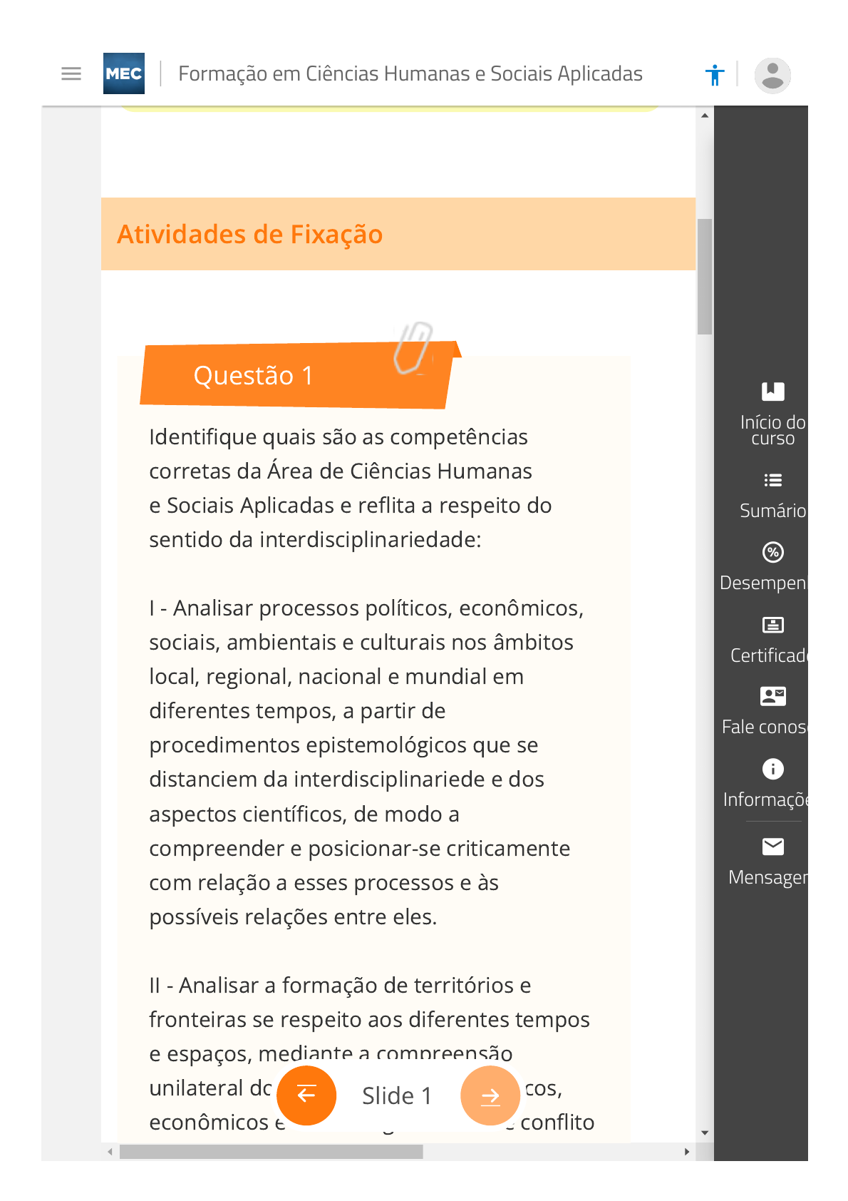 28/07/2022 18:20 Formação em Ciências Humanas e Sociais Aplicadas - AVAMEC https://avamec.mec.gov.br/#/instituicao/seb/curso/14511/unidade/8085/acessar 1/1 Atividades de Fixação Identi�que quais são as competências corretas da Área de Ciências Humanas e Sociais Aplicadas e re�ita a respeito do sentido da interdisciplinariedade: I - Analisar processos políticos, econômicos, sociais, ambientais e culturais nos âmbitos local, regional, nacional e mundial em diferentes tempos, a partir de procedimentos epistemológicos que se distanciem da interdisciplinariede e dos aspectos cientí�cos, de modo a compreender e posicionar-se criticamente com relação a esses processos e às possíveis relações entre eles. II - Analisar a formação de territórios e fronteiras se respeito aos diferentes tempos e espaços, mediante a compreensão unilateral dos processos sociais, políticos, econômicos e culturais geradores de con�ito Questão 1 Slide 1 Início do curso Sumário Desempenh Certificado Fale conosc Informaçõe Mensagem Formação em Ciências Humanas e Sociais Aplicadas javascript:void(0) https://avamec.mec.gov.br/ava-mec-ws/instituicao/seb/conteudo/modulo/4498/mod3/uni1/slide01.html