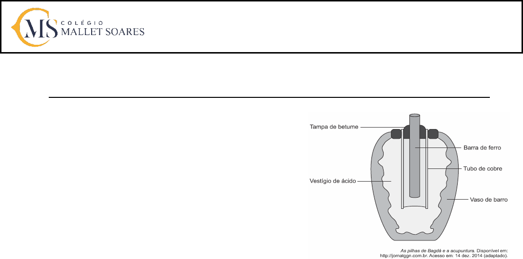 1) (Enem 2018) Em 1938, o arqueólogo alemão Wilhelm König, diretor do Museu Nacional do Iraque, encontrou um objeto estranho na coleção da instituição, que poderia ter sido usado como uma pilha, similar às utilizadas em nossos dias. A suposta pilha, datada de cerca de 200 a.C., é constituída de um pequeno vaso de barro (argila) no qual foram instalados um tubo de cobre, uma barra de ferro (aparentemente corroída por ácido) e uma tampa de betume (asfalto), conforme ilustrado. Considere os potenciais-padrão de redução: 2 redE (Fe | Fe) 0,44 V; + = − red 2E (H | H ) 0,00 V; + = e 2redE (Cu | Cu) 0,34 V. + = + Nessa suposta pilha, qual dos componentes atuaria como cátodo? a) A tampa de betume. b) O vestígio de ácido. c) A barra de ferro. d) O tubo de cobre. e) O vaso de barro. 2) A pilha Ag Zn− é bastante empregada na área militar (submarinos, torpedos, mísseis), sendo adequada também para sistemas compactos. A diferença de potencial desta pilha é de cerca de 1,6 V à temperatura ambiente. As reações que ocorrem nesse sistema são: No cátodo: 2 2Ag O H O 2 e 2 Ag 2 OH − −+ + → + No ânodo: 2Zn Zn 2 e+ −→ + 2 2Zn 2 OH Zn(OH) + −+ → Reação global: 2 2 2Zn Ag O H O 2 Ag Zn(OH)+ + → + (Cristiano N. da Silva e Julio C. Afonso. “Processamento de pilhas do tipo botão”. Quím. Nova, vol. 31, 2008. Adaptado.) a) Identifique o eletrodo em que ocorre a semirreação de redução. Esse eletrodo é o polo positivo ou o negativo da pilha? b) Quem é o agente redutor? Departamento de Ensino**2020 95 anos de Tradição, Renovação e Qualidade ENSINO MÉDIO DATA: ___/___/___ NOTA: _______ NOME:________________________________________________________________________N°________ EXERCÍCIOS DE FIXAÇÃO DE QUÍMICA I – 2º ANO – EM – TURMA 222 – 1º BIMESTRE 3) As latas de conserva de alimento são feitas de aço. Para não enferrujar em contato com o ar e não estragar os alimentos, o aço nelas contido é revestido por uma fina camada de estanho. Não se deve comprar latas amassadas, pois com o impacto, a proteção de estanho pode romper-se, o que leva à formação de uma pilha, de modo que a conserva acaba sendo contaminada. De acordo com esse fenômeno, é correto afirmar que: a) o ferro serve como metal de sacrifício. b) o polo positivo da pilha formada é o estanho. c) ao amassar a lata, o estanho passa a perder elétrons. d) quando a lata é amassada, o ferro torna-se o cátodo da reação. 4) Foram realizados testes, mergulhando diferentes placas metálicas dentro de determinadas soluções aquosas (Figura 1), segundo os dados indicados no quadro a seguir. Considerando os dados a seguir, referentes ao potencial padrão de redução red(E ) em volts, a 25 C, marque a opção que indica corretamente quais os testes nos quais ocorrerá reação espontânea. (1,0) 5) Considere as seguintes semirreações de redução. 2 (s) red 2 (s) red 2 (s) red Ca 2e Ca 2,87 V Zn 2e Zn 0,76 V Co 2e Co 0,28 V ε ε ε + − + − + − + = − + = − + = − Assinale com V (verdadeiro) ou F (falso) as afirmações abaixo. ( ) O cálcio, em uma pilha de cálcio e cobalto, é o ânodo. ( ) Uma reação entre cálcio metálico e íons zinco é espontânea. ( ) O metal mais reativo, entre os três, é o cobalto. A sequência correta de preenchimento dos parênteses, de cima para baixo, é: (1,0) a) V – V – V. b) V – V – F. c) V – F – V. d) F – F – V. e) F – F – F. Teste Composição química da placa metálica Solução aquosa I Zinco (Zn) 4(aq)FeSO II Cobre (Cu) 4(aq)ZnSO III Ferro (Fe) 3(aq)AgNO IV Prata (Ag) 4(aq)CuSO V Estanho (Sn) 4(aq)FeSO Semirreação redE (V) 2 (aq) (s)Zn 2e Zn + −+ → 0,76− 2 (aq) (s)Sn 2e Sn + −+ → 0,14− 2 (aq) (s)Fe 2e Fe + −+ → 0,41− 2 (aq) (s)Cu 2e Zn + −+ → 0,34+ 2 (aq) (s)Ag 2e Ag + −+ → 0,80+ a) I e III, apenas. b) II e IV, apenas. c) I e V, apenas. d) I, II, III e V, apenas. e) III e V, apenas. 6) Um estudante realizou um experimento para avaliar a reatividade dos metais Pb, Zn, e Fe. Para isso, mergulhou, em separado, uma pequena placa de cada um desses metais em cada uma das soluções aquosas dos nitratos de chumbo, de zinco e de ferro. Com suas observações, elaborou a seguinte tabela, em que (sim) significa formação de sólido sobre a placa e (não) significa nenhuma evidência dessa formação: Solução Metal Pb Zn Fe 3 2(aq)Pb(NO ) (não) (sim) (sim) 3 2(aq)Zn(NO ) (não) (não) (não) 3 2(aq)Fe(NO ) (não) (sim) (não) A seguir, montou três diferentes pilhas galvânicas, conforme esquematizado. Nessas três montagens, o conteúdo do béquer I era uma solução aquosa de 4CuSO de mesma concentração, e essa solução era renovada na construção de cada pilha. O eletrodo onde ocorria a redução (ganho de elétrons) era o formado pela placa de cobre mergulhada em 4(aq)CuSO . Em cada uma das três pilhas, o estudante utilizou, no béquer II, uma placa de um dos metais X (Pb, Zn, ou Fe), mergulhada na solução aquosa de seu respectivo nitrato. O estudante mediu a força eletromotriz das pilhas, obtendo os valores: 0,44 V, 0,75 V, e 1,07 V. A atribuição correta desses valores de força eletromotriz a cada uma das pilhas, de acordo com a reatividade dos metais testados, deve ser: (1,0) Metal X Pb Zn Fe a) 0,44 1,07 0,75 b) 0,44 0,75 1,07 c) 0,75 0,44 1,07 d) 0,75 1,07 0,44 e) 1,07 0,44 0,75 7) A invenção do LED azul, que permite a geração de outras cores para compor a luz branca, permitiu a construção de lâmpadas energeticamente mais eficientes e mais duráveis do que as incandescentes e fluorescentes. Em um experimento de laboratório, pretende-se associar duas pilhas em série para acender um LED azul que requer 3,6 volts para o seu funcionamento. Considere as semirreações de redução e seus respectivos potenciais mostrados no quadro. Semirreação de redução 0E (V) 4 3 (aq) (aq)Ce e Ce + − ++ → 1,61+ 2 3 2 7(aq) (aq) (aq) 2 ( )Cr O 14 H 6 e 2 Cr 7 H O