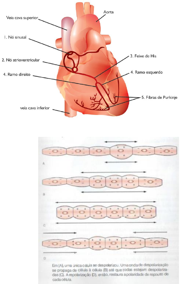 ELETROCARDIOGRAMA ESSENCIAL O SISTEMA EXCITO-CONDUTOR • Nodo sinusal Onde se inicia o estímulo cardíaco normal. Se localiza na emergência da veia cava superior com o átrio direito • Feixes interatrial (feixe de Beckman) e internodal Conduz o estímulo para o átrio E e para o nódulo AV (a partir do nodo sinusal). Existem 3 feixes internodais • Nódulo átrio-ventricular Retarda o estímulo para que ocorra a contração atrial antes da ventricular. • Feixe de His Ramo esquerdo: ântero-superior e póstero-inferior. Ramo direito. • Sistema de Purkinje A ELETRICIDADE E O CORAÇÃO • As células cardíacas em seu estado de repouso, são eletricamente polarizadas, ou seja, seu meio interno é carregado negativamente em relação ao seu meio externo. • As células cardíacas podem perder a sua negatividade interna em um processo chamado despolarização → evento elétrico fundamental do coração. • Em algumas células (células marca passo), a despolarização ocorre espontaneamente. Em outras é iniciada pela chegada de um impulso elétrico que leva ions carregados positivamente a atravessar a membrana celular. • A onda de despolarização pode ser detectada por eletrodos colocados na superfície do corpo • Após a despolarização estar completa, as células cardíacas restauram a sua polaridade de repouso por meio de um processo chamado repolarização, realizado pelas bombas transmembrana, que inventem o fluxo de íons. CÉLULAS CARDÍACAS: TIPOS E PROPRIEDADES • Do ponto de vista do eletrocardiografista, coração possui 3 tipos de células o CÉLULAS DE MARCA PASSO: em condições normais, a fonte normal de eletricidade do coração São capazes de se despolarizar espontaneamente de forma repetida. Cada despolarização espontânea serve como fonte de uma onda de despolarização que inicia um ciclo cardíaco completo de contração e relaxamento. O ciclo elétrico de despolarização e repolarização de uma punica célula registrado como traçado elétrico = potencial de ação. As células de marca passo dominantes no coração estão localizadas em posição elevada no AD – nó sinoatral (SA) Estimulação simpática pela adrenalina acelera Estimulação vagal desacelera Cada célula no coração tem a capacidade de se comportar como uma célula de marca-passo, essa capacidade normalmente é suprimida, a não ser que as células dominantes do no SA falhem ou que algo estimule o seu comportamento automático. o CELULAS DE CONDUÇÃO ELÉTRICA: o circuito de fios do coração. Células finas e longas que transportam corrente de forma rápida e eficiente para regiões distantes no coração. Feixe de Bachman: no topo do septo intra atrial, permite a rápida ativação AD → AE Sistema purkinje: nos ventrículos o CÉLULAS MIOCÁRDICAS: maquina contrátil do coração Grande maioria do tecido cardíaco, contém abundancia das proteínas contráteis actina e miosina. Quando a onda de despolarização atinge uma célula miocárdica, o cálcio é liberado para dentro da célula, levando-a a se contrair. TEMPO E VOLTAGEM As ondas que aparecem em um ECG refletem primariamente a atividade elétrica das células miocárdicas (que compõe a vasta maioria do coração). As ondas possuem 3 características principais: • Duração (segundos) • Amplitude (mV) • Configuração (subjetivo, se refere a forma e ao aspecto de uma onda) Papel do ECG • Eixo horizontal: mede o tempo Quadradinho: 0,04s / Quadradão: 0,2 segundos • Eixo vertical: mede a voltagem Quadradinho: 0,1 mV / Quadradão: 0,5 mV Automatismo • Todas as células cardíacas são excitáveis quando recebem um estimulo adequado. Entretanto, somente células especializadas podem atingir o potencial limiar sem a necessidade de estímulos externos. • Aqui as células se auto estimulam. O automatismo é a capacidade de autogerar o estímulo. • O automatismo acontece porque cargas positivas entram na célula, fazendo com que ela atinja seu potencial limiar, gerando o potencial de ação. Refratariedade • É a inabilidade de uma célula responder a um estímulo por ter sido a muito pouco tempo ativada por um estímulo prévio. • Após a fase 0 do PAT existe um período que por mais forte que seja o estímulo ele não consegue produzir um novo estímulo – PRA (período refratário absoluto) • Segue-se um período curto onde, apesar de um mais elevado limiar de estimulação, um forte estímulo poderá excitar a célula – PRR (período refratário relativo) • No ECG: Não adianta haver estímulo no segmento ST porque a célula será refratária (PRA). Entretanto, na fase ascendente da onda T (período vulnerável de Wiggers), há a chance da célula ser responsiva (caso o estímulo seja forte). Condutividade • O estímulo gerado no nodo sinusal deve ser conduzido para o restaste do coração. • Um importante determinante da velocidade de condução é a magnitude do influxo de Na+ que é refletida pela amplitude de PAT, que depende do nível do potencial de repouso no momento da estimulação (-95mV é o ideal). • Quando o potencial de repouso está em torno de -70 mV, alguns dos canais de Na+ não vão estar disponíveis para se abrirem, resultando em um menor influxo de Na+, consequentemente um PAT de pior qualidade, onde a fase 0 progressivamente diminui a medida que o impulso se propaga – Condução decremental A condução vai diminuindo de célula para célula, até chegar uma hora em que ela para. Esta situação é responsável pelos bloqueios (bloqueio de ramo D e E), que são doenças em que as células não têm um potencial de qualidade e não conseguem passar o estímulo adiante. • A condução na fibra cardíaca é um fenômeno puramente elétrico, progride por contiguidade, sem a intervenção de mediadores químicos ou estrutura sináptica – Sincício funcional: Discos intercalados (Gap junctions) • Polarização diastólica: Potencial de repouso - 90 mV É d