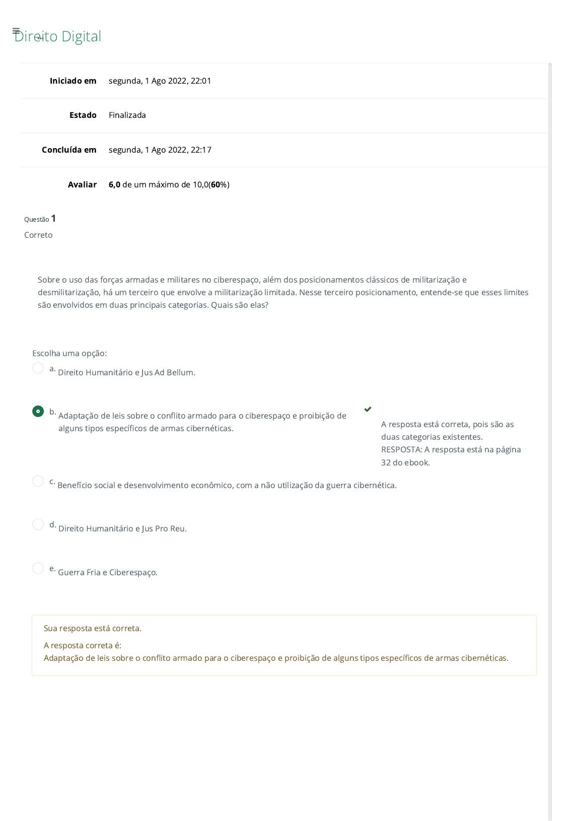 Direito Digital Iniciado em segunda, 1 Ago 2022, 22:01 Estado Finalizada Concluída em segunda, 1 Ago 2022, 22:17 Avaliar 6,0 de um máximo de 10,0(60%) Questão 1 Correto Sobre o uso das forças armadas e militares no ciberespaço, além dos posicionamentos clássicos de militarização e desmilitarização, há um terceiro que envolve a militarização limitada. Nesse terceiro posicionamento, entende-se que esses limites são envolvidos em duas principais categorias. Quais são elas? Escolha uma opção: a. Direito Humanitário e Jus Ad Bellum. b. Adaptação de leis sobre o con�ito armado para o ciberespaço e proibição de alguns tipos especí�cos de armas cibernéticas. A resposta está correta, pois são as duas categorias existentes. RESPOSTA: A resposta está na página 32 do ebook. c. Benefício social e desenvolvimento econômico, com a não utilização da guerra cibernética. d. Direito Humanitário e Jus Pro Reu. e. Guerra Fria e Ciberespaço. Sua resposta está correta. A resposta correta é: Adaptação de leis sobre o con�ito armado para o ciberespaço e proibição de alguns tipos especí�cos de armas cibernéticas. https://aula.fael.edu.br/ Questão 2 Correto O Brasil prevê a possibilidade de crimes que possuem seus resultados em mais de um local diferente, seja no Brasil ou em outro território. Apesar de não especi�car o caso do ciberespaço nessa norma, alguns autores acreditam que ele pode ser aplicado. Acerca dessa previsão, assinale a resposta correta de acordo com o ordenamento penal brasileiro: Escolha uma opção: a. Nos casos de quaisquer condutas criminosas iniciadas fora do Brasil e consumadas aqui, o Brasil nunca será o local competente. b. Quando o último ato de execução acontece fora do Brasil, a competência é �rmada pela prevenção. c. Caso uma ação criminosa tiver seu local incerto e não sabido, restando dúvidas entre limites de jurisdições, a competência é �rmada pela prevenção. A resposta está correta, pois é o que prevê o Código Penal. RESPOSTA: A resposta está na página 27 do ebook. d. Quando o local de execução de crimes for incerto, a competência será sempre determinada pelo local de domicílio do réu. e. Quando um ato de execução acontece no Brasil, mas o resultado em outro país soberano, a competência será sempre do Brasil. Sua resposta está correta. A resposta correta é: Caso uma ação criminosa tiver seu local incerto e não sabido, restando dúvidas entre limites de jurisdições, a competência é �rmada pela prevenção. https://aula.fael.edu.br/ Questão 3 Correto Uma das principais novidades trazidas pela lei do marco civil da internet é a que proíbe a manipulação de velocidades e a limitação de dados da internet, promovendo uma maior igualdade social entre os seus usuários aqui no Brasil. Como essa novidade é chamada no marco civil? Escolha uma opção: a. Velocidade da rede. b. Realização de negócios na rede. c. Neutralidade da rede. A resposta está correta, pois o enunciado se refere à neutralidade da rede. RESPOSTA: A resposta está na página 18 do ebook. d. Privacidade da rede. e. Serviço do provedor da rede. Sua resposta está correta. A resposta correta é: Neutralidade da rede. https://aula.fael.edu.br/ Questão 4 Incorreto Quando analisamos um tipo penal trazido em nosso Código Penal, costumamos compreendê-lo com base a classi�cação do seu tipo para melhor entender como ele se aplica nos casos práticos. Sabendo disso, a classi�cação do tipo penal do artigo trazido pela Lei Carolina Dieckmann contém todas as opções das alternativas abaixo, com a exceção de uma. Assinale-a. Escolha uma opção: a. Invasão de dispositivo informático. b. Invasão de dispositivo eletrônico. c. Invasão e violação de dispositivos digitais. d. Crime doloso. e. Extorsão cibernética. Sua resposta está incorreta. A resposta correta é: Crime doloso. https://aula.fael.edu.br/ Questão 5 Correto Vivemos em um contexto mundial com a presença constante de novas tecnologias da informação do ciberespaço, que acabam interferindo nas vidas dos membros da sociedade da informação. Sobre o ciberespaço, assinale a alternativa correta. Escolha uma opção: a. A administração do ciberespaço é dos países soberanos, mas seu controle é dos indivíduos. b. O ciberespaço deve conter pelo menos uma autoridade interna responsável pela feitura de regras especí�cas. c. A governança do ciberespaço ainda não é algo completamente decidido, o que justi�ca a di�culdade em governá-lo. A resposta está correta, pois é o tema ainda faz parte de discussões internacionais. RESPOSTA: A resposta está na página 09 do ebook. d. O domínio do ciberespaço é de acordo com a soberania de cada país. e. O ciberespaço não possui qualquer controle, sendo um universo desconhecido. Sua resposta está correta. A resposta correta é: A governança do ciberespaço ainda não é algo completamente decidido, o que justi�ca a di�culdade em governá-lo. https://aula.fael.edu.br/ Questão 6 Correto Um dos objetos de proteção do direito é a propriedade intelectual, que, inclusive, pode ser objeto de espécies de crimes cibernéticos. Sobre a propriedade intelectual, assinale a alternativa que contém os seus tipos conforme classi�cação estudada. Escolha uma opção: a. Propriedade industrial e cibernética. b. Obras do design industrial, do trademark, patente, assim como performances de artistas. c. Copyright, que se divide em patente, trademark, design industrial e propriedade industrial. d. Propriedade industrial, que se divide em patente, trademark e design industrial, e copyright. A resposta está correta, pois representa os tipos de propriedade intelectual, RESPOSTA: A resposta está na página 33 do ebook. e. Propriedade industrial, que se divide em copyright, patente, obras, trademark e design. Sua resposta está correta. A resposta correta é: Propriedade industri