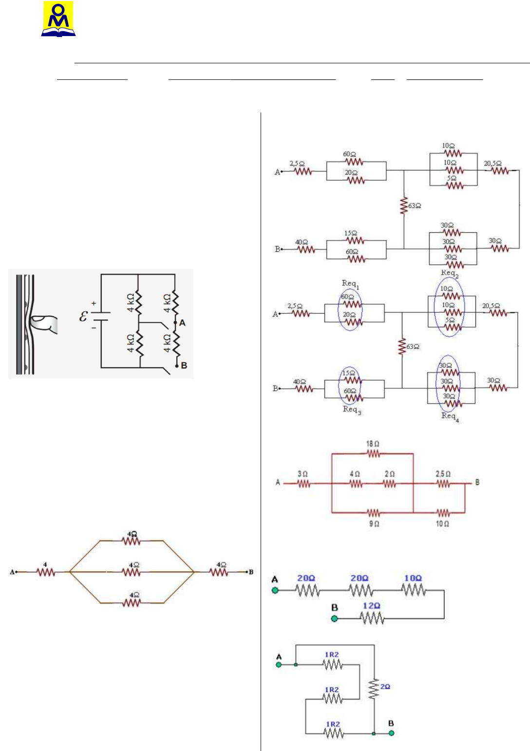 1. Enem - 2018 Muitos smartphones e tablets não precisam mais de teclas, uma vez que todos os comandos podem ser dados ao se pressionar a própria tela. Inicialmente essa tecnologia foi proporcionada por meio das telas resistivas, formadas basicamente por duas camadas de material condutor transparente que não se encostam até que alguém as pressione, modificando a resistência total do circuito de acordo com o ponto onde ocorre o toque. A imagem é uma simplificação do circuito formado pelas placas, em que A e B representam pontos onde o circuito pode ser fechado por meio do toque. Qual é a resistência equivalente no circuito provocada por um toque que fecha o circuito no ponto A? a) 1,3 kΩ b) 4,0 kΩ c) 6,0 kΩ d) 6,7 kΩ e) 12,0 kΩ 2. Determine a resistência equivalente entre os terminais A e B da seguinte associação de resistores: 3. Determine a resistência equivalente do seguinte circuito: 4. Qual a resistência total do circuito abaixo? COLÉGIO “PE OTÁVIO MOREIRA” RUA JAIME DOS SANTOS NEVES, 20 - BARRA MARATAÍZES – ES – 29.349-000 (28) 3532-2160 Nota__________ Alunos(a): Série: 3º Turma: Única Data: / / 2022 Profº: Vinicius Mardegan Disciplina: Física Valor: xxxxxx