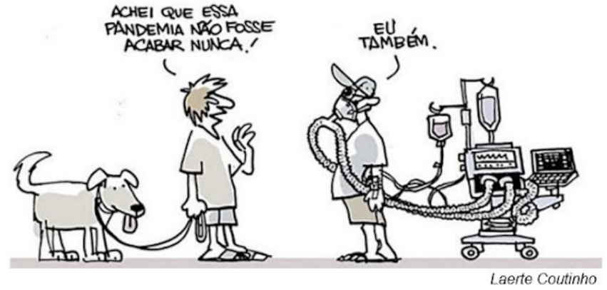 1) A finalidade do texto é: A) Trazer argumentos e opiniões para convencer o leitor. B) Criticar acontecimentos atuais de interesse público. C) Apresentar uma mensagem informativa para o leitor. D) Narrar uma história cômica para divertir as pessoas 2) No texto, é possível concluir que a pandemia do Coronavírus A) Chegou ao fim, todavia, deixou consequências trágicas para muitas pessoas. B) Deixou toda a população doente e acamada em hospitais do Brasil. C) Permitiu que as pessoas se tornassem mais preocupadas com as outras. D) Nunca vai acabar, pois as pessoas ainda continuam sem usar máscaras. 3) Através de qual elemento é possível compreender a mensagem principal do texto? A) A imagem do cachorro. B) A fala do primeiro homem. C) O aparelho de oxigênio. D) A idade avançada do segundo homem. 4) O texto em estudo pertence à esfera A) Religiosa. B) Jornalística. C) Literária. D) Publicitária. 5) A principal finalidade do texto é A) Trazer uma reflexão. B) Apresentar uma crítica. C) Provocar humor. D) Expor uma informação. 6) A charge revela, sobretudo, que A) As pessoas estão com medo de serem assaltadas nas ruas. B) O medo da contaminação é superior ao medo de armas. C) As mulheres estão sendo atacadas constantemente. D) Os doentes estão contaminando as pessoas nas ruas. 7) Na charge, é possível identificar uma linguagem coloquial, normalmente usada pelas pessoas em situações informais. A palavra usada pelo homem que na linguagem culta não está adequada é: A) “RÁPIDO” B) “DONA” C) “PASSA” D) “ESPIRRO” 8) A palavra utilizada pelo homem que indica ideia condicional é: A) “SE” B) “BOLSA” C) “NÃO” D) “EU” 9) A expressão da mulher na charge revela que ela está A) Inquieta. B) Indignada. C) Exultante. D) Atemorizada. 10) No trecho: “... não fosse acabar nunca. ”, a palavra em destaque estabelece ideia de A) Negação. B) Dúvida. C) Modo. D) Tempo.
