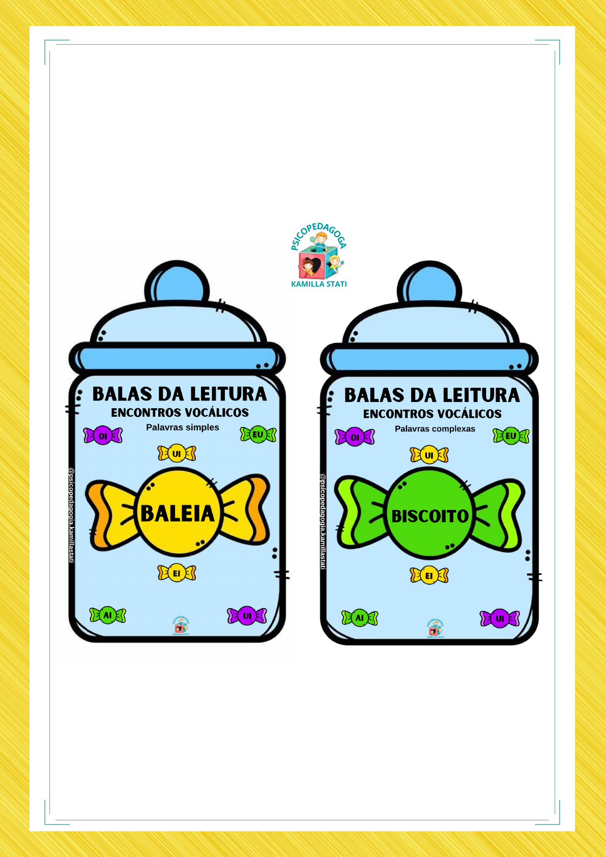MEU KIT QUEBRA CABEÇA Recurso criado e elaborado pela Psicopedagoga Kamilla Stati Proibida a distribuição e venda não autorizada! BALAS DA LEITURA ENCONTROS VOCÁLICOS COMPOSTO POR 100 FICHAS DE LEITURA SENDO 5O SIMPLES E 50 COMPLEXAS Recurso criado e desenvolvido pela Psicopedagoga Kamilla Stati. Todos os direitos reservados. Ba la s d a l ei tu ra En co n tr o s v o cá li co s O i Eu U i Ei A i U i Proibido a distribuição e venda não autorizada desse material. @ ps ic op ed ag og ia .k am ill as ta ti Ba la s d a l ei tu ra En co n tr o s v o cá li co s Ba le ia O i Eu U i Ei A i U i @psicopedagogia.kamillastati @psicopedagogia.kamillastati Pa la vr as s im pl es Pa la vr as c om pl ex as IM P R IM IR 2 X Bi sc o it o Recurso criado e desenvolvido pela Psicopedagoga Kamilla Stati. Todos os direitos reservados. Proibido a distribuição e venda não autorizada desse material. Ai Oi Ei Ui Eu Ia Ao Uai Ou Uau Recurso criado e desenvolvido pela Psicopedagoga Kamilla Stati. Todos os direitos reservados. Proibido a distribuição e venda não autorizada desse material. Baleia Areia Rei Meu Teia Meia Seria Ceia Feia Aveia Recurso criado e desenvolvido pela Psicopedagoga Kamilla Stati. Todos os direitos reservados. Proibido a distribuição e venda não autorizada desse material. Teu Deu Seu Leu Roeu Moeu Doeu Tomou Viveu Valeu Recurso criado e desenvolvido pela Psicopedagoga Kamilla Stati. Todos os direitos reservados. Proibido a distribuição e venda não autorizada desse material. Releia Ideia Semeia Rodeio Cadeia Goleiro Receita Janeiro Bueiro Saleiro Recurso criado e desenvolvido pela Psicopedagoga Kamilla Stati. Todos os direitos reservados. Proibido a distribuição e venda não autorizada desse material. Odeio Amei Acabou Bebeu Afiou Amou Faixa Veia Caixa Sujeira Recurso criado e desenvolvido pela Psicopedagoga Kamilla Stati. Todos os direitos reservados. Proibido a distribuição e venda não autorizada desse material. Chaveiro Achou Sorteia Saqueia Recreio Lancheira Recheio Mosquito Passeio Biscoito Recurso criado e desenvolvido pela Psicopedagoga Kamilla Stati. Todos os direitos reservados. Proibido a distribuição e venda não autorizada desse material. Bombeia Barbeiro Aquário Rastreia Quadro Sombreia Humilhou Honrou Herdou Grudou Recurso criado e desenvolvido pela Psicopedagoga Kamilla Stati. Todos os direitos reservados. Proibido a distribuição e venda não autorizada desse material. Gravou Hospedou Hibernou Guinchou Estarei Zoológico Melancia Joelho Assoprei Hambúrguer Recurso criado e desenvolvido pela Psicopedagoga Kamilla Stati. Todos os direitos reservados. Proibido a distribuição e venda não autorizada desse material. Sentou Travesseiro Mangueira Manteiga Pedreiro Cabeleireiro Vassoura Chuveiro Álcool Amendoim Recurso criado e desenvolvido pela Psicopedagoga Kamilla Stati. Todos os direitos reservados. Proibido a distribuição e venda não autorizada desse material. Bombeiro Fogueira Torneira Vulcão Brigadeiro Piquenique Quente Joaninha Língua Batedeira Recurso criado e desenvolvido pela Psicopedagoga Kamilla Stati. Todos os direitos reservados. Instruções: -APÓS ADQUIRIR O PDF VOCÊ VAI IMPRIMIR DUAS VEZES AS FICHAS DA PÁGINA 2, RECORTAR E COLOCAR UMA FOLHA SULFITE ATRÁS PARA PODER SER GUARDADO AS FICHAS DE BALAS DENTO DO ENVELOPE. CADA ENVELOPE SUPORTA 25 FICHAS DE BALAS. POR ISSO PRECISA IMPRIMIR 2×. A CRIANÇA VAI FAZER A LEITURA DE FORMA LÚDICA E DIVERTIDA, PEGANDO AS FICHAS DE BALA E LENDO. Pronto vai ficar assim: Direitos de imagens Ainda ficou com dúvidas só chamar no Whatsapp (43)998659903 TERMOS DE USO: @psicopedagogia.kamillastati _RECURSO CRIADO E DESENVOLVIDO PELA PSICOPEDAGOGA KAMILLA STATI, ESSE MATERIAL TEM DIREITOS AUTORAIS. _PROIBIDA A DISTRIBUIÇÃO E VENDA NÃO AUTORIZADA DESTE PRODUTO. VIU ALGO ESTRANHO: DENUNCIE ! _RESPEITE OS TERMOS DE USO PARA EVITAR ABORRECIMENTOS. _USO PESSOAL, EM ESCOLAS E CLÍNICAS. _NÃO É PERMITO COMPARTILHAR. _LEI N°9.610, 19 DE FEVEREIRO DE 1988/CRIME DE VIOLAÇÃO AOS DIREITOS AUTORAIS NO ART. 184 INSTAGRAM: @psicopedagogia.kamillastati PÁGINA: www.facebook.com/psicopedagogia.kamillastati GRUPO:www.facebook.com/psicopedagogia.educacional WHATSAPP: (43) 998659903 Redes Sociais: