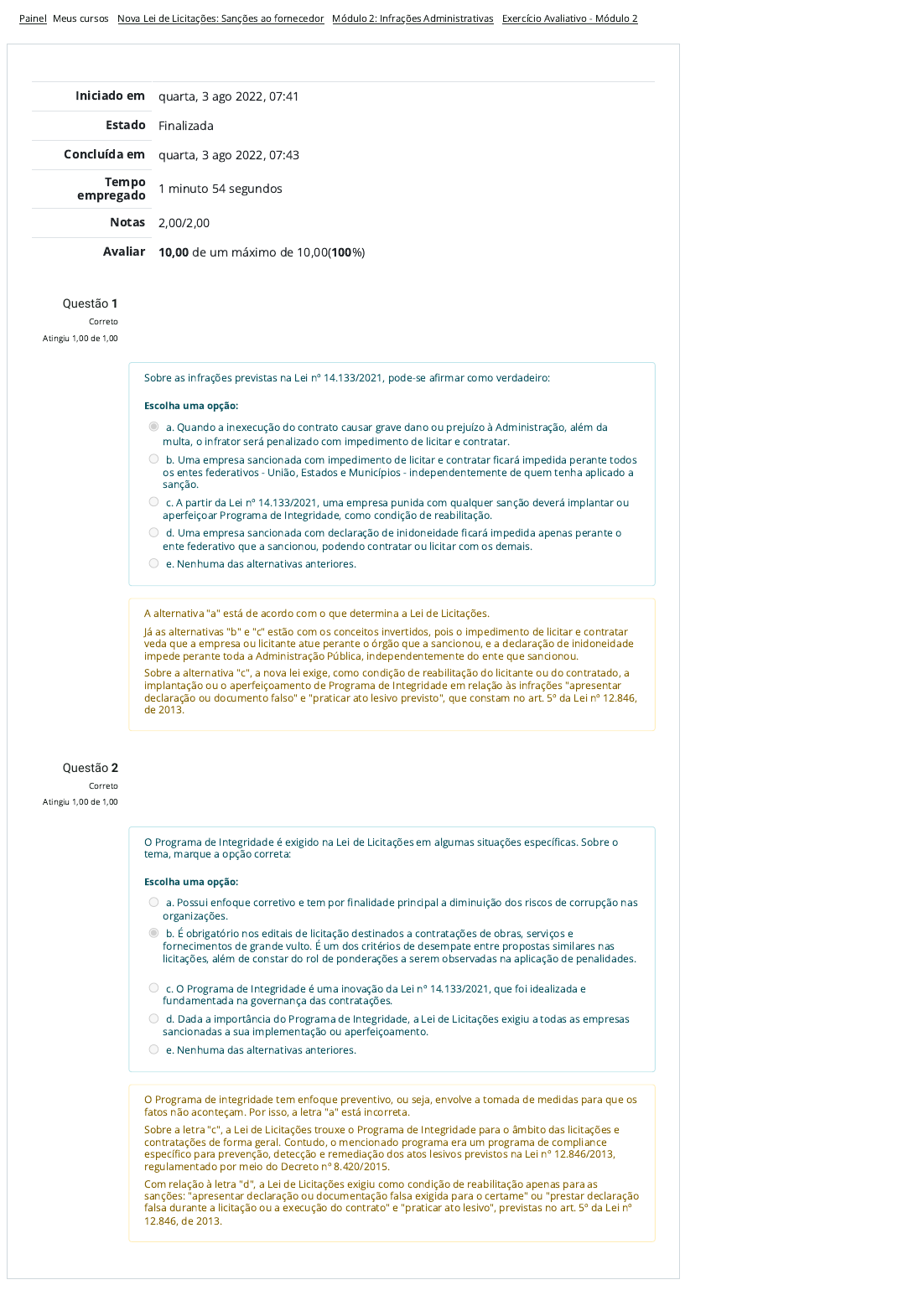Painel Meus cursos Nova Lei de Licitações: Sanções ao fornecedor Módulo 2: Infrações Administrativas Exercício Avaliativo - Módulo 2 Iniciado em quarta, 3 ago 2022, 07:41 Estado Finalizada Concluída em quarta, 3 ago 2022, 07:43 Tempo empregado 1 minuto 54 segundos Notas 2,00/2,00 Avaliar 10,00 de um máximo de 10,00(100%) Questão 1 Correto Atingiu 1,00 de 1,00 Questão 2 Correto Atingiu 1,00 de 1,00 Sobre as infrações previstas na Lei nº 14.133/2021, pode-se afirmar como verdadeiro: Escolha uma opção: a. Quando a inexecução do contrato causar grave dano ou prejuízo à Administração, além da multa, o infrator será penalizado com impedimento de licitar e contratar. b. Uma empresa sancionada com impedimento de licitar e contratar ficará impedida perante todos os entes federativos - União, Estados e Municípios - independentemente de quem tenha aplicado a sanção. c. A partir da Lei nº 14.133/2021, uma empresa punida com qualquer sanção deverá implantar ou aperfeiçoar Programa de Integridade, como condição de reabilitação. d. Uma empresa sancionada com declaração de inidoneidade ficará impedida apenas perante o ente federativo que a sancionou, podendo contratar ou licitar com os demais. e. Nenhuma das alternativas anteriores. A alternativa "a" está de acordo com o que determina a Lei de Licitações. Já as alternativas "b" e "c" estão com os conceitos invertidos, pois o impedimento de licitar e contratar veda que a empresa ou licitante atue perante o órgão que a sancionou, e a declaração de inidoneidade impede perante toda a Administração Pública, independentemente do ente que sancionou. Sobre a alternativa "c", a nova lei exige, como condição de reabilitação do licitante ou do contratado, a implantação ou o aperfeiçoamento de Programa de Integridade em relação às infrações "apresentar declaração ou documento falso" e "praticar ato lesivo previsto", que constam no art. 5º da Lei nº 12.846, de 2013. O Programa de Integridade é exigido na Lei de Licitações em algumas situações específicas. Sobre o tema, marque a opção correta: Escolha uma opção: a. Possui enfoque corretivo e tem por finalidade principal a diminuição dos riscos de corrupção nas organizações. b. É obrigatório nos editais de licitação destinados a contratações de obras, serviços e fornecimentos de grande vulto. É um dos critérios de desempate entre propostas similares nas licitações, além de constar do rol de ponderações a serem observadas na aplicação de penalidades. c. O Programa de Integridade é uma inovação da Lei nº 14.133/2021, que foi idealizada e fundamentada na governança das contratações. d. Dada a importância do Programa de Integridade, a Lei de Licitações exigiu a todas as empresas sancionadas a sua implementação ou aperfeiçoamento. e. Nenhuma das alternativas anteriores. O Programa de integridade tem enfoque preventivo, ou seja, envolve a tomada de medidas para que os fatos não aconteçam. Por isso, a letra "a" está incorreta. Sobre a letra "c", a Lei de Licitações trouxe o Programa de Integridade para o âmbito das licitações e contratações de forma geral. Contudo, o mencionado programa era um programa de compliance específico para prevenção, detecção e remediação dos atos lesivos previstos na Lei nº 12.846/2013, regulamentado por meio do Decreto nº 8.420/2015. Com relação à letra "d", a Lei de Licitações exigiu como condição de reabilitação apenas para as sanções: "apresentar declaração ou documentação falsa exigida para o certame" ou "prestar declaração falsa durante a licitação ou a execução do contrato" e "praticar ato lesivo", previstas no art. 5º da Lei nº 12.846, de 2013. https://mooc38.escolavirtual.gov.br/my/ https://mooc38.escolavirtual.gov.br/course/view.php?id=6298 https://mooc38.escolavirtual.gov.br/course/view.php?id=6298#section-2 https://mooc38.escolavirtual.gov.br/mod/quiz/view.php?id=120356