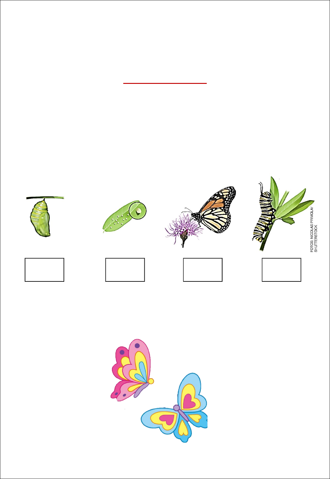 NOME: __________________________________________________ DATA: _____________________ BNCC (EF03CI05) Descrever e comunicar as alterações que ocorrem desde o nascimento em animais de diferentes meios terrestres ou aquáticos, inclusive o homem. ANIMAIS Coloque os números na ordem em que acontece as fases do ciclo de vida da borboleta.