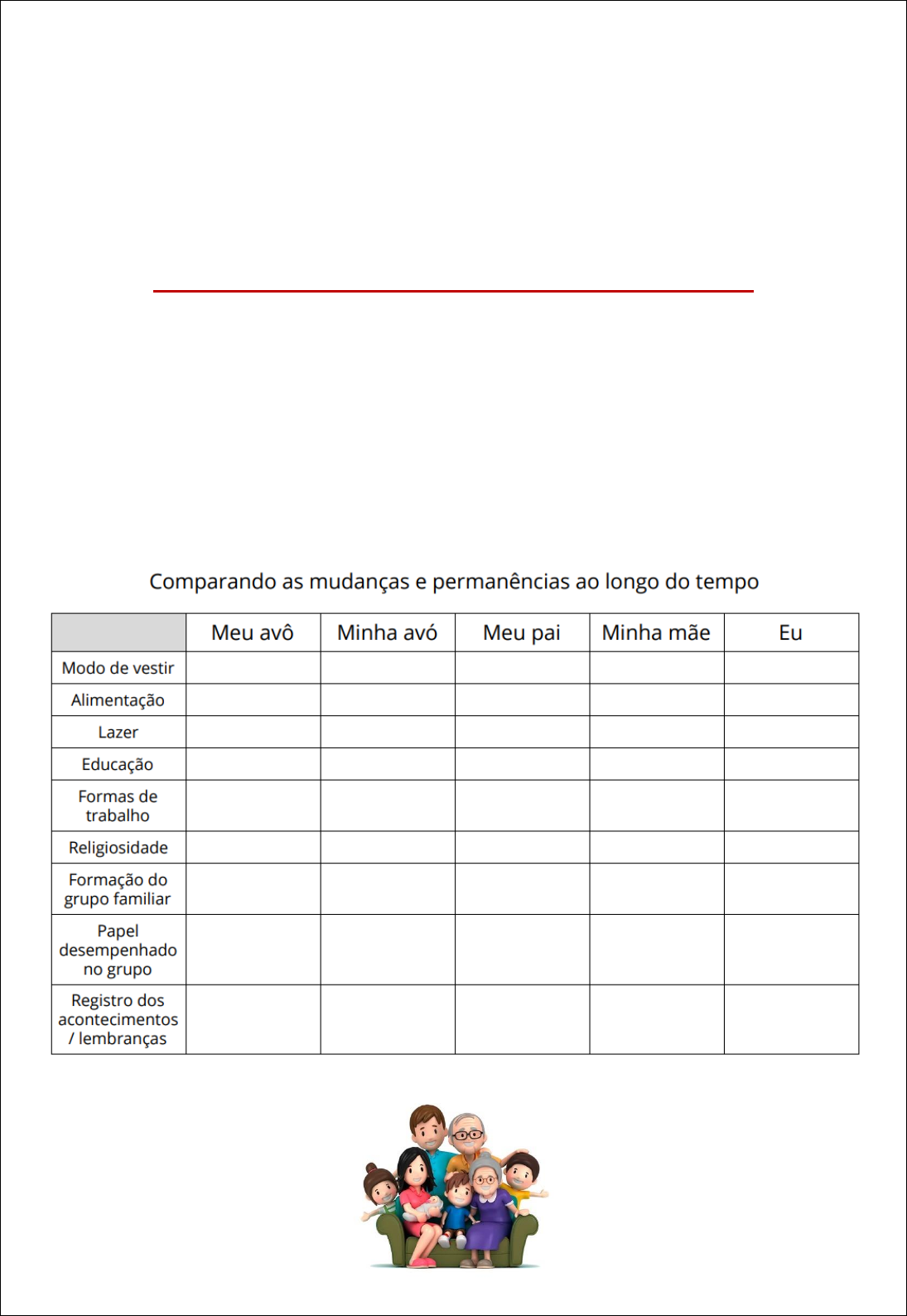 NOME: __________________________________________________ DATA: _____________________ BNCC (EF04HI01) Reconhecer a história como resultado da ação do ser humano no tempo e no espaço, com base na identificação de mudanças e permanências ao longo do tempo. PESQUISA EM FAMÍLIA REALIZE UMA PESQUISA COM SEUS FAMILIARES E DESCUBRA COMO ERAM ALGUNS COSTUMES DE ANTIGAMENTE (MODO DE SE VESTIR, TIPO DE TRABALHO, ETC.). DEPOIS PREENCHA A TABELA ABAIXO E COMPARE A DIFERENÇA DE AGORA E DE ALGUNS ANOS ATRÁS: