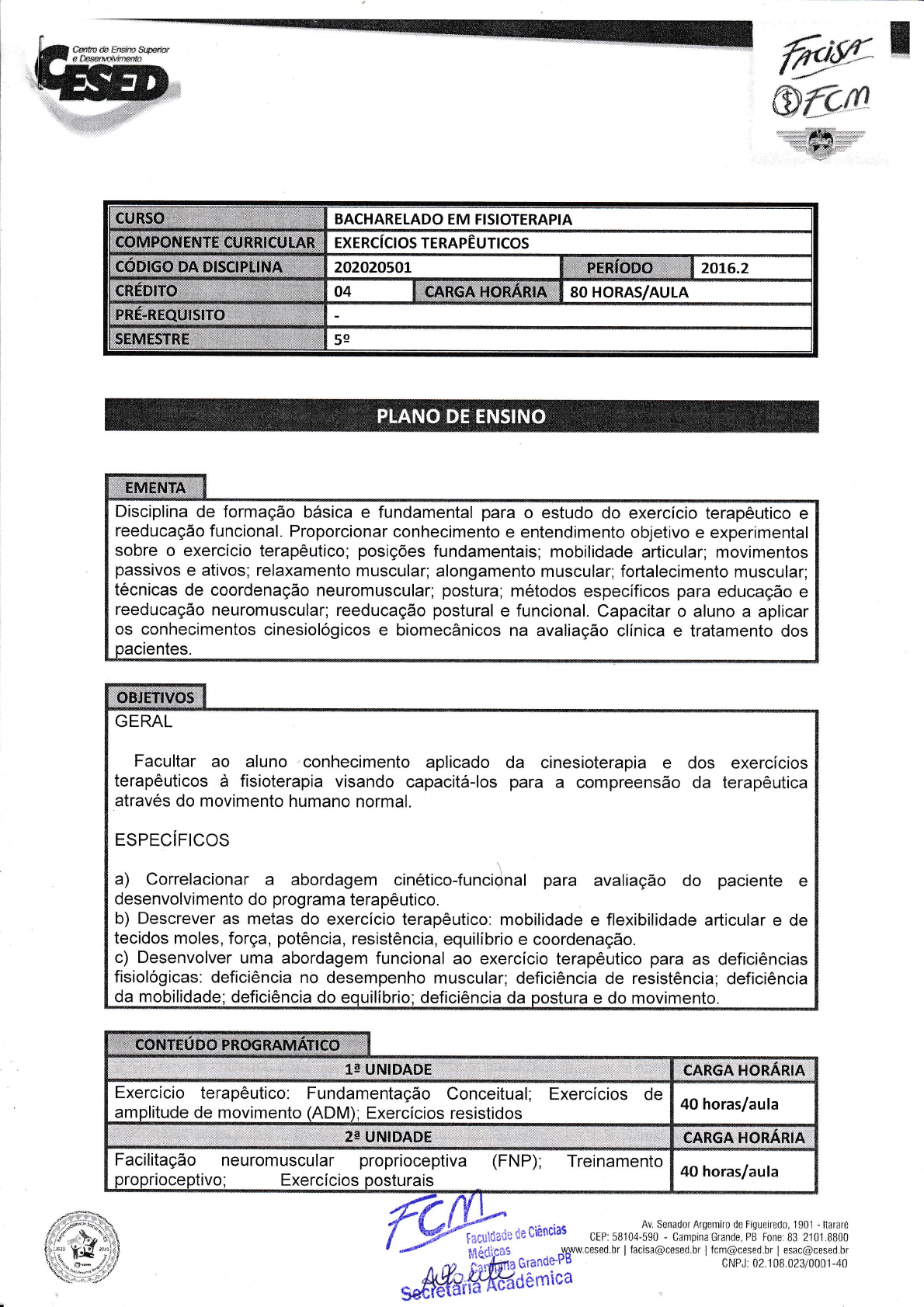 ffi# ffiffids "-.,+sr '')'?1 ::rlr § BACHARELADO EM FISIOTERAPIA EXERCíCIOS TERAPÊUTICOS 20t6.2202020501 80 HORAS/AULAo4 5e Disciplina de formação básica e fundamental para o estudo do exercício terapêutico e reeducação funcional. Proporcionar conhecimento e entendimento objetivo e experimental sobre o exercício terapêutico; posições fundamentais; mobilidade articular; movimentos passivos e ativos; relaxamento muscular; alongamento muscular; fortalecimento muscular; técnicas de coordenação neuromuscular; postura; métodos específicos para educação e reeducação neuromuscular; reeducação postural e funcional. Capacitar o aluno a aplicar os conhecimentos cinesiologicos e biomecânicos na avaliação clínica e tratamento dos cientes Facultar ao aluno 'conhecimento aplicado da cinesioterapia e dos exercícios terapêuticos à fisioterapia visando capacitá-los para a compreensâo da terapêutica através do movimento humano normal. ESPECíFICOS a) Correlacionar a abordagem cinético-funciànal para avaliação do paciente e desenvolvimento do programa terapêutico. b) Descrever as metas do exercício terapêutico: mobilidade e flexibilidade articular e de tecidos moles, força, potência, resistência, equilíbrio e coordenação. c) Desenvolver uma abordagem funcional ao exercício terapêutico para as deficiências fisiológicas: deficiência no desempenho muscular; deficiência de resistência; deficiência GERAL da mobilidade stura e do movimentodeficiência do uilíbrio deficiência da Exercício terapêutico: Fundamentação Conceitual; Exercícios de Exercícios resistidosam itude de movimento ADNN 40 horas/aula proprioceptiva (FNP); TreinamentoFacilitação neuromuscular Exercícios osturais 40 horas/aula faculdade de Ciâncias cEp: sB v,rww cesed hr GrandePB Av. Senad0r Arflemir0 de Fiqui]ireíJo, 1§lü1 - ltãrare 104-590 - Cantpina0rande PB toner83 2101 BBí10 | Íacisa@cesed.br I f0m@cesed br I esac(Gtcesed.br CNP,I; 02. 1 08 023i000 1-40 $1ica SLFffkr ffi M;."*,Yç*' § ffitrí-(t\1(.§/ Estratégias de ensino - para o desenvolvimento do conteúdo aplicar-se-ão: Aulas expositivas dialogadas, estudo e discussão de textos, casos (estudo de extra-classe executadas em grupo e outros. casos), atividades unidacles. berl corrro no fiual cle cada unra delas. serrclo a obtenção de ntédia: Durante as unidades serão avaliados os itens: Participação em sala de aula e assiduídade. Serão realizadas avaliações contínuas durante o semestre, objetivando manter o aluno em constante estado de atualização em relação ao conteúdo estudaão; No final de cada unidade, os itens a serem levados em conta serão: desempenho nas avaliações teórica, desempenho nas avaliações prática. o a A avaliação será realizada durante as levados em conta os seguintes itens para D. Exercício terapêutico: técnicas para intervenção. Rio de Janeiro: Guanabara Koogan,2003.36l p. l-IALL' Carrie M.; BRODY, Lori Thein. Exercício terapêr-rtico na busca da furrção. I{io cle Janciro: Guanabara Koogan, 2007.786 p. KISNER,C.; COLBY L.A. Exercícios Terapêuticos - Fundarrrentos e 'l'écnicas. 4n ecl. Ilarueri: BANDY, William Manole, 2005.841 ) P. Exercícios Terapêuticos: guia teórico para estudantes e profissionais. Barueri Propedêutica ortopédica: coluna e extremidades. São paulo: Atheneu, MARQUES.AméliaPasqtral.Manual degoniornetria.2reveampl Barueri: Manole,2003.8l p. RASCH. P. J. Cinesiologia e atratot.nia aplicada. Rio de .laneiro: Guanabara Koogarr, l9t)1.204 p. 'IRIBASTONLi, F. T'ratado de Exercícios Corretivos Aplicados à ReedLrcação Motora Postural. Siio DELIBERATO, P.C. Manole, 2007 .364 p Paulo: Mano 2001 HOPPENFELD, Stanley 2005.276 p. Av. Scitad0r Argemiro de tiqltnredo, 1 !101 , ltarãre CEi':58104'590 - Campina Grande, PB tone: 83 2t0l.BB00 vru^{.cesed.br I facisa@cesed.br | Ícn(ôcesed.br I esac@}cesed.tlr CIJP,J: 02 108 023r'0001-40 I de Ciência§ Recursos técnico-pedagógicos - neste contexto utilizar-se-ão: Quadro branco, textos, equipamentos áudio-visuais (computador, data show, DVD), pesquisas na Internet, pesquisas bibliográficas sobre os conteúdos programáticos. I BIEIIIb§RAFIA BÁ§I cA.I . B I B tir$H ftAFifl üO M p, urMH r{rÀ R taculdads