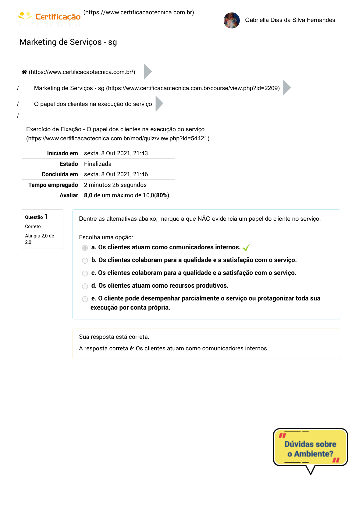 (https://www.certificacaotecnica.com.br) Gabriella Dias da Silva Fernandes Marketing de Serviços - sg Questão 1 Correto Atingiu 2,0 de 2,0 / / / Iniciado em sexta, 8 Out 2021, 21:43 Estado Finalizada Concluída em sexta, 8 Out 2021, 21:46 Tempo empregado 2 minutos 26 segundos Avaliar 8,0 de um máximo de 10,0(80%) Dentre as alternativas abaixo, marque a que NÃO evidencia um papel do cliente no serviço. Escolha uma opção: a. Os clientes atuam como comunicadores internos. b. Os clientes colaboram para a qualidade e a satisfação com o serviço. c. Os clientes colaboram para a qualidade e a satisfação com o serviço. d. Os clientes atuam como recursos produtivos. e. O cliente pode desempenhar parcialmente o serviço ou protagonizar toda sua execução por conta própria. Sua resposta está correta. A resposta correta é: Os clientes atuam como comunicadores internos.. (https://www.certificacaotecnica.com.br/) Marketing de Serviços - sg (https://www.certificacaotecnica.com.br/course/view.php?id=2209) O papel dos clientes na execução do serviço Exercício de Fixação - O papel dos clientes na execução do serviço (https://www.certificacaotecnica.com.br/mod/quiz/view.php?id=54421) https://www.certificacaotecnica.com.br/ https://www.certificacaotecnica.com.br/ https://www.certificacaotecnica.com.br/course/view.php?id=2209 https://www.certificacaotecnica.com.br/mod/quiz/view.php?id=54421 Questão 2 Correto Atingiu 2,0 de 2,0 Questão 3 Incorreto Atingiu 0,0 de 2,0 Uma vez definido o nível desejado de participação (das perspectivas do cliente e da companhia), a organização pode estabelecer com mais detalhes o papel do cliente, em síntese, a descrição de cargo do cliente. Dentre as alternativas abaixo, qual NÃO demostra adequadamente os possíveis papéis e tarefas? Escolha uma opção: a. O auxílio mútuo e a divulgação da companhia. b. A divulgação da companhia e as diferenças individuais: nem todos desejam participar. c. O auxílio de comunicação e o presencial. d. O auxílio a si próprio e as diferenças individuais: nem todos desejam participar. e. O auxílio a si próprio e o auxílio mútuo. Sua resposta está correta. A resposta correta é: O auxílio de comunicação e o presencial.. São estratégias aceitáveis para aumentar a participação do cliente: Escolha uma opção: a. Administre o mix do cliente: avalie a compatibilidade dos segmentos, eduque os clientes para seus papéis e informe as razões para participar. b. Recrute, eduque e recompense os clientes: esclareça o nível de participação, identifique as tarefas e operações específicas e entenda as implicações para a produtividade, a qualidade e a satisfação. c. Recrute, eduque e recompense os clientes: esclareça o nível de participação, identifique as tarefas e operações específicas, eduque os clientes para seus papéis, informe as razões para participar e recompense o desempenho do cliente. d. Administre o mix do cliente: avalie a compatibilidade dos segmentos, isole os segmentos incompatíveis e aprimore a compatibilidade entre segmentos. e. Defina os papéis dos clientes: identifique e recrute o(s) segmento(s) adequado(s), eduque os clientes para seus papéis, informe as razões para participar, recompense o desempenho do cliente. Sua resposta está incorreta. A resposta correta é: Administre o mix do cliente: avalie a compatibilidade dos segmentos, isole os segmentos incompatíveis e aprimore a compatibilidade entre segmentos.. Questão 4 Correto Atingiu 2,0 de 2,0 Questão 5 Correto Atingiu 2,0 de 2,0 Dentre os níveis nos quais o cliente pode participar na execução do serviço, marque a alternativa com a informação correta. Escolha uma opção: a. Nível médio de participação: é necessário que o cliente opine e dê ideias, mas não se envolve no processo. b. Todas as alternativas estão corretas. c. Nível alto de participação: clientes são como funcionários da empresa e contribuem gerando valor. d. Todas as alternativas estão incorretas. e. Nível baixo de participação: o cliente dá pequenas ideias, mas não comparece à empresa. Sua resposta está correta. A resposta correta é: Nível alto de participação: clientes são como funcionários da empresa e contribuem gerando valor.. O cliente pode exercer o papel de concorrente na execução do serviço, pois passa a dominar os processos existentes na empresa. Porém, para que o cliente exerça essa função, são necessárias algumas capacidades. Qual das alternativas abaixo apresenta capacidades compatíveis? Escolha uma opção: a. Capacidade da experiência e de recursos. b. Todas as alternativas estão corretas c. A confiança e o controle. d. Capacidade de tempo e de recursos. e. Recompensas econômicas e de cunho psicológico. Sua resposta está correta. A resposta correta é: Todas as alternativas estão corretas.