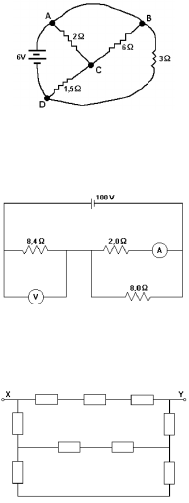 EXERCÍCIOS DE FENÔMENOS FISICOS E QUIMICOS E SUAS APLICAÇÕES III – LISTA 2 1. No circuito mostrado a seguir, calcule a corrente fornecida pela bateria e a corrente que circula através do resistor de 6 Ω. Resposta: 4 A e 0,5 A 2. No circuito a seguir, o amperímetro e o voltímetro são ideais. Calcule a indicação destes aparelhos. Resposta: 8 A e 84 V 3. O valor de cada resistor, no circuito representado no esquema a seguir, é de 10 Ω. Calcule a resistência equivalente entre os terminais X e Y, em ohms. Resposta: 15 4. Numa rede elétrica, submetida a uma tensão de 110 V, foi instalado um fusível de 30 A. Quantas lâmpadas de 100 W poderão ser ligadas simultaneamente nesta rede, sem risco de queimar o fusível? Resposta: 33 5. Considere o circuito a seguir. Qual é a soma das leituras no amperímetro, em A, e no voltímetro, em V, considerando ideais os instrumentos de medida. Resposta: 80 6. Queremos obter uma resistência de 3,5 Ω com resistores iguais a 1 Ω. Das associações a seguir, julgue as possíveis. 7. No circuito as lâmpadas L1, L2 e L3 são idênticas com resistências de 30 ohms cada. A força eletromotriz vale 18 V e C é uma chave que está inicialmente fechada. a) Qual a corrente que passa por L2? b) Abrindo-se a chave C, o que acontece com o brilho da lâmpada L1? Justifique. Resposta: a) 0,2 A b) 8. No circuito, cada resistência é igual a 1 kΩ, e o gerador é uma pilha de 1,5 V. Calcule a corrente total estabelecida pelo gerador. Resposta: 3 mA 9. Na associação a seguir, a intensidade de corrente i que passa pelo resistor de 14 Ω é 3 A. Calcule as leituras do amperímetro A e do voltímetro V, ambos ideais. Resposta: 2 A e 7 V 10. Um circuito e formado de duas lâmpadas L1 e L2, uma fonte de 6 V e uma resistência R, conforme desenho da figura abaixo. As lâmpadas estão acessas e funcionando em seus valores nominais (L1: 0,6 W e 3 V, L2: 0,3 W e 3 V). Calcule o valor da resistência R. Resposta: 30Ω 11. Algumas residências recebem três fios da rede de energia elétrica, sendo dois fios correspondentes às fases e o terceiro ao neutro. Os equipamentos existentes nas residências são projetados para serem ligados entre uma fase e um neutro (por exemplo, uma lâmpada) ou entre fases (por exemplo, um chuveiro). Considere o circuito abaixo, que representa, de forma muito simplificada, uma instalação elétrica residencial. As fases são representadas por fontes de tensão em corrente continua e os equipamentos, representados por resistências. Apesar de simplificado, o circuito pode dar uma ideia das consequências de uma eventual ruptura do fio neutro. Considere que todos os equipamentos estejam ligados ao mesmo tempo. a) Calcule a corrente que circula pelo chuveiro. b) Qual é o consumo de energia elétrica da residência em kWh durante quinze minutos? c) Considerando que os equipamentos se queimam quando operam com uma potência 10% acima da normal (indicada na figura), determine quais serão os equipamentos queimados caso o fio neutro se rompa no ponto A. Resposta: a) 20 A b) 1,25 kWh c) 12. Na figura, a resistência de cada resistor está expressa em ohms. Sabendo que UAB=100 V, calcule as leituras do voltímetro e do amperímetro, considerados ideais. Resposta: 40 V e 1,25 A 13. No circuito esquematizado na figura, os fios AK e BJ tem resistências desprezíveis (quando comparadas a 12 Ω) e não se tocam. a) Calcule a resistência equivalente entre A e B. b) Calcule as intensidades das correntes nos fios AK e BJ. Resposta: a) R(eq) = 4 Ω b) i(AK) = 2 A i(BJ) 29 14. O circuito testador mostrado na figura adiante ocorre em certos tipos de pilhas e é construído sobre uma folha de plástico, como mostra o diagrama. Os condutores (cinza claro) consistem em uma camada metálica de resistência desprezível, e os resistores (cinza escuro) são feitos de uma camada fina (10 μm de espessura, ou seja, 10x10-6 m) de um polímero condutor. A resistência R de um resistor está relacionada com a resistividade ρ por R=ρ(L/A) onde L é o comprimento e A é a área da seção reta perpendicular à passagem de corrente. a) Determinar o valor da resistividade ρ do polímero a partir da figura. As dimensões (em mm) estão indicadas no diagrama. b) O que acontecerá com os valores das resistências se a espessura da camada de polímero fosse reduzida à metade? Justifique sua resposta. Resposta: a) 2x10-3 Ωm b) 15. O esquema da figura mostra uma parte de um circuito elétrico de corrente continua. O amperímetro mede sempre uma corrente de 2 A e as resistências valem 1 Ω cada uma. O voltímetro está ligado em paralelo com uma das resistências. a) Calcule a leitura do voltímetro com a chave interruptora aberta. b) Calcule a leitura do voltímetro com a chave interruptora fechada. Resposta: a) 1 V b) 16. No circuito a seguir, o amperímetro A1 indica uma corrente de 200 mA. Supondo-se que todos os amperímetros sejam ideais, indique a indicação do amperímetro A2 e a resistência equivalente do circuito. Resposta: a) 1000 mA b) 6,5 Ω 17. Em meados da primeira metade do século XIX, Georg Simon Ohm formulou uma lei que relaciona três grandezas importantes no estudo da eletricidade: tensão (V), intensidade de corrente (A) e resistência (R). Baseado nesta lei, a fim de verificar se um determinado resistor ôhmico, um estudante reproduziu a experiência de Ohm, obtendo o seguinte gráfico: a) Informe se o resistor utilizado na experiência do estudante é ôhmico e, em caso afirmativo, calcule o valor de sua resistência. b) Considere esse resistor submetido a uma tensão de 9 volts, durante um intervalo de tempo de 5 minutos, e determine, em joule, a energia dissipada. c) Repetindo a experiência com diversos resistores, o estudante encontrou um conjunto de três resistores ôhmicos idênticos e os associou de duas maneiras distintas, conforme representado na figura 1. O estudante, então, imergiu cada associação em iguais quantidades ág