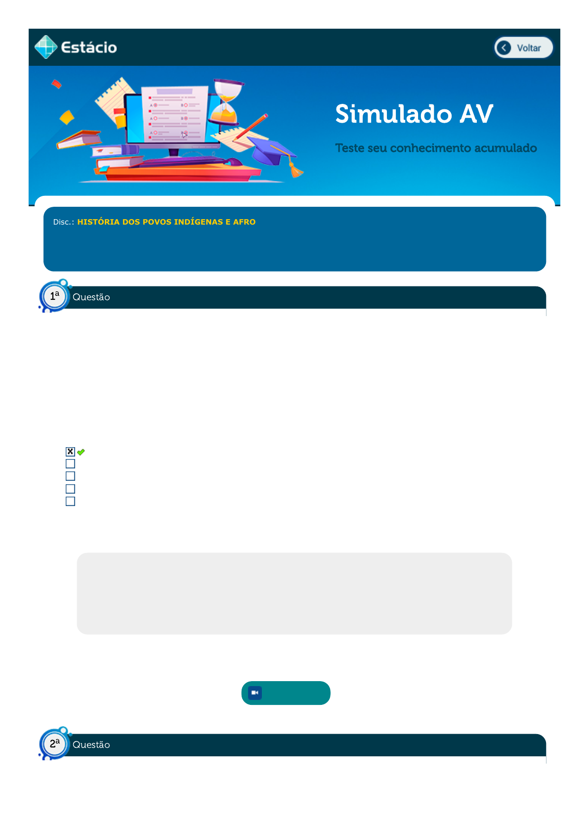 12/11/2021 23:38 Estácio: Alunos https://simulado.estacio.br/alunos/ 1/6 Simulado AV Teste seu conhecimento acumulado Disc.: HISTÓRIA DOS POVOS INDÍGENAS E AFRODESCENDENTES Aluno(a): NATÁLIA CRISTINA CLAUDINO DA SILVA 202108421367 Acertos: 10,0 de 10,0 12/11/2021 Acerto: 1,0 / 1,0 "Não se pode contar nem compreender a multidão de bárbaro gentio que a natureza semeou por toda esta terra do Brasil. (...) Deus permitiu que fossem contrários uns dos outros, e que houvesse entre eles grandes ódios e discórdias, porque se assim não fosse os portugueses não poderiam viver na terra nem seria possível conquistar tanta gente. Quando os portugueses começaram a povoar a terra, havia muitos deste índios pela costa junto das Capitanias. Porque os índios se levantaram contra os portugueses, os governadores e capitães os destruíram pouco a pouco, e mataram muitos deles. Outros fugiram para o sertão, e assim ficou a costa despovoada de gentio ao longo das capitanias." (Pero de Magalhães Gandavo. "Tratado da Terra do Brasil". São Paulo: Obelisco, 1964) O relato de Gandavo sobre os índios e as suas relações com os portugueses no Brasil é do século XVI. Sobre essas relações é correto afirmar que I. os portugueses e os índios praticaram genocídio, uns em relação aos outros; II. a empresa colonizadora portuguesa teve, também, um caráter militar; III. os índios resistiram ao domínio português; IV. os índios não defenderam as suas terras situadas no litoral. Estão corretas: II e III, somente. III e IV, somente. I, II, III e IV. I e IV, somente. I, II e IV, somente. Respondido em 12/11/2021 21:37:24 Explicação: Pelo contexto da conquista do território e pelo conhecimento acumulado do aluno, podemos perceber que a dominação territórial de Portugal na Colônia teve características militares e também queriam escravizar os indígenas, tanto que possuímos o exemplo da Confederação dos Tamoios como uma forma de resistência indígena. Gabarito Comentado Acerto: 1,0 / 1,0 Os indígenas trabalhavam para os europeus no início da colonização por produtos de pouco valor comercial, mas importantes para eles. Após certo período de colaboração, várias tribos deixaram de auxiliar o que gerou uma Questão1 a Questão2 a https://simulado.estacio.br/alunos/inicio.asp javascript:voltar(); 12/11/2021 23:38 Estácio: Alunos https://simulado.estacio.br/alunos/ 2/6 reação violenta por parte dos colonizadores. A afirmativa que melhor explica a mudança de atitude da população indígena em relação aos portugueses é: os indígenas perceberam os reais interesses dos europeus e deixaram de colaborar. os indigenas resolveram, eles mesmos, transformar aquela matéria prima (madeira) em produto manufaturado (tecido tingido, navios) e vender para a Europa. os indígenas resolveram, eles mesmos, comercializar a madeira com outros europeus conseguindo enormes lucros. os indígenas já estavam abastecidos daqueles produtos trazidos pelos europeus e não viam, portanto, necessidade de permanecer trabalhando. Sua concepção de trabalho está relacionado ao uso, não ao valor de venda. os indígenas perceberam que poderiam conseguir lucros significativos se cobrassem em moeda por seu trabalho. Respondido em 12/11/2021 21:43:38 Explicação: Durante séculos os indígenas foram considerados ingênuos por trabalhar em troca de produtos considerados de pouco valor pelos europeus tais como: anzóis, facas, miçangas. Para os indígenas, contudo, estes produtos eram valiosos visto que não os conheciam. Desta forma, trocaram sua força de trabalho por eles até o ponto que era interessante. Abastecidos, deixaram de colaborar com os portugueses o que gerou reação violenta dos mesmos. A lógica indígena não era sustentada pelo valor mercantil do produto e sim, pelo valor de uso dos materiais. Acerto: 1,0 / 1,0 (UFPB 2008) O texto, a seguir, retrata uma das mais tristes páginas da história do Brasil: a escravidão. ¿O bojo dos navios da danação e da morte era o ventre da besta mercantilista: uma má quina de moer carne humana, funcionando incessantemente para alimentar as plantações e os engenhos, as minas e as mesas, a casa e a cama dos senhores ¿ e, mais do que tudo, os cofres dos traficantes de homens.¿ (Fonte: BUENO, Eduardo. Brasil: uma história: a in crível saga de um país. São Paulo: Ática, 2003. p. 112). Sobre a escravidão como atividade econômica no Brasil Colônia, é correto afirmar: C) A compra e posse de escravos, durante todo o período em que perdurou a escravidão, só foi permitida para quem pudesse manter um número de, pelo menos, 30 cativos. Essa proibição justificava-se, devido aos altos custos para se ter escravos. A) As pressões inglesas, para que o tráfico de escravos continuasse, aumentaram após 1850. Porém, no Brasil, com a Lei Eusébio de Queiróz, ocorreu o fim do tráfico inter continental e, praticamente, desapareceu o tráfico interno entre as regiões. D) Muitos cativos, no início da escravidão, conseguiam a liberdade, após adquirirem a carta de alforria. Isso explica o grande número de ex-escravos que, na Paraíba, conseguiram tornar-se grandes proprietários de terras. E) Os escravos, amontoados e em condições desumanas, eram transportados da África para o Brasil, nos porões dos navios negreiros, como forma de diminuição de custos. Com isso, muitos cativos morriam antes de chegarem ao destino. B) A mão-de-obra escrava no Brasil, diferente de outros lugares, não era permitida em atividades econômicas complementares. Por isso, destinaram-se escravos exclusivamente às plantações de cana- de-açúcar, às minas e à produção do café. Respondido em 12/11/2021 21:46:31 Explicação: A opção E destaca as condições precárias de viagem dos escravos trazidos para o Brasil. Os traficantes economizavam nos cuidados mínimos além de amontoar a maior quantidade possível de pessoas com a intenção de maximizar os lucros