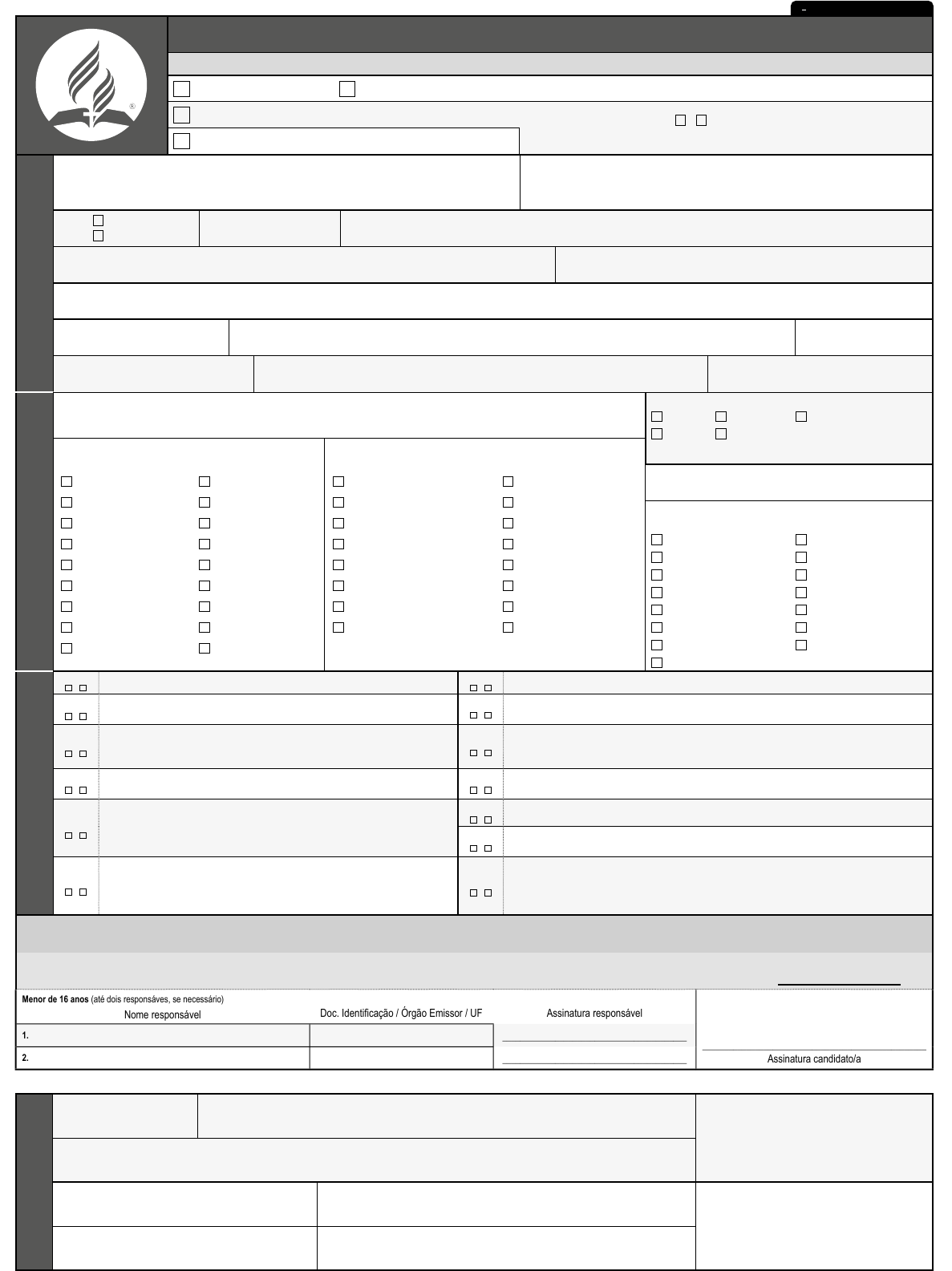 C ER IM Ô N IA Data da cerimônia Local, cidade/UF da cerimônia ___________________________________________________ Assinatura pastor oficiante Nome completo do pastor oficiante Nome da igreja/grupo que o/a recebeu como membro Cidade/UF da igreja/grupo organizado ___________________________________________________ Assinatura secretário/a da igreja/grupo organizado Data e voto da Reunião Regular/Administrativa Data: | Voto: Nome secretário/a da igreja/grupo organizado *ATENÇÃO - Para evitar duplicidade, verifique no ACMS se o/a candidato/a é membro. 1a via - Associação/Missão FICHA DE REGISTRO DE CANDIDATO PREENCHA A FICHA COM LETRA DE FORMA E NÃO DEIXE CAMPOS SEM RESPOSTA Batismo Voto especial - Anexar a ficha de “Pedido de Batismo por Voto Especial” aprovado pela Comissão Diretiva do Campo local. Rebatismo* Foi consultada a igreja/grupo ou o pastor onde o/a candidato/a foi removido/a? S N Data da remoção: Profissão de fé* Motivo: Igreja/grupo e localidade onde foi membro: Nomes (sem abreviações) Sobrenomes (sem abreviações) C O N VE R SÃ O Instrutor/a bíblico/a (preencher o nome completo de até dois instrutores bíblicos) 1. | 2. Estado civil Solteiro Divorciado Viúvo Casado Outro Data casamento civil: Como você conheceu a IASD?(marque só uma opção) Como você estudou a Bíblia? (marque só uma opção) Acampamento/retiro ADRA Amigos/conhecidos Desbravadores/Avent Educação Adventista Escola Sabatina Evangelismo público Família/parentes Instituição de saúde Internet Livros/literatura Missão Calebe Mutirão de Natal Pequeno Grupo Quebrando o Silêncio Rádio TV Outro Classe Bíblica ASA Classe Bíblica Calebe/Jovens Classe Bíblica da igreja Classe Bíblica Desbr/Avent Classe Bíblica Educação Classe Bíblica ES Escola Bíblica Novo Tempo Escola Cristã de Férias Estudo Bíblico individual Estudo Bíblico on-line Evangelismo público Ouvi sermões na igreja Pequeno Grupo Estudei pouco a Bíblia Não estudei a Bíblia Outro Religião anterior Qual foi o fator decisivo para você ser batizado/a? (marque só uma opção) Amigos Convicção pessoal Desbravadores/Avent Educação Adventista Escola Sabatina Evangelismo público Família/parentes Internet Missão Calebe Pequeno Grupo Programa Reencontro Rádio Semana de Oração TV Outro D EC LA R A Ç Ã O D E FÉ S N 1. Aceita a Bíblia toda como a inspirada Palavra de Deus? S N 7. Aceita devolver fiel e voluntariamente o dízimo e a oferta, de acordo com o ensinamento bíblico? S N 2. Aceita o ensino bíblico da trindade de que Deus é uma unidade de três pessoas coeternas: Pai, Filho e Espírito Santo? S N 8. Decide obedecer a todos os mandamentos de Deus, inclusive o do sábado? S N 3. Aceita a morte de Jesus Cristo como o sacrifício que perdoa e apaga os pecados, e acredita que é salvo pela graça, mediante a fé? S N 9. Crê e aceita que a Igreja Adventista do Sétimo Dia é a igreja remanescente dos últimos dias de acordo com a profecia bíblica, e deseja ser aceito como membro da congregação local da Igreja Adventista mundial? S N 4. Aceita Jesus Cristo como o seu único Salvador pessoal e o Senhor da sua vida? S N 10. Aceita o ensinamento bíblico dos dons espirituais e crê que o dom de profecia manifesto no ministério de Ellen G. White é uma característica distintiva da igreja remanescente? S N 5. Decide deixar tudo o que prejudica a sua saúde e a de outras pessoas, evitando o consumo de alimentos impróprios, o uso, a fabricação e a comercialização de bebidas alcoólicas, tabaco, café, drogas ilícitas, porque reconhece que o corpo é o templo do Espírito Santo? S N 11. Aceita o ensinamento bíblico do batismo por imersão e voluntariamente decide ser batizado? S N 12. Aceita que Jesus Cristo é o seu intercessor no Santuário Celestial e que Ele lhe oferece Sua graça e Seu poder para viver uma vida centrada Nele? S N 6. Aceita pôr em prática todas as crenças e princípios bíblicos fundamentais, incluindo a modéstia cristã no vestir-se, no uso de adornos e na aparência pessoal, abstendo-se de frequentar lugares impróprios, assim como ensina a Igreja Adventista do Sétimo Dia? S N 13. Aceita preparar-se como discípulo e se dispõe a discipular pessoas para a breve vinda do nosso Senhor Jesus Cristo, participando ativamente da pregação do evangelho? Quem discipularei: CREIO E ACEITO AS CRENÇAS FUNDAMENTAIS, NORMAS E PRINCÍPIOS DA IGREJA ADVENTISTA DO SÉTIMO DIA, INCLUSIVE A DISCIPLINA ECLESIÁSTICA, EXPRESSOS NO “MANUAL DA IGREJA”, E DESEJO SER MEMBRO DESTA CONGREGAÇÃO LOCAL DA IGREJA ADVENTISTA MUNDIAL. COM A MINHA ASSINATURA DOU CONSENTIMENTO EXPRESSO PARA QUE A IGREJA ADVENTISTA DO SÉTIMO DIA TRATE MEUS DADOS PESSOAIS DE ACORDO COM A LEI, ESPECIFICAMENTE NO CUMPRIMENTO DE SUAS FINALIDADES INSTITUCIONAIS. A POLÍTICA DE PRIVACIDADE ESTÁ PUBLICADA NO SITE: http://adv.st/privacidade Menor de 16 anos (até dois responsáves, se necessário) Nome responsável Doc. Identificação / Órgão Emissor / UF Assinatura responsável ___________________________________________________ Assinatura candidato/a 1. __________________________________________ 2. __________________________________________ Preencher a parte abaixo depois de o/a candidato/a ter sido recebido/a como membro pela igreja/grupo organizado. Esta ficha só será válida com as três assinaturas: candidato/a, pastor oficiante e secretário/a da igreja/grupo organizado onde será membro. Esta via deve ser destruída pela Secretaria do Campo ao finalizar o ano corrente, confirmando primeiro se os dados do membro e a cópia desta ficha digitalizada foram inseridos corretamente no ACMS. Sexo Masculino Feminino Data de nascimento Cidade, UF, país de nascimento Nome da mãe Nome do pai Endereço residencial completo Bairro Cidade, UF, país da residência CEP Telefone ( ) E-mail Doc. Identificação / Órgão Emissor / UF ID EN TI FI C A Ç Ã O http://adv.st/privacidade C ER IM Ô N IA Data da cerimô