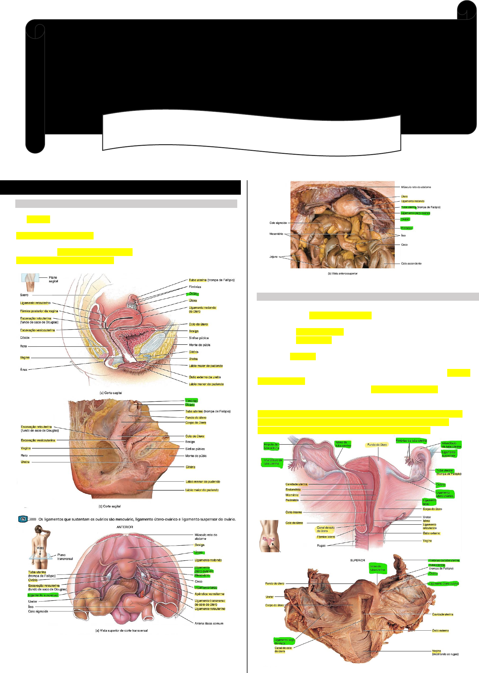 Lorena Bressanini Siqueira Aparelho reprodutor feminino – órgãos genitais OVÁRIO: Os ovários são as gônadas femininas. Estão localizados um de cada lado do útero. Uma série de ligamentos mantém a posição dos ovários. O ligamento largo do útero, que é uma prega de peritônio, fixa-se aos ovários por um desdobramento dessa prega peritoneal chamado mesovário. O ligamento útero-ovárico ancora os ovários no útero, e o ligamento suspensor do ovário prende-os à parede pélvica. TUBAS UTERINAS: As mulheres têm duas tubas uterinas. As tubas estão situadas nas pregas dos ligamentos largos do útero (Essa parte do ligamento largo é denominada mesossalpinge) . A porção afunilada de cada tuba uterina, denominada infundíbulo, está próxima do ovário, mas é aberta para a cavidade peritoneal. Termina em uma franja de projeções digitiformes chamadas fímbrias, uma das quais está presa à extremidade lateral do ovário. A partir do infundíbulo, a tuba uterina estende-se em sentido medial e, depois, inferior e se fixa ao ângulo lateral superior do útero. A ampola da tuba uterina é a porção mais larga e longa, constituindo cerca de dois terços laterais de seu comprimento. O istmo da tuba uterina é a porção de parede espessa mais medial, curta e estreita, que se une ao útero. O mesovário ancora o ovário ao ligamento largo do útero e à tuba uterina; o ligamento útero-ovárico ancora o ovário ao útero; o ligamento suspensor ancora o ovário à parede da pelve. Lesão Celular, Morte Celular e Adaptações Anatomia do sistema genital feminino Anatomia Lorena Bressanini Siqueira ÚTERO: O útero fica situado entre a bexiga e o reto. As subdivisões anatômicas do útero são: 1) uma porção em forma de cúpula, superior às tubas uterinas, o fundo do útero; 2) uma porção central afilada, o corpo do útero; e 3) uma porção estreita inferior, o colo do útero, que se abre na vagina. Entre o corpo e o colo do útero está o istmo. O interior do corpo do útero é a cavidade uterina, e o interior do colo estreito é o canal do colo do útero. Os dois ligamentos largos do útero são pregas duplas de peritônio que fixam o útero de cada lado da cavidade pélvica. Os ligamentos retouterinos estão situados em cada lado do reto e unem o útero ao sacro. Os ligamentos transversos do colo do útero estão localizados inferiormente às bases dos ligamentos largos e estendem-se da parede da pelve até o colo do útero e a vagina. Os ligamentos redondos do útero são faixas de tecido conjuntivo fibroso entre as camadas do ligamento largo; estendem-se de um ponto no útero imediatamente inferior às tubas uterinas até uma porção dos lábios maiores dos órgãos genitais externos. Temos, mais anteriormente, a escavação vesicouterina entre a bexiga e o útero. Posteriormente, temos a escavação retouterina. No útero temos endométrio, miométrio, e perimétrio. VAGINA: A vagina é um canal fibromuscular tubular revestido por mucosa, que se estende do exterior do meio do colo do útero até o óstio da vagina. Situada posteriormente à bexiga e à uretra e anteriormente ao reto, a vagina segue em direção superior e posterior para se fixar ao colo do útero. Um recesso chamado fórnice circunda a fixação da vagina ao colo do útero. O fórnice da vagina, o recesso ao redor do colo, tem partes anterior, posterior e lateral. A parte posterior do fórnice da vagina é a mais profunda e tem íntima relação com a escavação retouterina. Quatro músculos comprimem a vagina e atuam como esfíncteres: pubovaginal, esfíncter externo da uretra, esfíncter uretrovaginal e bulboesponjoso O óstio da vagina, o óstio externo da uretra e os ductos da glândula vestibular maior e as glândulas vestibulares menores abrem-se no vestíbulo da vagina, a fenda entre os lábios menores do pudendo. Uma prega delgada de mucosa vascularizada, o hímen, forma uma orla em torno do óstio da vagina, a extremidade inferior da abertura da vagina para o exterior, fechando-a parcialmente. Lorena Bressanini Siqueira VULVA/ÓRGÃOS GENITAIS EXTERNOS: O termo vulva, ou pudendo feminino, refere-se aos órgãos genitais externos femininos. Os componentes da vulva são: • Anteriormente aos óstios da vagina e da uretra está o monte do púbis, uma elevação de tecido adiposo, recoberta por pele e pelos púbicos espessos, que protege a sínfise púbica. • A partir do monte do púbis, duas pregas cutâneas longitudinais, os lábios maiores do pudendo, estendem-se em sentido inferior e posterior. • Medialmente aos lábios maiores do pudendo há duas pregas cutâneas menores chamadas lábios menores do pudendo. • O clitóris é composto por tecido erétil e nervos, localizado na junção anterior dos lábios menores do pudendo. Uma camada de pele, chamada prepúdo do clitóris, forma-se no ponto onde os lábios menores do pudendo se unem e recobrem o corpo do clitóris. O corpo do clitóris tem dois corpos de tecido erétil, os corpos cavernosos. • A região entre os lábios menores do pudendo é o vestíbulo. No vestíbulo estão o hímen (se ainda presente), o óstio da vagina, o óstio externo da uretra e as aberturas dos duetos de várias glândulas. De cada lado do óstio externo da uretra há aberturas dos ductos das glândulas parauretrais ou glândulas de Skene. Essas glândulas secretoras de muco estão alojadas na parede da uretra. De cada lado do óstio da vagina estão as glândulas vestibulares maiores ou glândulas de Bartholin • O bulbo do vestíbulo é constituído por duas massas alongadas de tecido erétil em posição imediatamente profunda em relação aos lábios do pudendo de cada lado do óstio da vagina.