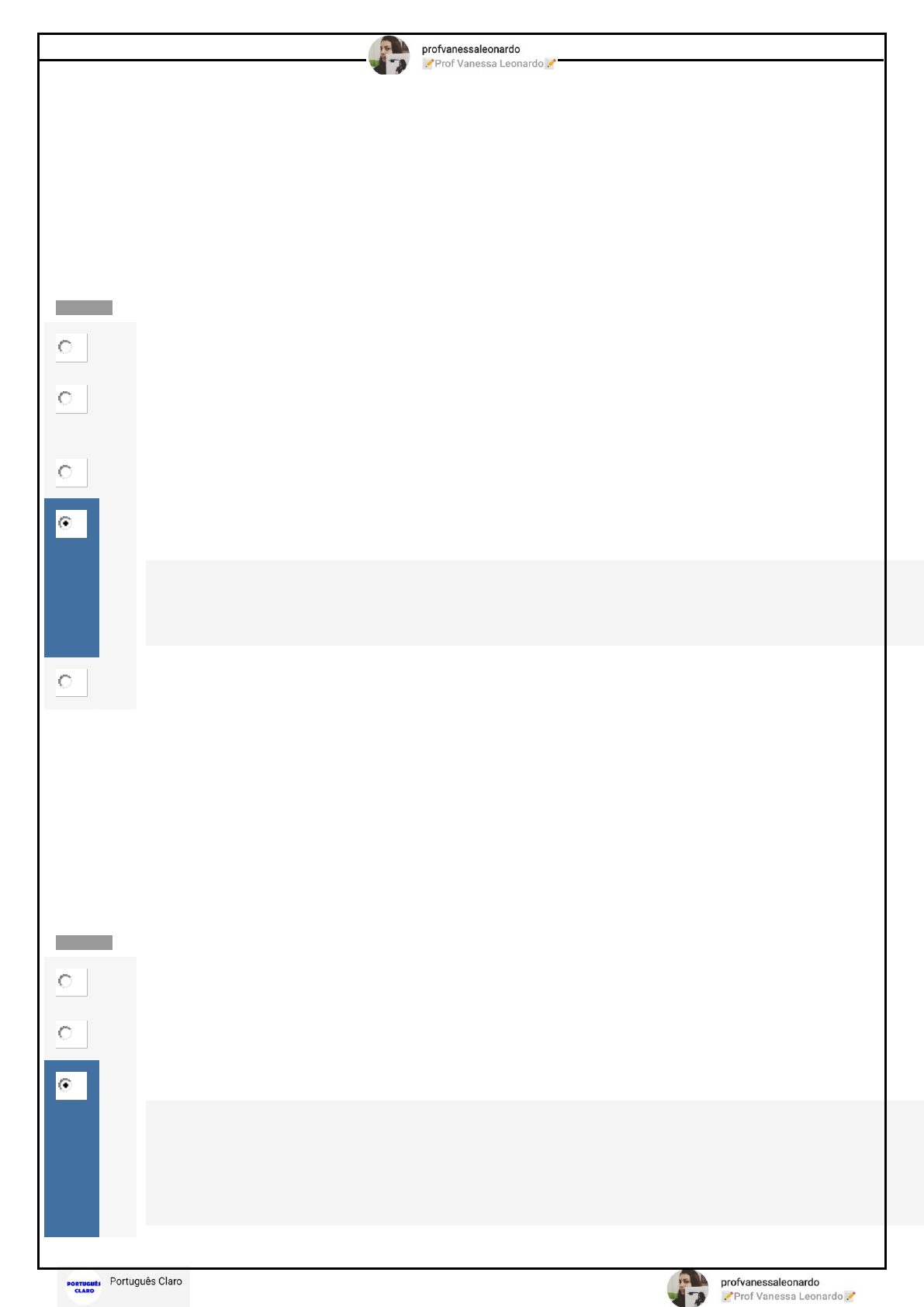 Português Prof.: Vanessa Leonardo Questão 1/10 - Educação Infantil: Conteúdos, Tendências e Metodologias Leia o fragmento de texto: “Os objetivos apontados [...] levam a reflexão sobre o desenvolvimento e aprendizagem adequados das crianças, pois consideram que elas estão inseridas em um ambiente favorável à construção dos diferentes saberes”. Após esta avaliação, caso queira ler o texto integralmente, ele está disponível: RAU, M. C. T. D. Educação infantil: práticas pedagógicas de ensino e aprendizagem. Curitiba: InterSaberes, 2012. p. 59. Considerando o fragmento de texto e os conteúdos do livro-base Educação infantil: práticas pedagógicas de ensino e aprendizagem sobre a rotina da educação infantil, assinale a alternativa correta: Nota: 10.0 A Por tratar de crianças, a rotina da educação infantil pode ser improvisada e permitir que a criança faça o que quiser. B A rotina da educação infantil deve priorizar os interesses do professor, pois é fundamental para o desenvolvimento integral dos educandos. C A rotina da educação infantil deve promover experiências individuais que serão importantes para o desenvolvimento integral. D A rotina da educação infantil deve prever momentos em que a criança tenha experiência de interação social que promovam relação com o meio, envolvendo atitudes em relação a si, aos objetos e ao outro. Você acertou! Esta é a alternativa correta. De acordo com o livro-base: “[...] a rotina da educação infantil deve prever momentos em que a criança tenha experiência de interação social que promovam a sua relação com o meio, envolvendo suas atitudes em relação a si, aos objetos e ao outro” (livro-base, p. 114). E A rotina da educação infantil tem, como objetivo, estimular a ludicidade. Questão 2/10 - Educação Infantil: Conteúdos, Tendências e Metodologias Leia o fragmento de texto: “[...] ser, sentir, brincar, expressar-se, relacionar-se, mover-se, organizar-se, cuidar-se, agir e responsabilizar-se são partes do todo de cada sujeito”. Após esta avaliação, caso queira ler o texto integralmente, ele está disponível: RAU, M. C. T. D. Educação infantil: práticas pedagógicas de ensino e aprendizagem. Curitiba: InterSaberes, 2012. p. 33. Considerando o fragmento de texto e os conteúdos do livro-base Educação infantil: práticas pedagógicas de ensino e aprendizagem sobre os fundamentos norteadores relacionados aos princípios políticos dos direitos e deveres da cidadania, assinale a alternativa correta: Nota: 10.0 A São: respeito ao bem comum, responsabilidade e solidariedade. B São: aprendizado, convivência consigo e com os outros. C São: exercício da criticidade e do respeito à ordem democrática. Você acertou! Esta é a alternativa correta. De acordo com o livro-base: “1. Princípios Éticos da Autonomia, da Responsabilidade – é o relacionar-se, o mover-se, o cuidar-se, o responsabilizar-se são questões a serem desenvolvidas no ambiente escolar. 2. Princípios da Solidariedade e do Respeito ao Bem Comum – as crianças devem aprender a conviver consigo próprias e com os outros de forma solidária e comunitária. 3. Princípios Políticos dos Direitos e Deveres da Cidadania –independente de sexo, raça e credo, as crianças devem ser tratadas como cidadãos. 4. Princípios do Exercício da Criticidade e do Respeito à Ordem Democrática – A criança deve aprender a conviver com o meio Português Prof.: Vanessa Leonardo ambiente de maneira articulada e gradual. 5. Princípios Estéticos da Sensibilidade, da Ludicidade, da Qualidade e da Diversidade de Manifestações Artísticas e Culturais – o ser, o sentir, o brincar da criança como uma necessidade” (livro-base, p. 32-33). D São: articulação, ludicidade e qualidade de vida. E São: manifestações artísticas e culturais e aspectos físicos. Questão 3/10 - Educação Infantil: Conteúdos, Tendências e Metodologias Leia o fragmento de texto: “Foi para garantir a qualidade da educação infantil que foram criadas as Diretrizes Curriculares Nacionais (DCN)”. Após esta avaliação, caso queira ler o texto integralmente, ele está disponível: RAU, M. C. T. D. Educação infantil: práticas pedagógicas de ensino e aprendizagem. Curitiba: InterSaberes, 2012. p. 30. Considerando o fragmento de texto e os conteúdos do livro-base Educação infantil: práticas pedagógicas de ensino e aprendizagem sobre a garantia da qualidade no trabalho pedagógico e o exercício da cidadania previsto no DCNEI (Diretrizes Curriculares Nacionais para a Educação Infantil), é correto afirmar que: Nota: 10.0 A A promulgação da DCNEI ainda não garante o reconhecimento da educação infantil como parte integrante da educação básica. B A DCNEI garante a obrigatoriedade para as instituições que trabalham com crianças de 0 a 5 anos. C As diretrizes apontam o trabalho com as crianças de creche e pré-escola, norteando as propostas curriculares e os projetos pedagógicos, e destacam a articulação entre as ações de educação e cuidado. Você acertou! Esta é a alternativa correta. De acordo com o livro-base: “[...] a educação infantil passa a ser reconhecida como parte integrante da educação básica e, apesar de não ser obrigatória, garante o caráter educacional para as instituições que trabalham com crianças de 0 a 5 anos [...] a educação infantil está legalmente inserida na educação básica, pois as DCNEI descrevem os aspetos a serem observados no âmbito educacional para as crianças de 0 a 5 anos. [...] As diretrizes apontam o trabalho com as crianças de creche e pré escola, norteando as propostas curriculares e os projetos pedagógicos, e destacam a articulação entre as ações de educação e cuidado (livro-base, p. 30, 31, 32). D Atualmente, a educação infantil atende a crianças de 3 a 6 anos. E A educação infantil está informalmente vinculada a educação básica, pois as DCN