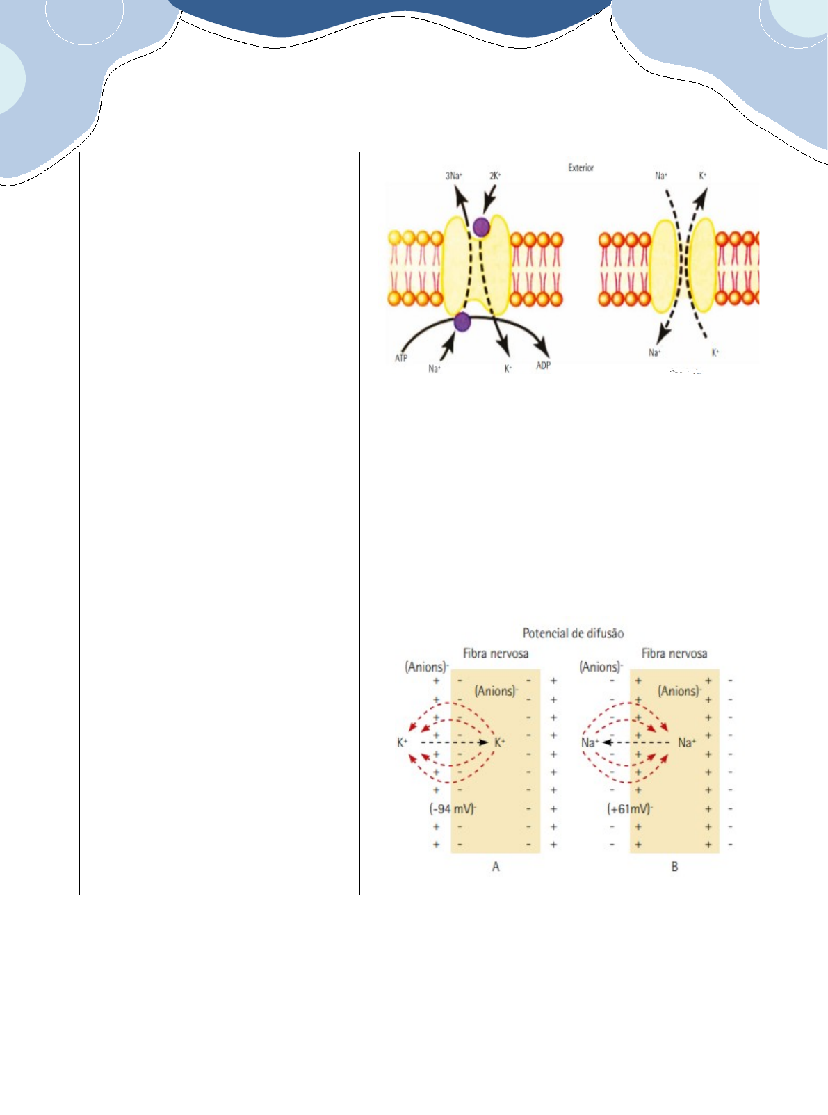 ( A bomba de sódio-potássio transporta íons sódio para fora da célula, mantendo baixa concentração desses íons no lado interno e alta concentração no lado externo e que ao mesmo tempo transporta íons potássio para dentro, mantendo uma alta concentração desse íon no lado interno e uma baixa concentração no lado externo. A diferença de concentração desses íons entre os lados interno e externo da membrana pode ser responsável pela geração da eletricidade na célula. ) ( As células são capazes de gerar eletricidade espontaneamente, fenômeno que é conhecido por bioeletrogênese . Para entender como esse fenômeno acontece, deve-se entender que os íons são substâncias químicas que ganharam ou perderam elétrons e se tornaram eletricamente carregados. Os íons podem ter carga negativa (aníon) ou positiva (cátion). Nas células, os íons responsáveis pela geração da eletricidade são os íons sódio (Na+) e potássio (K+). Extravasamento do potássio e do sódio através da membrana nervosa (biomembranas) O lado direito da figura a seguir mostra uma proteína na membrana de uma célula nervosa que forma um canal proteico, pelo qual íons potássio e sódio podem extravasar, ou seja, difundir de um lado para o outro da membrana, chamado de canal de “extravasamento” de potássio-sódio (Na+ - K+). O mais importante é o extravasamento de íons potássio porque, em média, os canais são, normalmente, cerca de 100 vezes mais permeáveis ao potássio do que aos íons sódio. Esse diferencial na permeabilidade é muito importante para a determinação do nível do potencial de repouso normal da membrana. Características funcionais da bomba de Na+ - K+ (transporte ativo) e os canais de “extravasamento” de K+ - Na+ (transporte passivo). ) ( Bomba de Na+ e -K+ Canais de extravasamento ) ( Fenômenos elétricos nas células ) ( Em A, o estabelecimento do "potencial de difusão” através da membrana da fibra nervosa, causado pela difusão dos íons potássio de dentro da célula para fora, através da membrana que é seletivamente permeável somente ao potássio. Em B, o estabelecimento de “potencial de difusão” quando a membrana da fibra nervosa só é permeável aos íons sódio. Note que o potencial de membrana interno é negativo quando os íons potássio se difundem e positivo quando os íons sódio se difundem, em razão dos gradientes de concentração opostos desses dois íons. Como a concentração dos íons potássio é maior dentro do que fora da célula, esse íon tende a se difundir para fora da célula pelos canais de extravasamento, deixando o interior da célula mais negativo. ) ( Axônio : essa é a parte do neurônio que é chamada de fibra nervosa. Seu comprimento pode variar de alguns milímetros, como acontece com os pequenos neurônios do cérebro, podendo atingir até um metro, como no caso dos axônios (fibras nervosas) que partem da medula espinhal e chagam até os pés. As fibras nervosas transmitem os sinais neurais para o neurônio seguinte no cérebro ou na medula espinhal, ou para os músculos e glândulas nas regiões periféricas do corpo através das sinapses. Se agrupa em feixes; transmitem o impulso elétrico aos terminais do axônio. ) ( Impulso nervoso: a linguagem do cérebro O impulso nervoso é um sinal elétrico gerado pelas células (bioeletrogênese) que é transmitido por fibras nervosas , no cérebro, na medula espinhal ou em nervos periféricos. Absolutamente tudo que sentimos, proveniente tanto do nosso corpo quanto do mundo exterior, são sensações produzidas pelo nosso cérebro. Todos os sentidos que temos e as sensações que vivenciamos, visão, audição, olfato, paladar, tato, calor e frio, entre outras, são frutos de estímulos que foram captados e traduzidos em impulsos nervosos para que o cérebro pudesse processá-los e gerar as sensações da forma que as sentimos . Ou seja, essa linguagem captada é traduzida na linguagem (impulso nervoso) que o nosso cérebro consegue processar. A célula nervosa: neurônio Corpo celular : é a região principal que dá origem a todas as outras partes do neurônio. Essa região também é responsável pela maior parte do metabolismo dessa célula e é necessária para que todas as partes do neurônio sobrevivam. Dendritos : são ramificações do corpo celular. Constituem as partes receptoras principais do neurônio. Assim, os sinais que chegam ao neurônio chegam pelos dendritos. Os dendritos de cada neurônio, em geral, se “comunicam” com outros neurônios através de milhares de pontos de contato chamados de sinapses. ) ( Mas por que todo o potássio não se difunde para fora da célula? Porque quando o potássio começa a sair, a célula já fica muito negativa e essa negatividade começa a atrair o potássio, até que esses íons não consigam mais sair, pois cargas opostas se atraem. Como a membrana é muito menos permeável aos íons sódio, esses íons têm um papel muito menor na eletricidade negativa gerada no interior das células pela difusão dos íons potássio. Biomembranas → transporte íons entre meios intra e extracelulares, ficam polarizadas → origina potencial elétrico. Célula excitável recebe estímulo externo → altera fluxo de íons através de sua membrana → muda sua polarização. – ex: célula nervosa ou neurônio; Recebe impulsos elétricos do próprio organismo ou do meio externo, integra essas informações e as retransmite para outros neurônios. ) ( Neurônio sensorial : conduz impulsos nervosos ao SNC; Neurônio motor : conduz impulsos nervosos do SNC para todo corpo. ) ( Terminais axônicos e sinapses : próximo ao seu final, todos os axônios podem gerar milhares de ramificações. Na ponta de cada uma dessas ramificações existe uma terminação neural especializada que, no sistema nervoso central, é chamada de botão sináptico, situado sobre a superfície da membrana de um dendrito ou corpo celular de ou