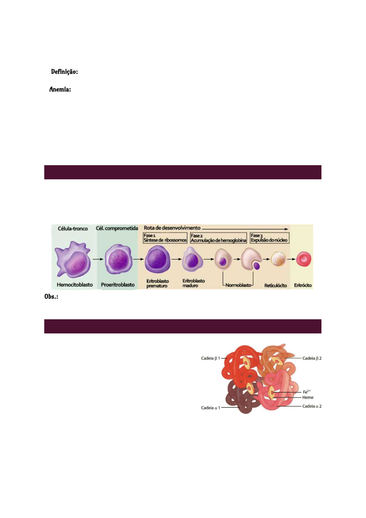 Júlia Souza - 5o período - 2021 Síndromes Anêmicas * Definição: redução de uma capacidade de transporte de oxigênio no sangue, normalmente por diminuição da massa total de eritrócitos circulantes * Anemia: condição na qual o conteúdo de hemoglobina no sangue está abaixo do normal: - Deficiência nutricional → anemias carenciais (ferropriva e megaloblástica) - Imune → anemias inflamatórias ou de doenças crônicas - Diminuição da cadeia de globina → Talassemias - Falha na ativação do grupo heme → anemia sideroblástica - Substituição do tecido hematopoético por gordura → anemia aplásica - Sangramento agudo → anemias hemolíticas - Desregulação endócrina - Por defeito na síntese de DNA → anemia megaloblástica FIsiologia * Célula tronco dá origem à duas diferentes células - Mielóide (vermelha) - Linfóide (branca) * Durante a formação da hemácia temos a formação dos eritrócitos (células pré hemácias que ainda possuem células) Obs.: Em casos de hemorragia, por exemplo, há um aumento no número de reticulócitos pois a medula trabalha mais para compensar a perda hemorrágica - HIPERPROLIFERATIVA - MAIS // HIPOPROLIFERATIVA - MENOS Hemoglobina * É um tetrano formado por - 2 cadeias de alfa-globina - 2 cadeias de beta-globina - 4 cadeias heme - onde o ferro se liga * HEMÁCIA = ERITRÓCITO * Vida Média das Células sanguíneas: - Eritrócitos: 120 dias / Plaquetas: 7 dias / Granulócitos: 6 horas / Linfócitos: horas a anos - Existem vários mecanismos que acabam com os eritrócitos + Baço, fígado e medula óssea → por meio dos macrófagos ● Em anemias hemolíticas, como a falciforme, a destruição aumentada ocorre por parte do fígado + Reconhecimento de anticorpo + Globina → bilirrubina 1 Júlia Souza - 5o período - 2021 Mecanismo Globina → Bilirrubina * A bilirrubina é uma molécula lipossolúvel (INDIRETA) - que circula ligada a albumina pela corrente a sanguínea até o fígado (onde é transformada em molécula hidrossolúvel * A bilirrubina hidrossolúvel é uma molécula DIRETA que vai para o intestino onde vira urobilinogênio * Parte desse urobilinogênio é reabsorvida e outra sai nas fezes (o que permite sua coloração amarronzada) Obs 1.: Em casos de trauma - Urina preta - urobilinogênio (comprometimento hepático) Obs 2.: Hematoma - Começa roxo - vai perdendo oxigênio fica azul - e devido a bilirrubina indireta que passa na circulação sanguíneo deixa a lesão amarela Manifestação Clínica * Nas hemorragias agudas ou nas crises hemolíticas, os pacientes apresentam sintomas mais intensos do que nos quadros de instalação lenta e de longa duração Aguda * Devido à baixa oxigenação abrupta, o coração passa a trabalhar em ritmo mais acelerado * Dispnéia (porque não chega oxigênio na célula) * Palpitação * Tontura * Fadiga extrema * Taquicardia Crônica * Hipotensão postural (muda de posição e a pressão cai) * Fraqueza * Dispnéia * Relação cardíaca (sopros sistólicos, angina) * Alteração * Palidez * Cefaléia * Coiloníquia - unha em formato de colher Obs.: Icterícia associada a palidez é uma manifestação característica da anemia hemolítica Obs 2.: Em caso de pacientes idosos, portador de anemia, o quadro clínico pode apresentar-se de forma diferente, como um quadro de insuficiência cardíaca, angina e confusão mental - Caso o paciente já possua alguma comorbidade, a anemia pode agravar este quadro Diagnóstico Laboratorial * Hemoglobina < 13 * Concentração de hemoglobina - g/100ml sangue Obs.: em casos de trombocitopenia associada pensar em doenças autoimunes, caso seja uma pancitopenia, pensar em doenças malignas Hematócrito - 36% a 46% VCM - Volume Corpuscular Médio * Mede o TAMANHO do eritrócito * Valor referência → 80 - 100 2 Júlia Souza - 5o período - 2021 * Caracterização: - Macrocítica > 100 - Normocítica - entre 80 e 100 - Microcítica < 80 HCM - Hemoglobina Corpuscular Média * Média de hemoglobina dentro do eritrócito → QUANTIDADE DE HB * Valor referência → 28 - 32 * Caracterização: - Hipercrômica > 32 - Normocrômica - entre 28 e 32 - Hipocrômica < 28 CHCM - Concentração de HB corpuscular média * Concentração de HB corpuscular média * Mede a concentração do pigmento - peso da hemoglobina dentro do eritrócito * Valor referência → 32 - 37 * Caracterização: - Hipercrômica > 37 - Normocrômica - entre 32 e 37 - Hipocrômica < 32 RDW - Índice de Anisocitose * Ampla distribuição de células vermelhas no sangue * Mede a VARIÂNCIA no tamanho das hemáceas para confirmar o VCM * Valor referência → 10 a 15 Contagem de Reticulócitos * Mede em porcentagem * Valor referência 0,5 - 2,0% Exame Complementar * Ferro sérico (concentração de ferro no sangue) - NUNCA PEDIR INDIVIDUAL - Altas concentrações → doença hepática, anemia hipoplásica, eritropoese - Baixas concentrações → anemia ferropriva * Transferrina sérica (concentração da proteína que transporta o ferro * TIBC - Capacidade total do Fe ligar-se à transferrina * Ferritina Sérica Esfregaço - Características das hemácias * Microcítica - menor * Macrocítica - maior * Em alvo ou leptócitos - perda de ferro * Microesferócito - pequena e corada * Rouleaux - empilhamento (mieloma) * Drepanócitos - hemácias foice * Esquizócitos - fragmentação pós trauma * Hemácias em lágrimas ou dacriócitos - forma de lágrima * Corpúsculo de Howell-jolly Classificação Morfológica das Anemias * Se baseia nos valores de VCM * Analisa o aspecto morfológico dos eritrócitos e não a causa da anemia 3 Júlia Souza - 5o período - 2021 Microcítica < 80 * Ocorre uma diminuição do grupo heme por deficiência de ferro * Etiologias 1. Ferropriva → diminui o ferro 2. Sideroblástica → aumento de ferro 3. Talassemia → diminuição da globina Macrocítica > 100 Megaloblástica * Deficiência de Algo - B12 (220 - 800) / Ácido fólico /Síntese de DNA N