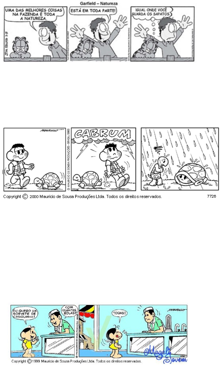 Avaliação de LP E.M. Gurgel do Amaral Autonomia Carioca 8/9 2016 Prof Else Numere de 1 a 10 uma folha de caderno e escreva a letra correspondente a cada questão, indicando a opção que você acredita ser a correta. Não escreva nessa folha! D4 – Inferir uma informação implícita em um texto. 1) No 3º quadrinho, pode-se inferir que , na opinião de Garfield, seu dono é: a) preguiçoso b) amante da natureza c) desorganizado d) atrapalhado D5 – Interpretar texto com auxílio de material gráfico diverso (propagandas, quadrinhos, foto etc.). 2) A atitude do Cascão, no último quadrinho, demonstra: a) solidariedade b) medo c) dúvida d)irritação 3) A onomatopeia, figura de linguagem que aparece na tirinha do Cascão, também está presente na tirinha: a) b) c) d) A tirinha abaixo se refere às questões 4 e 5. D13 – Identificar as marcas linguísticas que evidenciam o locutor e o interlocutor de um texto. 4) A linguagem utilizada pelo Chico Bento nessa tirinha foi a) coloquial b) formal c) gíria d) técnica 5) A fala do amigo do Chico Bento no 1º quadrinho - “ Meu pai tem oitocentas cabeças de gado!” – provoca no leitor: a) espanto por não entender a referência só às cabeças. b) entendimento de que é a linguagem usada pelos pecuaristas. c) indignação ao pensar que os bois foram decapitados. d) dúvida em saber se ele dizia a verdade. D14 – Distinguir um fato da opinião relativa a esse fato. 6) Ao dizer que “a situação não está tão boa...”, Mafalda revela sua opinião referindo-se: a) ao desperdício que é a troca de dentes b) à atual conjuntura que não permite desperdício c) à inutilidade da substituição dos dentes de leite d) a um sistema econômico que só esbanja D15 – Estabelecer relações lógico-discursivas presentes no texto, marcadas por conjuntos, advérbios, etc. 7) Ao invés de usar “ mais ele tá interinho!”, Chico Bento deveria ter usado a conjunção mas , que estabelece ideia de: a) adição b) explicação c) conclusão d) oposição Fonte:http://tirasdemafalda.tumblr.com/ D17 – Reconhecer o efeito de sentido decorrente do uso da pontuação e de outras notações. 8) A interjeição “Aaah...” , proferida por Mafalda, denota: a) decepção por saber que essas pessoas não existem b) indiferença pois achava que essas pessoas possuíam endereço c) conformação pois se não existem, não há o que fazer d) desconfiança por achar que residiam em outro país. D19 – Reconhecer o efeito de sentido decorrente da exploração de recursos ortográficos e/ou morfossintáticos. 9) No primeiro quadrinho dessa tirinha, o verbo haver “...estou acordado há duas horas...” foi empregado para indicar: a) tempo passado b) tempo presente c) ação frequente d) ação interrompida Disponível em: . Acesso em: 3 dez. 2010. (P090559ES_SUP) 10) Na tirinha, as expressões toda a natureza e toda parte : a) são sinônimas: significam completa b) são divergentes: seus sentidos são opostos c) têm significados distintos: inteira e cada, respectivamente d) têm significados equivalentes : total