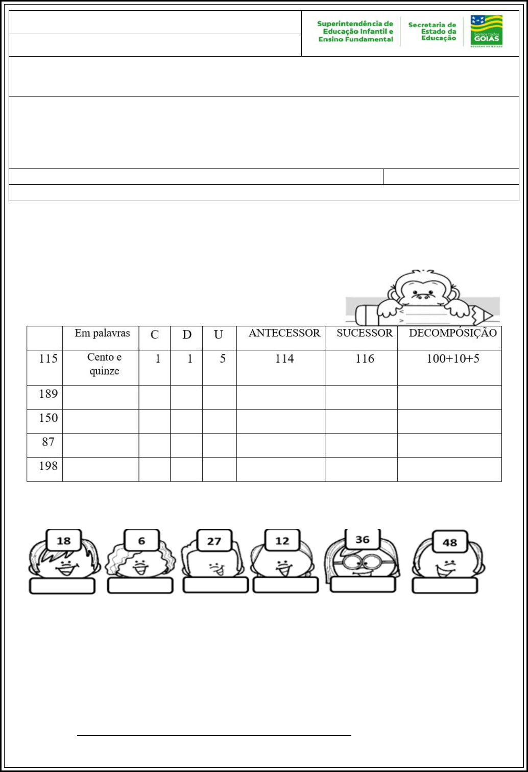 1 ATIVIDADES 1- Vamos compor e decompor os numerais na atividade a seguir: 2- Escreva o nome das crianças de acordo com os números pensados: A) Marta penso o numeral que equivale a uma dúzia. B) O numeral de marcos é uma dezena e oito unidades. C) Carlos pensou no numeral maior. D) Miriam pensou no numeral par, terminado com 6. E) Meia dúzia é a Adriana. F) O número do Guilherme não é par e equivale a 2 dezenas e 7 unidades. Disponível em: https://alfakids.org/atividades-de-matematica-descobrindo-os-numeros/Acesso em 28 de abr. de 2020. MATEMÁTICA – 2º ANO 2ª QUINZENA - 2º CORTE Tema/ Conhecimento: Sistema de numeração decimal; Contagem, estimativa e agrupamentos de números naturais em ordem crescente e decrescente até 199 unidades; Composição e decomposição de números naturais (até 199 unidades) Habilidades: (EF02MA04-A) Identificar diferentes formas de decompor um número por adições, utilizando materiais manipuláveis, como fichas numéricas ou jogos e/ou sistema monetário representando uma quantia com cédulas diversas; (EF02MA05-D) Construir fatos básicos da adição e subtração com números menores que 10, como 5 + 2 = 7 e 7 - 2 = 5 e utilizá-los no cálculo mental ou escrito em situações diversas: contagem de pontos em jogos de arremesso, atividades com calculadora e regularidades em resultados de operações. NOME: DATA: UNIDADE ESCOLAR: 2 3- Vamos exercitar os agrupamentos e descobrir o numeral: Disponível em: https://www.educacaoetransformacao.com.br/atividades-de-matematica-dezena-e-unidade/atividades- matematica-1-ano-dezena-unidade-7/ Acesso em 28 de abr. de 2020. 3 4- Decomponha os números. Observe o exemplo: a) 195 = ___________________________ g)177 = ___________________________ b) 131 = ___________________________ h) 110 = ___________________________ c) 143 = ___________________________ i) 109 = ___________________________ d) 140 = ___________________________ j) 199 = ___________________________ e) 138 = ___________________________ k) 170 = ___________________________ f) 104 = ___________________________ l) 101 = ___________________________ Disponível em: https://novaescola.org.br/plano-de-aula/537/composicao-e-decomposicao-de-numeros acesso em 28 de abr. 2020. 5- Você consegue compor a quantidade relativa a soma dos valores a seguir? Vamos tentar? Disponível em https://br.pinterest.com/pin/786581891148953079/ Acesso em 28 de abr. 2020. 125= 100 + 20 + 5 4 6- Descubra os numerais que estão faltando e complete: