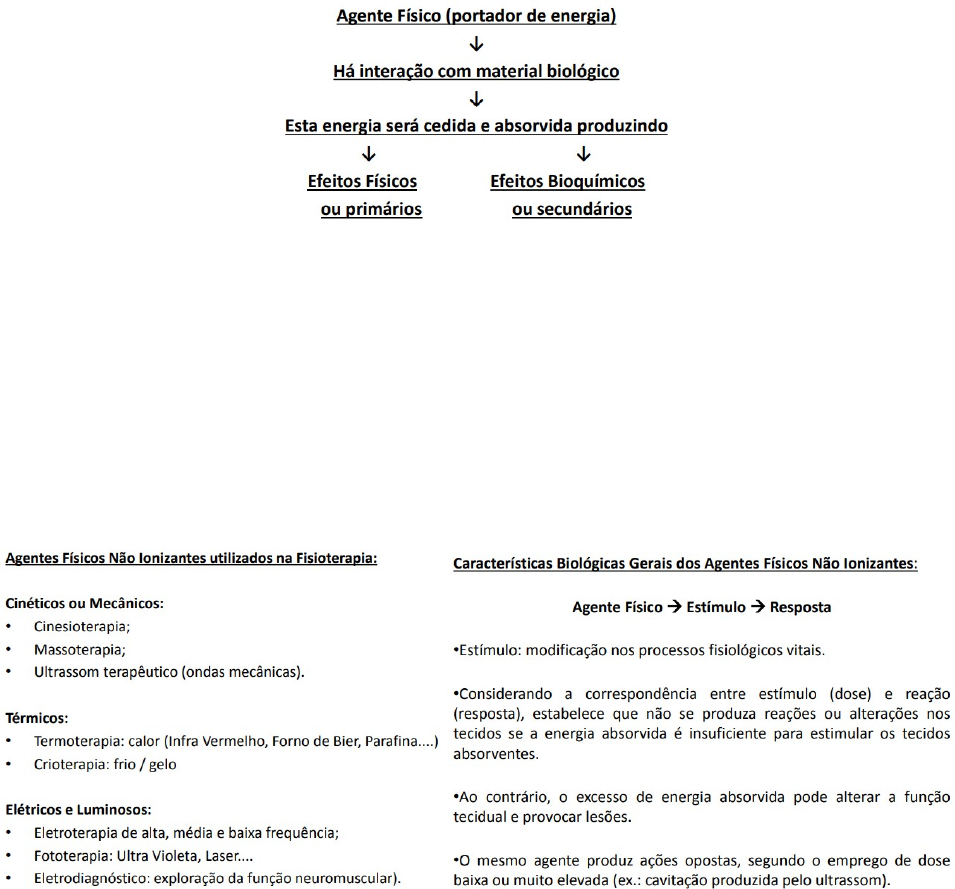 Eletroterapia Agentes físicos · todo o material ou ação empregada para obter uma resposta fisiológica no organismo, que por sua vez, desencadeie um efeito terapêutico. · portador de uma determinada energia (térmica, mecânica, eletromagnética) · Agentes naturais (sol, água, calor, frio, etc.) podem aliviar ou curar. · agentes físicos produzidos artificialmente (eletricidade, ultrassom, micro-ondas, laser, etc.) Tipos de agentes físicos 1. ionizantes: elétrons (-) são deslocados dos átomos e moléculas, este processo pode gerar alterações moleculares capazes de lesar os tecidos biológicos, incluindo efeitos no material genético. Portanto, são aqueles que ao interagirem com a matéria, exemplo: raio-x 2. não ionizantes: empregados na Fisioterapia; trata-se de agentes naturais e artificiais, cuja interação com o material biológico não produz ionização. OBS.: Os agentes físicos ao interagirem com os tecidos orgânico produzirão uma resposta, que posteriormente se evidenciam em nível celular. A intensidade da ação que o agente será empregado poderá ocasionar resultados terapêuticos (ex. analgesia) ou lesivos (queimadura). Conceitos fundamentais de eletricidade Tipos de correntes terapêuticas Ondas (pulsos ou impulsos) CONCEITO: Perturbação que se propaga através de um meio, que se transmite em forma de movimento ondulatório, a uma velocidade constante, característica deste meio Eletroterapia • Utilização de corrente elétrica em um corpo vivo: resolução ou investigação do pleno funcionamento celular: • Agente terapêutico. • Agente de diagnóstico (eletrofisiologia). • Agente produtor de outros agentes físicos (IV, US, Laser). • Base para o entendimento das ações fisiológicas e terapêuticas DOSE: •Quantidade de energia suficiente para estimular o sistema biológico sem saturá-lo ou lesá-lo. •Quais são os valores para conseguir estimular sem lesar? 1. Depende da patologia. 2. Estado geral do paciente (estado evolutivo). 3. Área tratada. 4. Osteossíntese. 5. Infecção. 6. Técnica empregada, etc. •Dose para diferentes técnicas, objetivos ou efeitos fisiológicos: 1. Respostas motoras. 2. Respostas sensitivas. 3. Alterações eletroquímicas. 4. Aplicação energética (influi no metabolismo). Obs.: elevaremos a intensidade até conseguir a resposta pretendida, sempre que o paciente tolere sem risco de queimadura. ELETROESTIMULAÇÃO: · Eletroestimulação com o objetivo: efeito motor, para uma conduta terapêutica em patologia com lesão motora. · Eletroestimulação sobre os nervos sensíveis: analgesia. · Eletroestimulação transcutânea: realizada através da pele, eletrodos de contato. · Estimulação elétrica nervosa transcutânea (transcutaneous electrical nerve stimulatios – TENS). · Estimulação transcutânea de fibras nervosas (sensíveis, motoras e autônomas). · Estimulação elétrica neuromuscular (neuromuscular electrical stimulation – NMES). Toda estimulação é neuromuscular. Ação excitomotora ou efeito motor – contração muscular. · Estimulação elétrica muscular (muscular electrical stimulation – MES). Ativação elétrica das fibras musculares (possível no músculo denervado). · Estimulação elétrica funcional (functional electrical stimulation – FES). Para aprimorar um movimento. Aplicações da Eletroestimulação Muscular (EEM): •Conseguir contração muscular quando esta for impossível de realizar de maneira voluntária. •Recuperar o tônus muscular perdido depois de um longo período de imobilização. •Reforçar a contração muscular voluntária insuficiente. •Potencializar ou melhorar o rendimento de músculos específicos ou a eficácia dos exercícios fisiológicos. •Diminuir a tensão e contratura muscular, assim como a dor por elas produzida. Efeitos Físicos da Corrente Elétrica 1) Calor ao longo do circuito: calor produzido é proporcional a resistência do tecido e ao tempo. 2) Efeito eletromagnético: a corrente elétrica gera um campo eletromagnético. 3) Efeito eletroquímico: produz deslocamento de íons, produzindo diversas reações químicas. Efeitos Fisiológicos da Corrente Elétrica • Ação vasodilatadora: a corrente elétrica impede a secreção de noradrenalina, produzindo vasodilatação passiva. A vasodilatação cutânea é produzida pela liberação de histamina. • Ação simpaticolítica: ocorre por ação das correntes de média frequência quando são aplicadas sobre vísceras ou pontos da cadeia simpática. • Ação ionizante: correntes unidirecionais que produzem aumento da permeabilidade da membrana e eletrólise (íons são atraídos pelo pólo oposto da sua carga). • Efeito excitomotor: resulta do músculo ser um tecido excitável, cuja resposta é a contração. • Efeito analgésico: explicado pela teoria das comportas e ativação/produção de substâncias endógenas (endorfinas). Classificação da Eletroterapia segundo as diferentes frequências •Pode ser dividida em 3 grupos, como base as diferentes frequências: 1. Baixa Frequência (até 1.000 Hz): onde encontra-se a maioria das correntes utilizadas (Galvânica, Farádica, Diadinâmicas, TENS e FES). As frequências utilizadas não ultrapassam os 250 Hz, considerando o alcance biológico. 2. Média Frequência (de 1.000 Hz à 10.000 Hz): no âmbito da Fisioterapia, as frequências empregadas estão na faixa de 2000 Hz à 4000 Hz (Interferencial, Russa). 3. Alta Frequência (10.000 Hz à 100.000 Hz): são ondas eletromagnéticas (Ondas Curtas, Microondas, Ultrassom – sendo uma onda mecânica). Níveis de Estimulação •Estimulação de nível sensível: a partir do nível sub umbral, ou seja, com o aumento da intensidade o indivíduo percebe uma parestesia (formigamento, vibração). •Estimulação no nível motor: conforme se eleva a intensidade, aumenta a sensação parestésica, até aparecer contrações musculares palpáveis. •Estimulaç