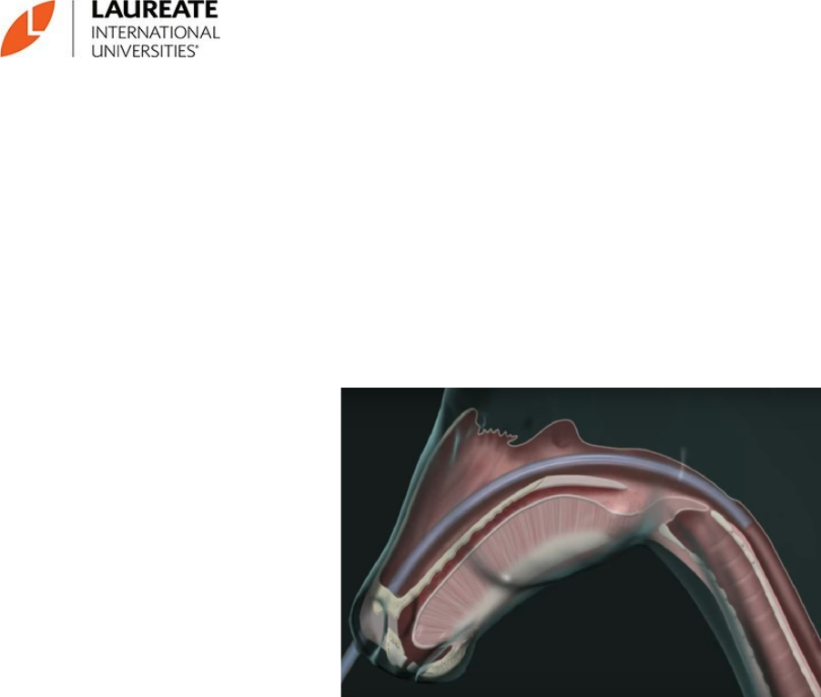 Curso de Medicina Veterinária Disciplina: Corpo Animal 2 a) Caso clínico: Equino com cólica – passagem da sonda nasogástrica Um equino foi atendido no pavilhão de grandes animais com histórico de apatia, inapetência, olhar frequente para o flanco e sudorese intensa. Segundo o tratador ele se alimenta de volumoso e concentrado e toma água normalmente, porém relata que na última semana teve problemas no bebedouro da baia deste animal. O veterinário responsável indica a passagem de uma sonda nasogástrica de modo a avaliar o refluxo de conteúdo e auxiliar na saída de gás, conforme ilustrado na figura abaixo: b) Cite as estruturas presentes no trajeto da sonda nasogástrica e identifique se pertencem ao trato respiratório e digestório. R: Estruturas presentes: Narinas (Pelos e glandulas das fossas nasais), Cornetos, Faringe, Laringe, Traqueia (lençol mucociliar), Etmoide, Esôfago, passa pela cardia e chega ao corpo do estômago. c) A espécie equina apresenta uma particularidade na narina externa em relação as demais espécies. Qual o nome desta estrutura? R: Óstio do divertículo nasal d) Qual região, ilustrada na figura abaixo, pertence ao trato respiratório e digestório? R: Faringe e) Quais estruturas separam as duas cavidades presentes no crânio referentes ao sistema digestório e respiratório? R: Palato Mole (Nasofaringe (Dorsal) E Orofaringe (ventral)). f) Quais ossos formam a estrutura da cavidade que será introduzida a sonda? R: Palato Duro g) Ao introduzir a sonda o veterinário deve cuidar para não lesionar as conchas nasais. O que são, quais são e que funções essas conchas apresentam? R: São dobras chamadas de conchas nasais. Tem como função fazer o ar rotacionar, Cada par é composto por uma concha nasal de cada lado da cavidade nasal, dividas pelo septo nasal. h) O que são meatos e qual meato nasal deve ser ocupado pela sonda? R: Meato nasal é o termo genérico que designa três orifícios nasais. O meato que deve ser ocupado é o meato medio i) Para que a sonda prossiga para o trato digestório e não para via respiratória qual cartilagem laríngea deve se fechar? R: Epiglote j) Qual epitélio da narina externa? Descreva R: É um epitélio pseudoestratificado colunar (ou prismático ou cilíndrico) ciliado com células caliciformes. k) Qual epitélio da região olfatória? Descreva R: O epitélio é pseudoestratificado colunar, constituído pelas células olfatórias, células de sustentação, células em escova e células basais. l) Qual epitélio da região respiratória? Descreva R: epitélio pseudo-estratificado cilíndrico ciliado, com muitas células caliciformes.