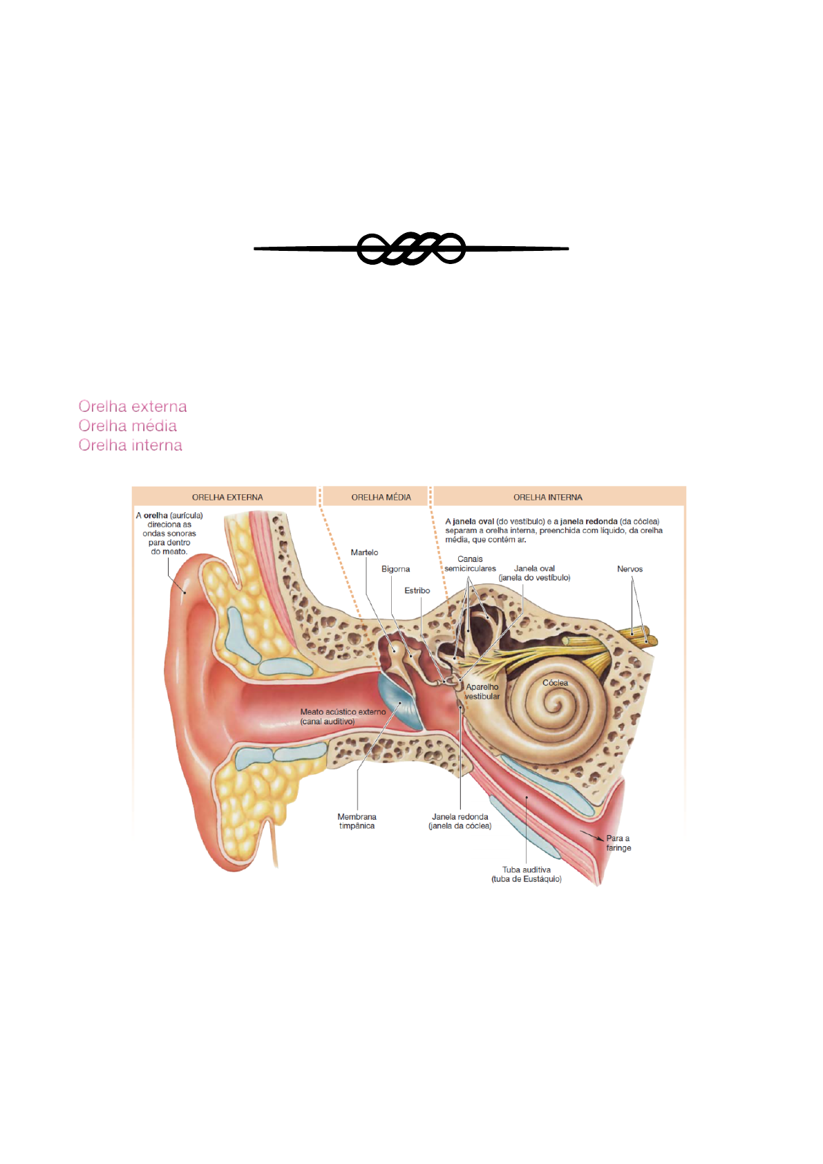 Objetivos Estudar a do órgão auditivo Listar os micro-organismos que afetam o desenvolvimento embrionário Discutir os critérios legais para a autorização do aborto e o impacto do aborto ilegal Audição e equilíbrio A orelha é um órgão sensorial especializado Além de ter a função de traduzir as vibrações sonoras, a orelha também possui receptores para o equilíbrio. Anatomia da orelha Ela é dividida em três principais regiões: Orelha externa - coleta as ondas sonoras e as direciona para dentro; Orelha média - conduz as vibrações sonoras para a janela do vestíbulo; Orelha interna - armazena os receptores para a audição e para o equilíbrio; Orelha externa É formada pela orelha, pelo meato acústico externo e pela membrana timpânica. A orelha é uma aba de cartilagem recoberta por pele. A sua margem é a hélice, a parte inferior é o lóbulo. Ela é ligada à cabeça por ligamentos e músculos. A membrana timpânica ou tímpano é uma fina divisão, semitransparentes que fica entre o meato acústico externo e a orelha média, ela é coberta por epiderme é revestida por um epitélio cúbico simples. Entre as camadas epiteliais encontra-se tecido conjuntivo composto por colágeno, fibras elásticas e fibroblastos. O rompimento da membrana timpânica é chamado de perfuração do tímpano. O meato acústico externo contém alguns pelos e glândulas sudoríferas especializadas chamadas de glândulas ceruminosas, que tem como função, secretar a cera do ouvido (cerume). A junção dos pelos com o cerume ajudam a bloquear a entrada de poeira e objetos estranhos na orelha, além de evitar danos a delicada pele. Em geral, ele desidrata e se desprende do meato. O meato acústico externo é o canal que comunica o ouvido externo ao ouvido médio, se estende pelo interior do crânio até terminar na membrana timpânica. Orelha média É uma pequena cavidade cheia de ar é revestida por epitélio, fica situada na parte Pedrosa do temporal. ( uma caixa estreita de paredes côncavas ) É separada da orelha externa pela membrana timpânica, e da orelha interna por uma divisão óssea fina que contém duas pequenas aberturas, a janela do vestíbulo (oval) e a janela da cóclea ( redonda) nela estão ligados os três menores ossos do corpo que são conectados por articulações sinovial. Os osso não nomeados de acordo com o seu formato: martelo, bigorna e estribo. O cabo do martelo se inseri na membrana timpânica. A cabeça do martelo se articula com o corpo da bigorna. O processo lenticular da bigorna se articula com a cabeça do estribo. A base do estribo se encaixa na janela oval. Além dos ligamentos, dois pequenos músculos esqueléticos também se ligam aos ossículos. O músculo tensor do tímpano É inervado pelo ramo mandibular do nervo trigêmeo, limita o movimento e aumenta a tensão da membrana timpânica evitando danos à orelha interna por cinta de altos barulhos e auxilia na mobilidade do martelo. O músculo estapédio, inervado pelo nervo facial é o menor músculo esquelético do corpo humano. Auxilia na movimentação do estribo junto da janela do vestíbulo evitando grandes vibrações, e também diminui a sensibilidade auditiva. A paralisia do músculo estapédio está associada a hiperacusia, que é uma audição sensível de maneira anormal. Não pode proteger de sons curtos, como o de um tiro. Tuba auditiva - contendo osso e cartilagem, ela se conecta a orelha média com a parte nasal da faringe ou nasofaringe. Ela normalmente se encontra fechada em sua extremidade medial. Ela se abre durante a deglutição e o bocejo permitindo que o ar entre ou saia da orelha média fazendo que a pressão nela se iguale a do ambiente. Quando a pressão está balanceada, a membrana timpânica vibra livremente conforme as ondas sonoras chegam nelas. Se a pressão não estiver equilibrada pode ocorre dor intensa, prejuízo auditivo, zumbidos e vertigem. Orelha interna Possui duas estruturas sensoriais: cóclea (responsável pela audição) e aparelho vestibular juntamente com os canais semicirculares ( responsáveis pelo equilíbrio). Labirinto ósseo é o conjunto da cóclea, do vestíbulo e dos canais semicirculares. Ele está incrustado no osso temporal A cóclea possui 3 tubos espiralados ao redor do modíolo (centro ósseo) 2,5 voltas ao redor do medíolo A cóclea é constituída por 3 canalículos enrolados em torno dum eixo ósseo, o modíolo. estes canalículos são: a rampa timpânica (3), a rampa vestibular (2) e o canal coclear (1). A rampa timpânica e a rampa vestibular estão cheias de périfnfa (azul) e comunicam entre si por um pequeno orifício localizado no àpex da cóclea e designado helicotrema. O canal coclear, de forma triangular, situa-se entre as rampas vestibular e timpânica e contém endolinfa (verde) rico em k+ .Entre o canal coclear e a rampa timpânica situa-se o órgão espiral (de Corti). Os elementos nervosos (representados a amarelo no esquema) são o gânglio espiral (coclear) (4) e nervo auditivo (5) no centro do modíolo. O ducto coclear possui uma extremidade cega, não comunica nem com a rampa do vestíbulo, nem com a rampa do tímpano Transdução A vibração vinda do estribo se propaga para frente, pela janela oval em direção a rampa do vestíbulo, a onda vai subir em direção ao helicotrema (encontro da rampa do vestíbulo e da rampa do tímpano) e descer pela rampa do tímpano indo até a janela redonda fazendo com que ela se projete para fora na orelha média. As ondas de pressão atravessam através da perilinfa da rampa do vestíbulo, passam então para a membrana vestibular e se movem para a endolinfa dentro do ducto coclear. As ondas de pressão na endolinfa fazem com que as membranas basilares vibrem, fazendo com que as células ciliadas do órgão espiral se movam contra a membrana tectória. Isso promove o dobramento dos estereocílios e leva em última análise à geração de impulsos nervosos nos neurônios de p