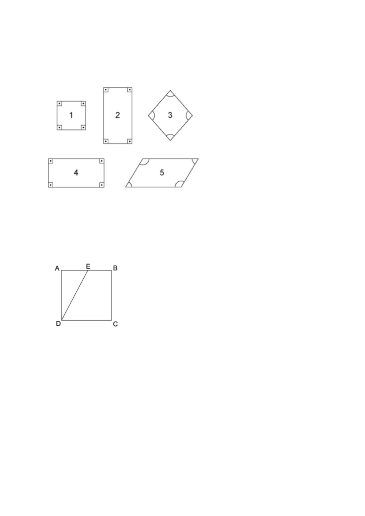 Atividade- Quadriláteros 01) Veja os desenhos abaixo. Indique os desenhos que representam retângulos. 02) No quadrado ABCD, traçou-se o segmento DE, conforme indicado na figura: O nome do polígono EBCD é: A) Losango B) Retângulo C) Triângulo D) Trapézio E) N.D.A 03) Observe o desenho em cinza na malha quadriculada abaixo. Esse desenho é um: A) Losango. B) Paralelogramo. C) Quadrado. D) Retângulo. E) Trapézio. 04) Observe os quadriláteros abaixo. Qual dos quadriláteros representa um losango? 05) Qual o valor de x na figura abaixo? 06) Observe de novo o esquema do azulejo. Completa a frase seguinte, assinalando a alternativa correta. O segmento de reta AH é paralelo ao… A) Segmento de reta DE. B) Segmento de reta BH. C) Segmento de reta GF. D) Segmento de reta BC. E) Segmento de reta BD