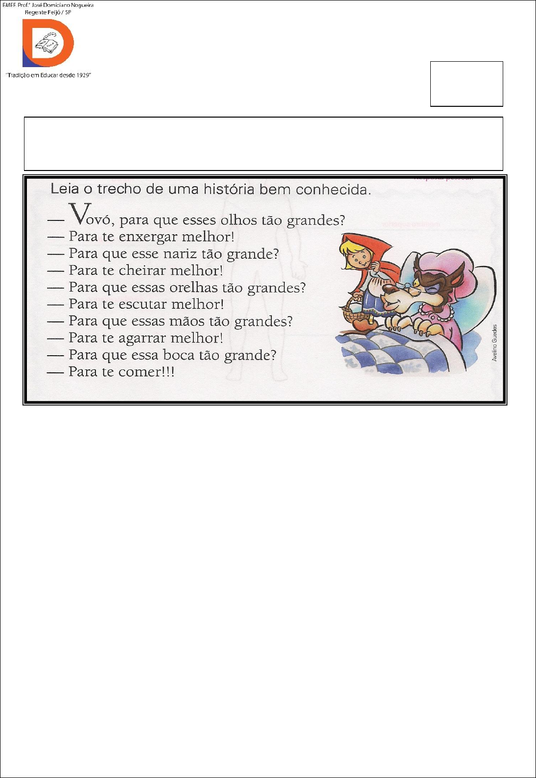 EMEF “PROF. JOSÉ DOMICIANO NOGUEIRA” 2º ANO ____ DATA: ___/___/____ 2º BIMESTRE NOME:____________________________________________________ ATIVIDADE AVALIATIVA DE CIÊNCIAS NO TRECHO ACIMA, QUANDO O LOBO MAU, DISFARÇADO DE VOVOZINHA, RESPONDE A TODAS AS PERGUNTAS DE CHAPEUZINHO VERMELHO, ELE SE REFERE ÀS FUNÇÕES DOS ÓRGÃOS DOS SENTIDOS. A PARTIR DELE RESPONDA AS QUESTÕES ABAIXO: 1) QUE PARTE DO CORPO O LOBO UTILIZOU PARA: ENXERGAR? _________________________________________________ CHEIRAR? __________________________________________________ ESCUTAR?__________________________________________________ 2) LIGUE OS NOMES DOS ÓRGÃOS ÀS SUAS FUNÇÕES: OLHOS SINTO CALOR E FRIO NARIZ POSSO CHEIRAR LÍNGUA E BOCA POSSO VER OUVIDO POSSO OUVIR MÃOS E PELE SINTO GOSTO E SABOR CRITÉRIOS AVALIATIVOS: Reconhece os órgãos dos sentidos e suas funções, seja por meio de imagens ou interpretação de texto. NOTA: 3) ZEZINHO COME A TORTA. ELE SENTE O GOSTO DA TORTA COM QUE ÓRGÃO? PINTE DE VERMELHO. 4) ESCREVA OS NOMES DE TRÊS ALIMENTOS SAUDÁVEIS QUE VOCÊ COSTUMA COMER: ___________________________________________ ___________________________________________ ______________________________________________ 5) LEIA AS FRASES E FAÇA (X) NAS ALTERNATIVAS CORRETAS: ( ) UMA ALIMENTAÇÃO SAUDÁVEL CONTÊM MUITOS DOCES ( ) É IMPORTANTE COMER ALIMENTOS FRITOS TODOS OS DIAS ( ) AS FRUTAS CONTÊM MUITAS VITAMINAS ( ) LEITE SÓ É SAUDÁVEL COM MUITO CHOCOLATE ( ) BATATA ASSADA OU COZIDA É MAIS SAUDÁVEL QUE FRITA ( ) PESSOAS QUE NÃO SE ALIMENTAM CORRETAMENTE PODEM FICAR DOENTES ( ) DEVEMOS COMER MUITO PARA PODER ENGORDAR ( ) NO CAFÉ DA MANHÃ NÃO PODE FALTAR BISCOITO RECHEADO ( ) NOSSA ALIMENTAÇÃO DEVE CONTER FRUTAS, LEGUMES E VERDURAS ( ) O ARROZ E O FEIJÃO DEVEM SER SUBSTITUÍDOS POR PIZZA E HAMBURGUER. ( ) PARA MANTERMOS UMA ALIMENTAÇÃO SAUDÁVEL É IMPORTANTE EVITAR O EXCESSO DE DOCES, GORDURAS E REFRIGERANTES 6) FAÇA UMA LISTA DE COISAS QUE PODEM SER RECICLADAS: 7) ESCREVA AS PARTES DE UMA PLANTA NOS LUGARES INDICADOS RAIZ FRUTOS CAULE FOLHAS FLORES 8) PINTE COM A COR ADEQUADA 9) PINTE OS RECIPIENTE DE RECICLAGEM COM A COR ADEQUADA