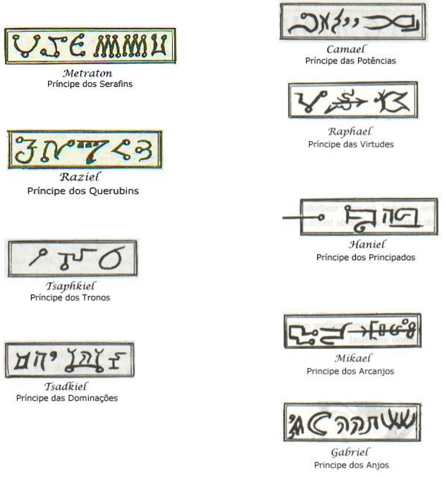 Assinatura Dos Anjos.., Os egípcios da época faraônica consagraram Anubis como o Guardião das Forças Celestes. Os cabalistas aprimoraram os sinais e hieroglífos deixados nas escrituras sagradas e no interior das pirâmides e estabeleceram o que chamamos de "Assinaturas", que servem de proteção por serem dotadas de efeitos benéficos. Uma proteção invisível contra qualquer risco proveniente do exterior - tanto mental, moral, como psíquico. Por essa razão, é aconselhável colocar a assinatura do anjo na porta de entrada de casa ou estabelecimento comercial. Copie a imagem da assinatura correspondente ao seu príncipe. Escolha um lugar para colocá-lo na porta de entrada de sua casa ou então, guarde-o sempre próximo a você dentro de um saquinho vermelho. Você pode também utilizar-se da força dos nomes dos anjos guardiões, agindo da mesma maneira. Escreva o nome de seu anjo e os de todas as pessoas que moram em sua casa. Coloque-os no batente interno da porta de entrada. Utilizando sua varinha de condão - seu dedo mediano -, escreva simbolicamente, em cima da porta, o nome de seu anjo guardião. Angeologia Prof. Eduardo S Bigaton