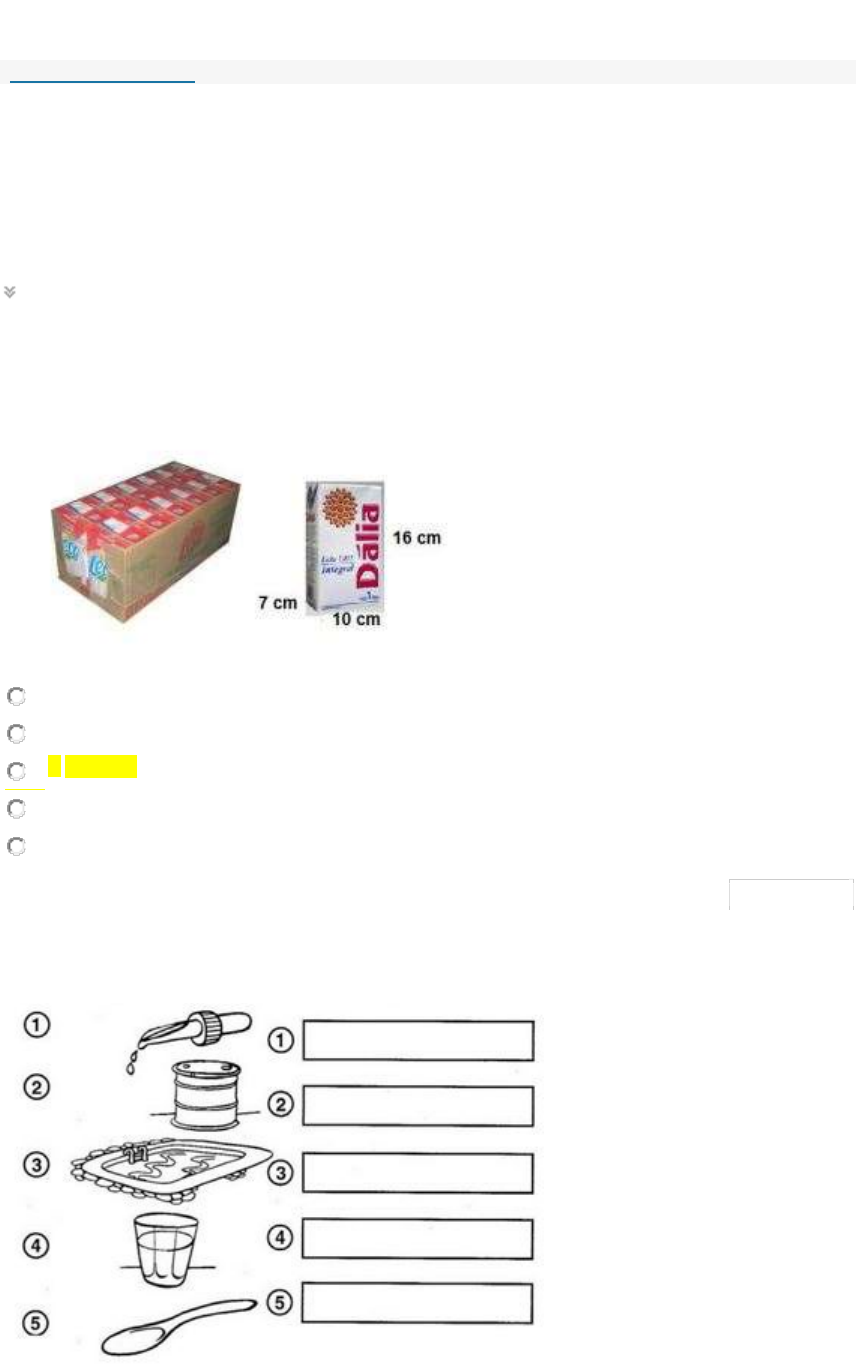 Fazer teste: AS V – Metod de Ensino – todas corretas Informações do teste Descrição Instruções Várias tentativas Este teste permite 3 tentativas. Esta é a tentativa número 1. Forçar conclusão Uma vez iniciado, este Teste deve ser concluído em uma sessão. Não saia do teste antes de clicar em Salvar e enviar. Suas respostas foram salvas automaticamente. Estado de Conclusão da Pergunta: PERGUNTA 1 1. As embalagens de leite têm a forma de um bloco retangular. As medidas usuais desta embalagem estão representadas na figura abaixo. Qual o volume, em m³, de uma caixa que armazena 12 caixas de leite? a. 3,44 m³ b. 1 344 m³ c. 13,44 m³ d. 1,3 m³ e. 134,4 m³ 0,175 pontos PERGUNTA 2 1. Qual a unidade de medida mais adequada para medir líquidos, o litro ou o mililitro? a. 1 – mililitro 2 – litro 3 – litro 4 – mililitro 5 - mililitro b. 1 – litro 2 – mililitro 3 – litro 4 – mililitro 5 - mililitro c. 1 – litro 2 – mililitro 3 – litro 4 – litro 5 - litro d. 1 – litro 2 – mililitro 3 – mililitro 4 – litro 5 - litro e. 1 – litro 2 – litro 3 – litro 4 – litro 5 - litro 0,175 pontos PERGUNTA 3 1. (UFG 2010) Leia o texto a seguir. Era uma laje retangular enorme, uma brutidão de mármore rugoso […].É a mãe da pedra, não disse que era o pai da pedra, sim a mãe, talvez porque viesse das profundas, ainda maculada pelo barro da matriz, mãe gigantesca sobre a qual poderiam deitar-se quantos homens, ou ela esmagá-los a eles, quantos, faça as contas quem quiser, que a laje tem de comprimento trinta e cinco palmos, de largura quinze, e a espessura é de quatro palmos, e, para ser completa a notícia, depois de lavrada e polida, lá em Mafra, ficará só um pouco mais pequena, trinta e dois palmos, catorze, três, pela mesma ordem e partes, e quando um dia se acabarem palmos e pés por se terem achado metros na terra, irão outros homens a tirar outras medidas [...].SARAMAGO, José. Memorial do convento. 17. ed. Rio de Janeiro: Bertrand Brasil, 1996. p. 244-245.No romance citado, Saramago descreve a construção do Palácio e Convento de Mafra (séc. XVIII), em Portugal, no qual a laje (em forma de paralelepípedo retângulo) foi colocada na varanda da casa de Benedictione. Supondo que a medida de um palmo seja 20 cm, então o volume retirado do mármore, após ser polido e lavrado, em m3, foi de: a. 0,024 b. 16,800 c. 10,752 d. 6,048 e. 60,480 0,175 pontos PERGUNTA 4 1. Considerando o cubo como uma unidade de volume, podemos afirmar que: a. (I) e (II) têm mesmo volume. b. Todos têm o mesmo volume. c. Dois deles têm o mesmo volume. d. Três deles têm o mesmo volume. e. Todos têm volume diferente. 0,175 pontos Clique em Salvar e Enviar para salvar e enviar. Clique em Salvar todas as respostas para salvar todas as respostas. Curso METODOLOGIA DE ENSINO DE MATEMÁTICA: NÚMEROS, OPERAÇÕES, GRANDEZAS E MEDIDAS - 80h_Turma_01_092020 Teste <font class="click">AS V</font> Iniciado 15/09/20 14:52 Enviado 15/09/20 14:57 Status Completada Resultado da tentativa 0,7 em 0,7 pontos Tempo decorrido 5 minutos Pergunta 1 0,175 em 0,175 pontos As embalagens de leite têm a forma de um bloco retangular. As medidas usuais desta embalagem estão representadas na figura abaixo. Qual o volume, em m³, de uma caixa que armazena 12 caixas de leite? Pergunta 2 0,175 em 0,175 pontos Qual a unidade de medida mais adequada para medir líquidos, o litro ou o mililitro? Pergunta 3 0,175 em 0,175 pontos (UFG 2010) Leia o texto a seguir. Era uma laje retangular enorme, uma brutidão de mármore rugoso […].É a mãe da pedra, não disse que era o pai da pedra, sim a mãe, talvez porque viesse das profundas, ainda maculada pelo barro da matriz, mãe gigantesca sobre a qual poderiam deitar-se quantos homens, ou ela esmagá-los a eles, quantos, faça as contas quem quiser, que a laje tem de comprimento trinta e cinco palmos, de largura quinze, e a espessura é de quatro palmos, e, para ser completa a notícia, depois de lavrada e polida, lá em Mafra, ficará só um pouco mais pequena, trinta e dois palmos, catorze, três, pela mesma ordem e partes, e quando um dia se acabarem palmos e pés por se terem achado metros na terra, irão outros homens a tirar outras medidas [...].SARAMAGO, José. Memorial do convento. 17. ed. Rio de Janeiro: Bertrand Brasil, 1996. p. 244-245.No romance citado, Saramago descreve a construção do Palácio e Convento de Mafra (séc. XVIII), em Portugal, no qual a laje (em forma de paralelepípedo retângulo) foi colocada na varanda da casa de Benedictione. Supondo que a medida de um palmo seja 20 cm, então o volume retirado do mármore, após ser polido e lavrado, em m3, foi de: Pergunta 4 0,175 em 0,175 pontos Considerando o cubo como uma unidade de volume, podemos afirmar que: Terça-feira, 15 de Setembro de 2020 14h57min33s BRT