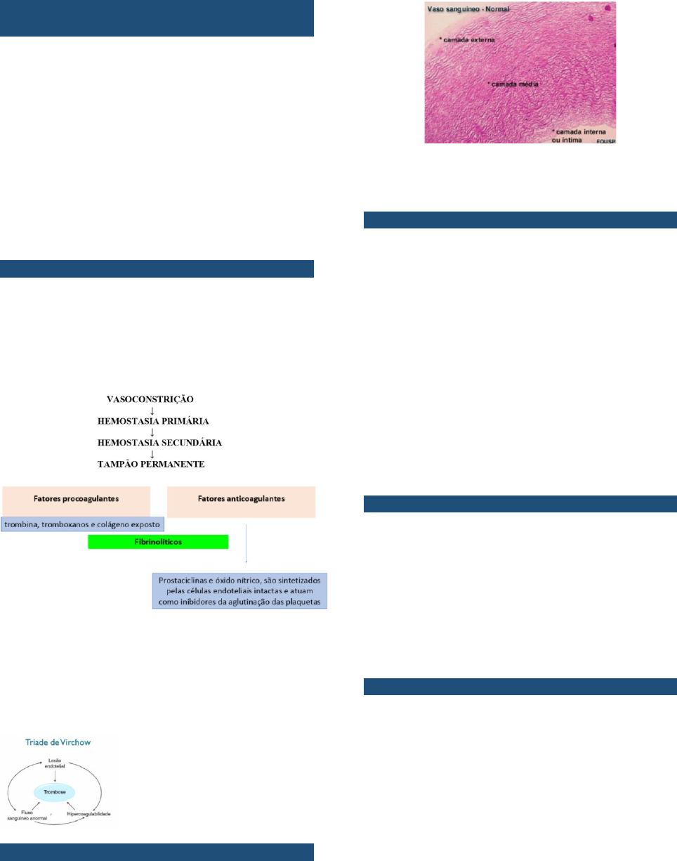 MECANISMO GERAL DE AÇÃO DOS FÁRMACOS QUE ATUAM NA COAGULAÇÃO SANGÜÍNEAAntiagregante plaquetario FARMACOLOGIA · São fármacos úteis no tratamento dos distúrbios da hemostasia. · Atuam inibindo a formação ou destruindo trombos e êmbolos. · Os distúrbios trombóticos incluem infarto agudo do miocárdio (IAM), trombose venosa profunda (TVP), embolia pulmonar (EP) e acidente vascular encefálico isquêmico agudo. Essas condições são tratadas com anticoagulantes e fibrinolíticos. HEMOSTASIA Processo em que ocorre a formação de tampão sólido no sangue para bloquear rupturas do vaso sangüíneo evitando hemorragias. Etapas: Rudolph Virchow propôs que uma tríade de eventos que seria necessária para a formação de um trombo: anormalidades na parede do vaso acompanhadas de alterações no fluxo e nos componentes sanguíneos. COMPONENTES · Parede vascular · Plaquetas · Fatores da coagulação (plasmáticos) CAMADA ÍNTIMA O ENDOTÉLIO apresenta propriedades antiplaquetárias, anticoagulantes e fibrinolíticas. Fatores liberados: · PROSTACICLINA · OXIDO NÍTRICO · ATIVADORES DO PLASMINOGÊNIO – Dando origem a plasmina. Endotélio lesado · Atividade: Protrombótica · Fator liberado: VON WILLEBRAND CAMADA MÉDIA Fibras colágenas – Ativação de Fatores plasmáticos da Coagulação. Células musculares lisas - Agentes vasoconstrictores: · Serotonina · Adrenalina e noradrenalina · Tromboxano A2 CAMADA ADVENTÍCIA Tecido conjuntivo e vasos sanguíneos nutrientes. PLAQUETAS Quando ocorre uma lesão endotelial, as plaquetas ficam expostas à matriz extracelular na parede vascular e assim desencadeiam uma cascata hemostática. Eventos Plaquetários: · Adesão plaquetária; · Reação de liberação; · Agregação plaquetária. FATORES PLASMÁTICOS DA COAGULAÇÃO · Síntese: Fígado Dependência da Vitamina K · Teoria clássica da coagulação sanguínea (1904) Foi proposto para explicar a fisiologia da coagulação do sangue, segundo o qual a coagulação ocorre por meio de ativação proteolítica sequencial de pró-enzimas por proteases do plasma, resultando na formação de trombina que, então, quebra a molécula de fibrinogênio em monômeros de fibrina. Divide a coagulação em uma via extrínseca (envolvendo elementos do sangue e também elementos que usualmente não estão presentes no espaço intravascular) e uma via intrínseca (iniciada por componentes presentes no espaço intravascular), que convergem para uma via comum FIBRINÓLISE PLASMINOGÊNIO - Sintetizado no fígado, medula óssea e rins PLASMINA cliva fibrinogênio e fibrina, dando origem aos produtos de degradação da fibrina FÁRMACOS QUE AGEM NA COAGULAÇÃO Inibem o desenvolvimento e o aumento do tamanho dos coágulos através de suas ações sob a fase de coagulação. Podem interferir na agregação plaquetária, na síntese ou degradação da Fibrina. Utilização clínica: · Síndromes coronárias agudas · Tromboembolismo venoso · Tromboembolismo pulmonar · Profilaxia de eventos trombóticos Antiplaquetários: · Impedem a agregação das plaquetas · inibem a cicloxigenase-1 (COX-1) ou bloqueiam os receptores de GP IIb/IIIa ou ADP. · Profilaxia de trombos Ex: Ácido acetil salicílico–ASS- INIBIÇÃO DE COX Ticlopidina- inibindo irreversivelmente a ligação ADP aos seus receptores nas plaquetas, inibindo assim a ativação do GPIIb/III Clopidogrel- Pro-fármaco- inibe, seletivamente, a ligação da adenosina difosfato (ADP) ao seu receptor plaquetário P2Y12 e, subsequente, ativação do complexo glicoproteíco GPIIb/III. Abciximabe- Bloqueio do do complexo glicoproteíco GPIIb/III. Eptifibatida e Tirofiana-Bloqueio do do complexo glicoproteíco GPIIb/III. FÁRMACOS ANTIAGREGANTES PLAQUETÁRIOS ÁCIDO ACETIL SALICÍLICO (AAS) Utilizado na clínica como antipirético, antiinflamatório, analgésico, antiplaquetário, entre outros. O AAS faz parte do grupo farmacológico denominado AINES (antiinflamatórios não esteroidais). Na plaqueta a COX promove a conversão do Ácido Aracdônico em Tromboxano A2. O AAS se liga e inibe a COX como todos os AINES. Entretanto, os AINES se ligam de uma forma reversível e o AAS se liga de forma irreversível, ou seja, seu efeito só cessa quando a COX for metabolizada. Inibe a síntese de tromboxano A2 Uso na clínica: 500 mg/3 x ao dia. Como antiplaquetário deve ser utilizado em doses baixas de 100 a 325 mg/dia (equivalente a um comprimido infantil). Dessa maneira, permite a prevenção primária das doenças cardiovasculares de pacientes com fatores de risco e também prevenção secundária. ÁCIDO ACETIL SALICÍLICO: Efeitos Adversos: Desconforto epigástrico – náuseas - vômitos – em infecções virais pode provocar em crianças < 2 anos a Síndrome de Reye, que consiste em hepatite fulminante associada a edema cerebral que pode levar ao óbito. (Usar em crianças o paracetamol). A aspirina é absorvida principalmente no meio ácido do estômago. Não pode utilizar em pacientes hemofílicos ou que usam heparina ou anticoagulantes orais _ hemorragias. Para a restauração da agregação plaquetária é necessária a produção de novas plaquetas contend nova cicloxigenase. Devido a possibilidade da trombocitopenia e risco de hemorragia, não devem ser administrados a pacientes que estejam com a suspeita da doença Dengue. Contra-indicados também: · Pelos efeitos anticoagulantes · Terapia anticoagulante · Alterações na coagulação (hemofilia, PLAQUETOPENIA, deficiência vitamina K) · Cirurgias · Pelos efeitos sobre aparelho GI · Úlcera péptica · Gastrite ou sangramento gastrintestinal FÁRMACOS ANTICOAGULANTES · Varfarina (antagonista de vit K) · Heparina (Indireto da trombina) · Dabigatrana (inibidor direto da trombina) · Fondaparinux (Inibidor seletivo do Fator Xa) · Rivaroxabana age inibindo a ação do fator de coagulação Xa · Lepirudina (inibidor direto da trombina) VARFARINA · Anticoagulante Oral · An